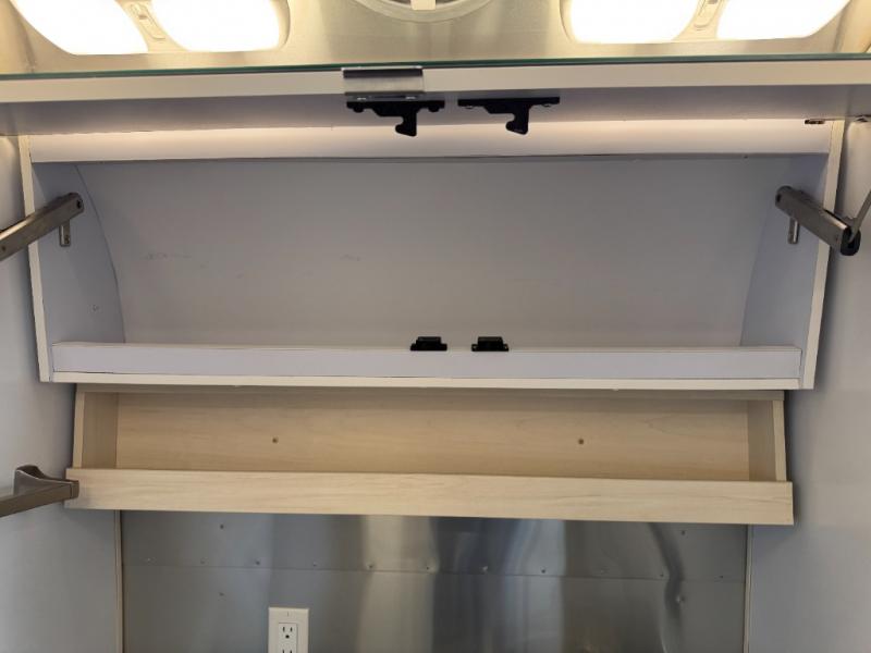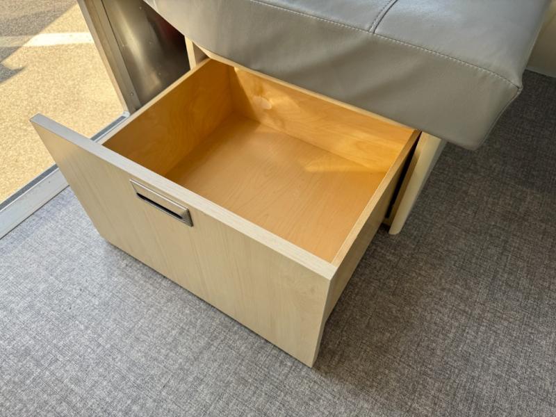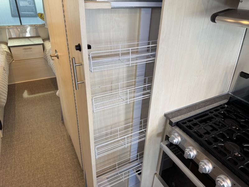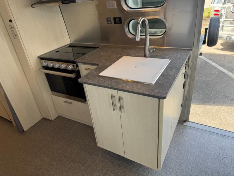 With each Flying Cloud travel trailer by Airstream, there are two axles, and each is built for ease of towing, plus there is a rear-view camera to make reversing and parking easier, and stainless steel front stone guards to protect the lower segments from road debris. The iconic Airstream design is created outside and inside by the semi-monocoque aluminum superstructure, the temperature reducing one-piece white aluminum roof, the panoramic front windows, and the stylish aluminum wheels. The interior will have you feeling right at home with handcrafted cabinetry, plenty of storage and counter space, sleek roller blinds and blackout curtains, plus residential style faucets!