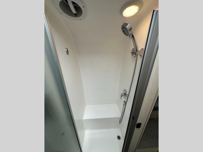 With each Flying Cloud travel trailer by Airstream, there are two axles, and each is built for ease of towing, plus there is a rear-view camera to make reversing and parking easier, and stainless steel front stone guards to protect the lower segments from road debris. The iconic Airstream design is created outside and inside by the semi-monocoque aluminum superstructure, the temperature reducing one-piece white aluminum roof, the panoramic front windows, and the stylish aluminum wheels. The interior will have you feeling right at home with handcrafted cabinetry, plenty of storage and counter space, sleek roller blinds and blackout curtains, plus residential style faucets!