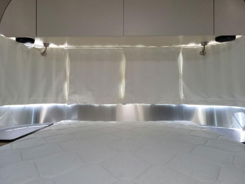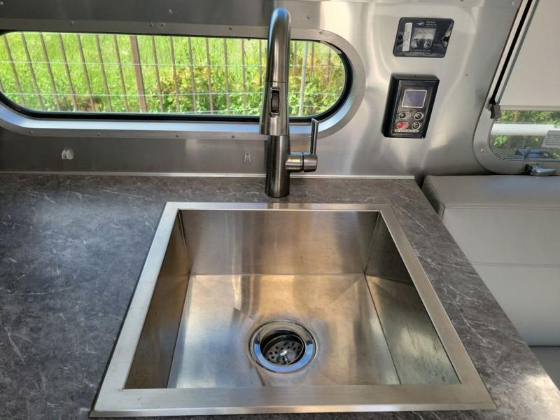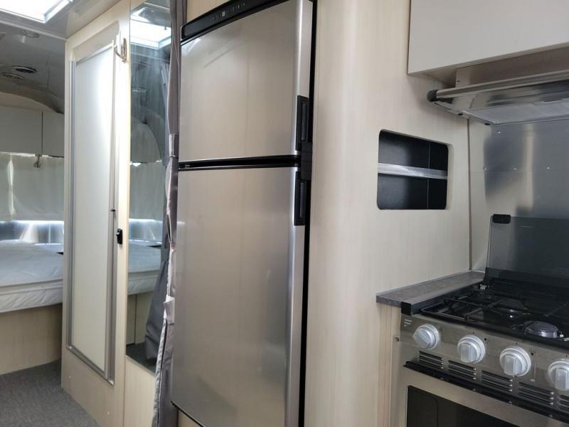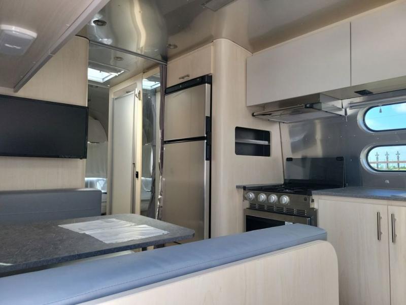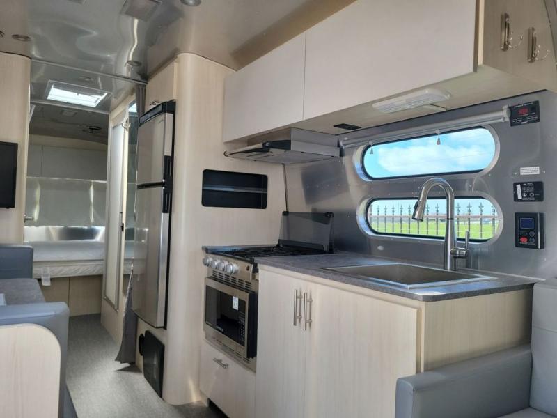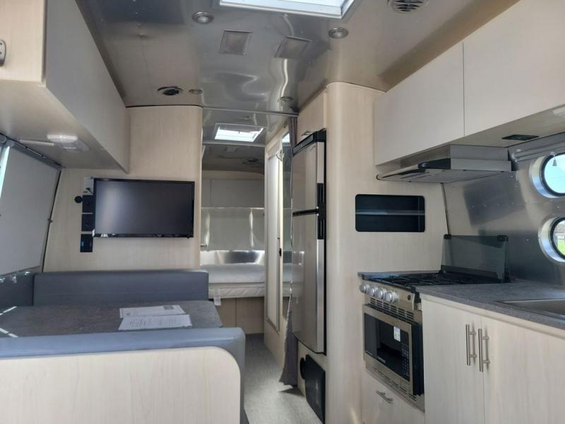 With each Flying Cloud travel trailer by Airstream, there are two axles, and each is built for ease of towing, plus there is a rear-view camera to make reversing and parking easier, and stainless steel front stone guards to protect the lower segments from road debris. The iconic Airstream design is created outside and inside by the semi-monocoque aluminum superstructure, the temperature reducing one-piece white aluminum roof, the panoramic front windows, and the stylish aluminum wheels. The interior will have you feeling right at home with handcrafted cabinetry, plenty of storage and counter space, sleek roller blinds and blackout curtains, plus residential style faucets!