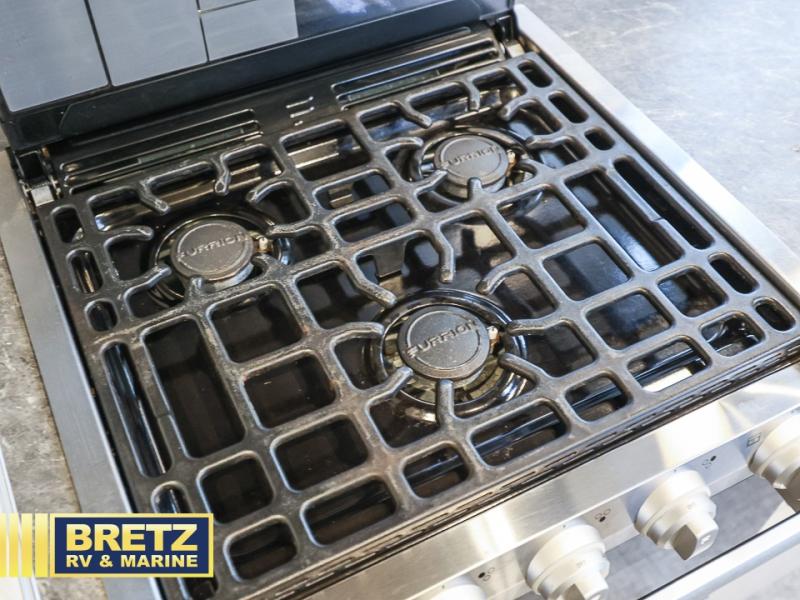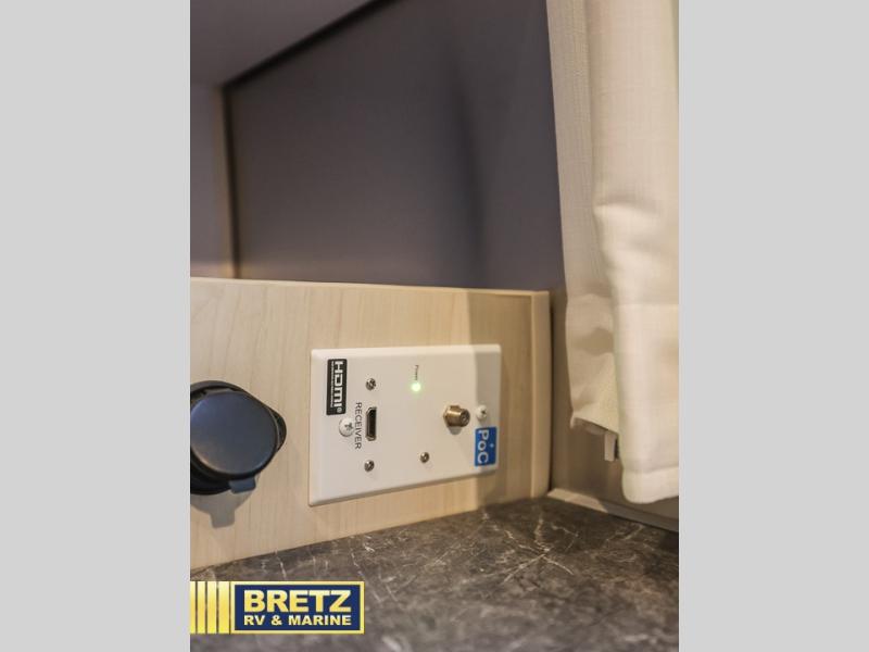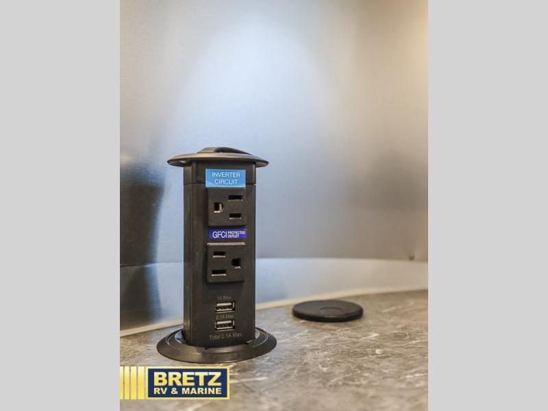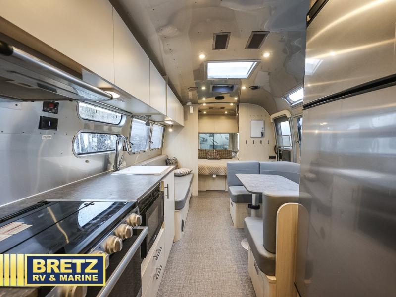 With each Flying Cloud travel trailer by Airstream, there are two axles, and each is built for ease of towing, plus there is a rear-view camera to make reversing and parking easier, and stainless steel front stone guards to protect the lower segments from road debris. The iconic Airstream design is created outside and inside by the semi-monocoque aluminum superstructure, the temperature reducing one-piece white aluminum roof, the panoramic front windows, and the stylish aluminum wheels. The interior will have you feeling right at home with handcrafted cabinetry, plenty of storage and counter space, sleek roller blinds and blackout curtains, plus residential style faucets!