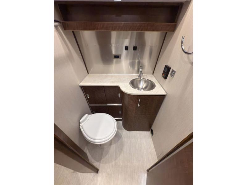 You will find comfort and luxury all throughout this travel trailer! From the front queen bed with an AdaptaFlex memory foam mattress, nightstands on either side, and an LG LED TV to the rear L-shaped lounge that you can enjoy your meals at and convert into an extra sleeping space. The separated bathroom has a private toilet and vanity together across from an independent shower with a seat to freshen up each morning. You can prepare your best meals in the ultra-modern kitchen with the stainless steel three burner cooktop, the oven, the deep stainless steel Moen sink, and the DuPont Corian countertops will be easy to clean, plus they have multifunctional storage bins that are flush to the surface behind the sink.
