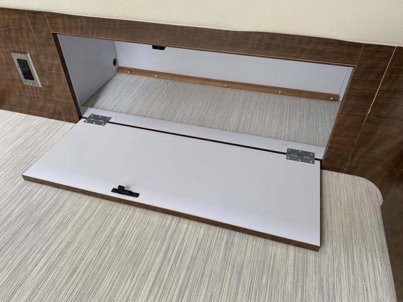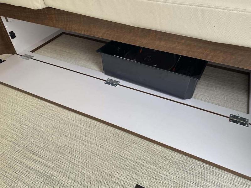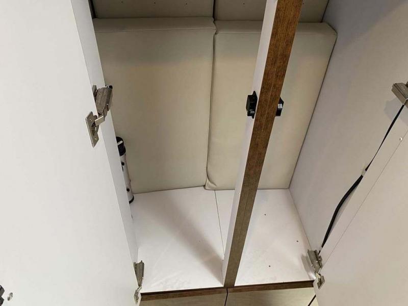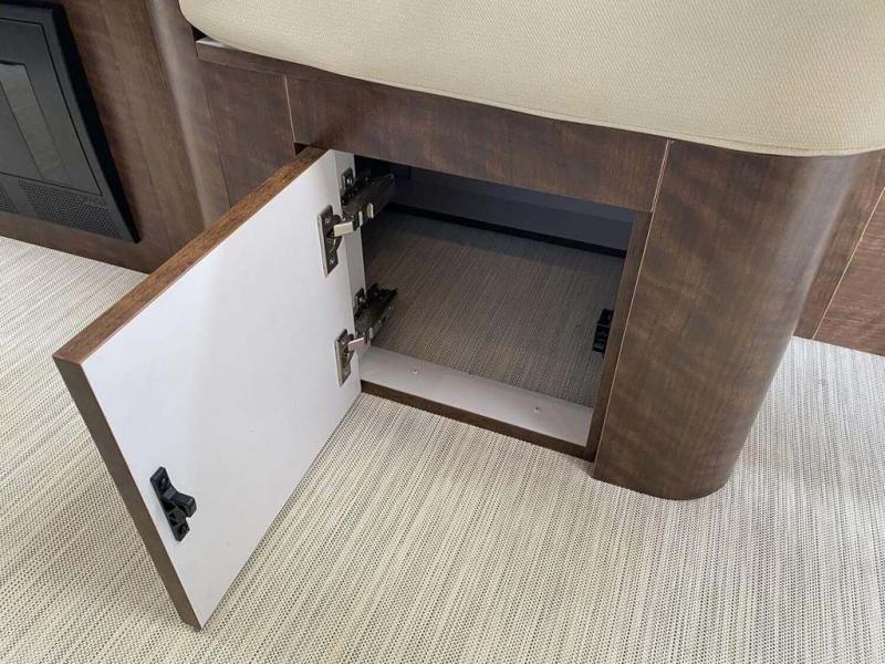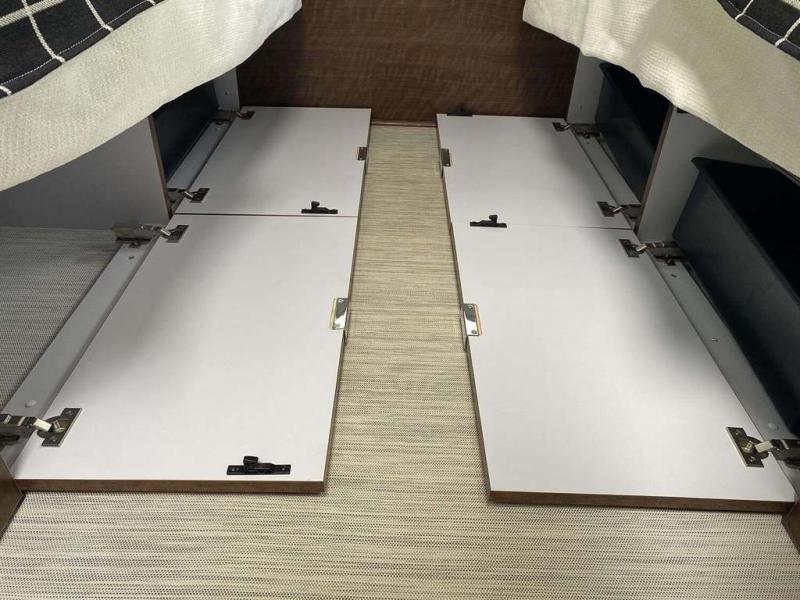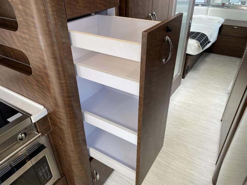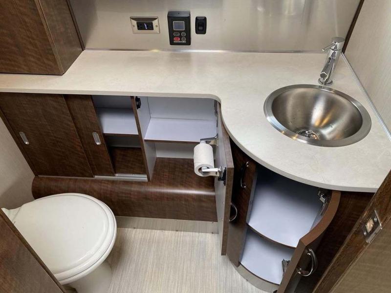 Start traveling the country in true luxury with this travel trailer! It features a front wrap around lounge with stain resistant Spradling Hitch fabric that can be pulled out and the table lowered to create a 38" x 78" bed. A separated bathroom makes it easy for one person to freshen up in the shower with a seat while another is across the way utilizing the private toilet and vanity. The rear queen bed has an AdaptaFlex memory foam mattress to enjoy a good night's rest, nightstands to set your glass of water, and an HD 12V TV to watch your favorite movie in bed. You will find plenty of storage throughout between the upper and lower kitchen cabinets, a slide-out pantry, multifunctional storage bins that are flush to the surface behind the deep stainless steel Moen sink, under-the-bed storage, and a closet to hang your clothes.