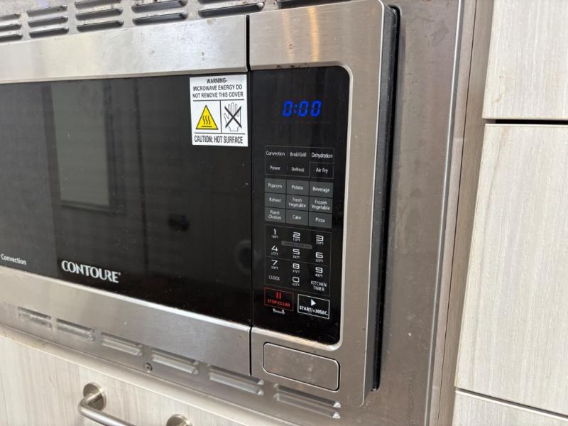 - Kitchen includes three-burner cooktop, stainless steel sink, microwave, and 8 cu. ft. refrigerator