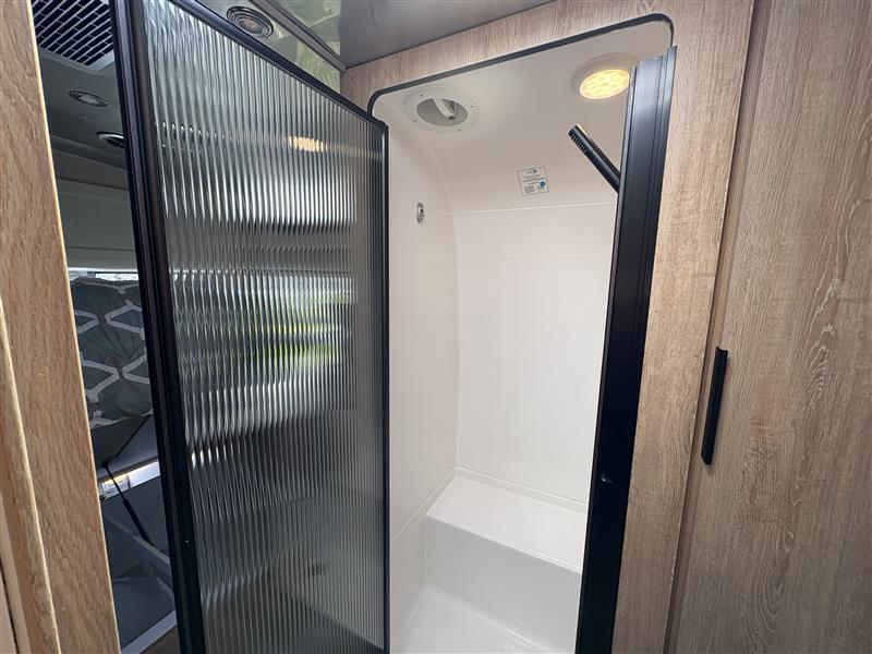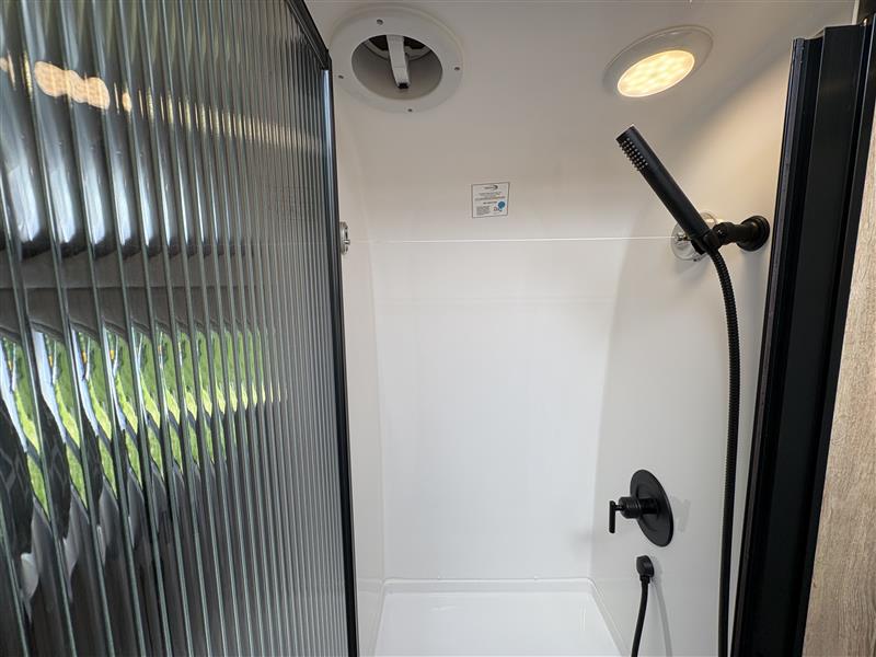You will be astounded by this design-focused Pottery Barn Special Edition travel trailer! The ready-to-camp accessories make this trailer extremely functional. Some of those features are the Pottery Barn 16-piece dinnerware set, 20-piece flatware set, 4-piece set of marble cheese knives, folding bistro table, and set of two folding chairs. The Fusion touchscreen stereo with surround sound and subwoofer will help you set the mood for relaxing, and the Pottery Barn colossal handknit throw will help you cozy up on the couch. In the private bedroom, you'll find canvas storage bins that you can use to keep all of your belongings easily accessible, LED reading lights, a wardrobe with hanging bar, blackout pleated curtains for the panoramic windows, and an LED HDTV for entertainment. The residential bathroom is quite impressive with its sconce lighting, removable Moen handheld shower head, reeded glass shower door, retractable clothes line, and round mirror with two-shelf medicine cabinet.
