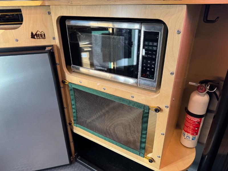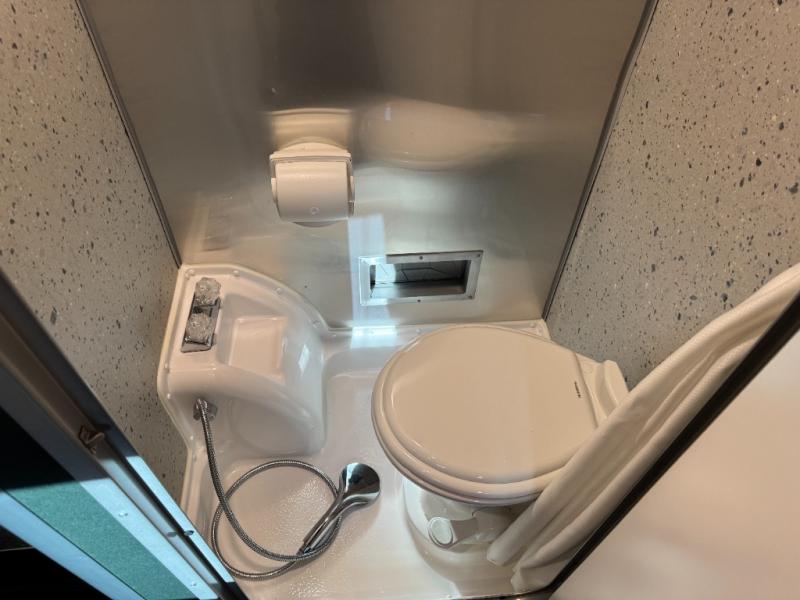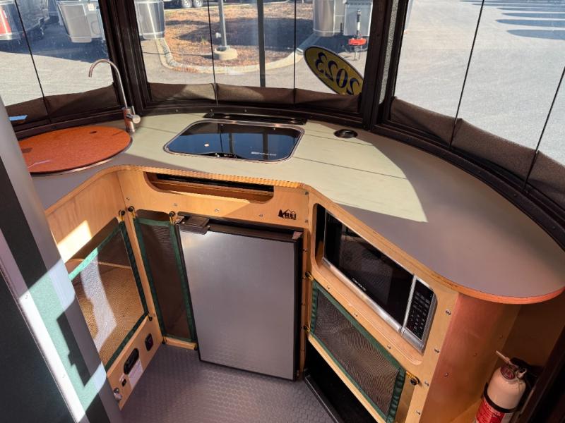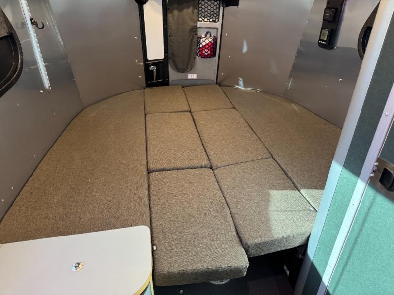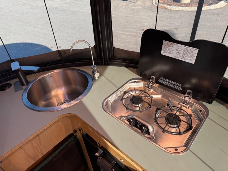 Head for the hills in this efficient travel trailer for two! Once you arrive at your destination you can make lunch in the front kitchen that includes a two burner cooktop, a 12V electric refrigerator, plus an optional microwave if you want to make breakfast items to go. The rear benches with tabletops can be set up to dine, lounge, or sleep, and you'll find a lockable storage space with a USB port, under-bed storage, and blackout curtain(s) so you can get some shut-eye. The wet bath will be super convenient while you're away from home, which includes a shower and a toilet, or you can choose the optional composting toilet. There is even a pass-through in the bathroom wall to create an outdoor shower if you need to rinse the sand off or hose down your bike.