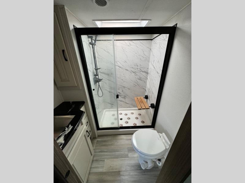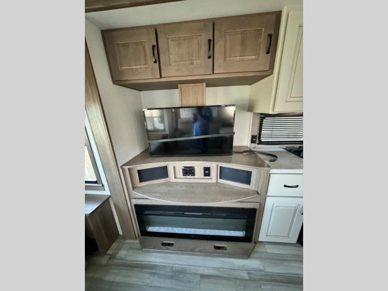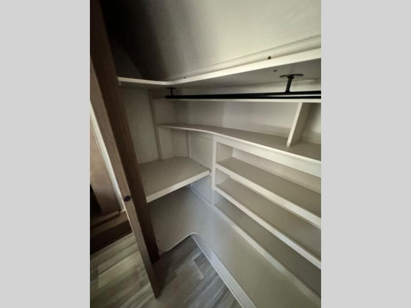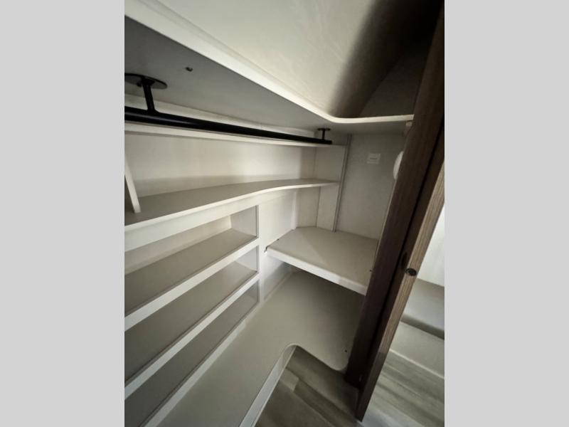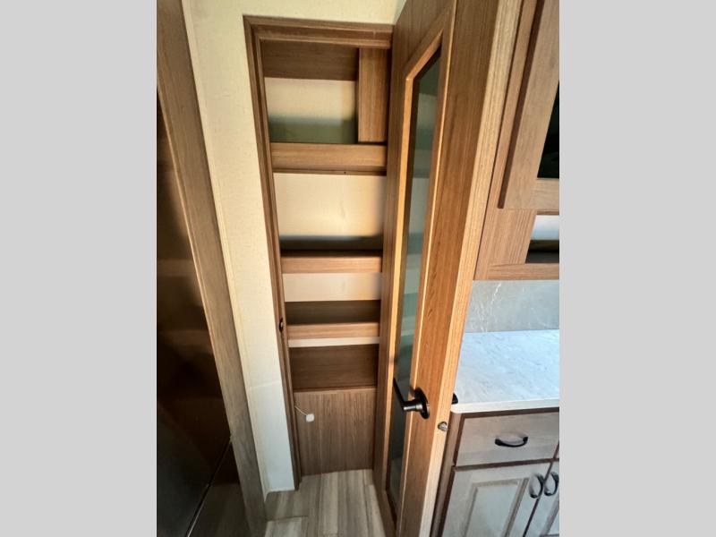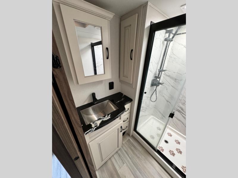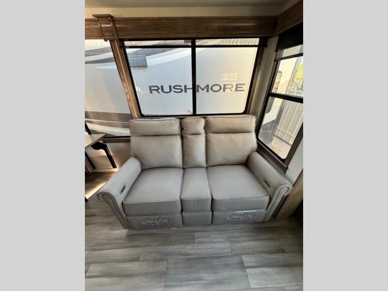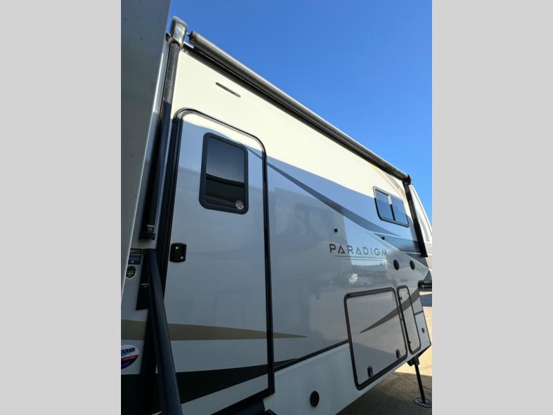 Search for the best views, the nicest RV park, or a place you haven't seen for years with this Paradigm in tow! There is a king bed slide in the master bedroom, a Smart TV, and a dresser with flip-up hidden storage for your belongings. The full bathroom offers a large residential shower, a porcelain toilet with a soft close seat, and storage for your linens, while the kitchen gives you two pantries, an island with a stainless steel farm sink and a space prepped for a dishwasher option. You will also have an Insignia residential microwave and range, plus a 3.73 cu. ft. oven to make meals. When you're ready to relax for the evening, head to the rear living area to enjoy the dual recliner love seat across from the 50" Smart TV and fireplace!