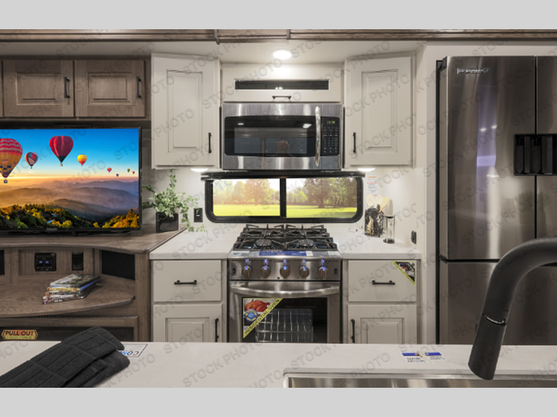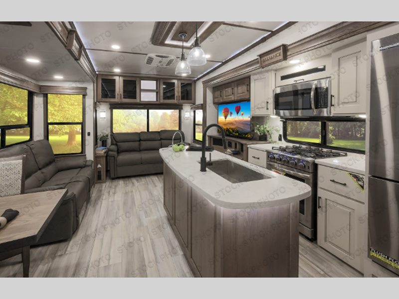 The Paradigm fifth wheels by Alliance RV are functional, high-quality, and luxurious for an unforgettable camping experience. There are three A/C units and a 40K BTU furnace to keep you comfortable year around, and you'll appreciate additional convenient amenities, like the all-in-one enclosed/heated utility center and the color coded and numbered wiring. A Roto-Flex pin box comes standard for hassle-free towing, along with Super-G 4,400 lb. rated tires and Dexter 7,000 lb. axles. You'll love the kitchen with its LG solid surface countertops and Insignia range, plus there is LED motion lighting in the pantry and a Maxx fan with a rain sensor to keep everything fresh when making dinner. Each model also includes an HD Smart TV in the living room and bedroom, plus a Winegard Air 360 antenna to keep you connected to the outside world. And of course there are a variety of options you can choose from to further customize your fifth wheel; dual pane windows, Super Solar Plus, slide out awning toppers, and generator prep or a generator to name a few!