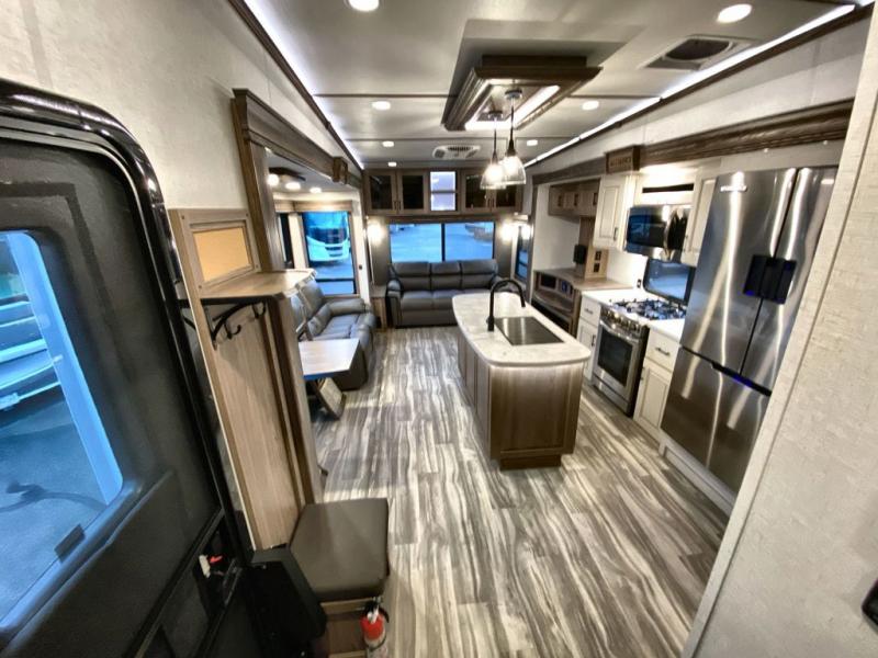 The Paradigm fifth wheels by Alliance RV are functional, high-quality, and luxurious for an unforgettable camping experience. There are three A/C units and a 40K BTU furnace to keep you comfortable year around, and you'll appreciate additional convenient amenities, like the all-in-one enclosed/heated utility center and the color coded and numbered wiring. A Roto-Flex pin box comes standard for hassle-free towing, along with Super-G 4,400 lb. rated tires and Dexter 7,000 lb. axles. You'll love the kitchen with its LG solid surface countertops and Insignia range, plus there is LED motion lighting in the pantry and a Maxx fan with a rain sensor to keep everything fresh when making dinner. Each model also includes an HD Smart TV in the living room and bedroom, plus a Winegard Air 360 antenna to keep you connected to the outside world. And of course there are a variety of options you can choose from to further customize your fifth wheel; dual pane windows, Super Solar Plus, slide out awning toppers, and generator prep or a generator to name a few!