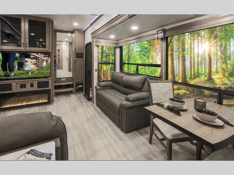 You won't want to camp any other way once you step inside this travel trailer! the chef will enjoy all of the space in the rear kitchen with ample counter space, a 19 cu. ft. 12 volt residential refrigerator, and a pantry for snacks. Everyone will love to meet in the middle living area that includes dual sleeper sofas and a dual recliner loveseat across from the 50" Smart TV and fireplace. The half bathroom is nearby for quick bathroom breaks too. You will feel right at home in the master suite with a king bed slide to lay your head on at night, a flip top dresser with a Smart TV above it to watch your movies in true comfort, and a seat with storage, plus access to the front full bathroom. Inside the bathroom, you will find a 61" x 30" shower to freshen up in and a walk-in closet with a hamper, shelves, and an area prepped to add an optional washer and dryer for clean clothes throughout your entire trip!