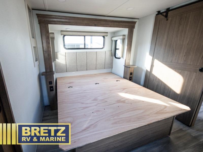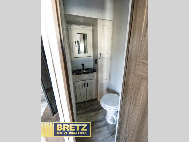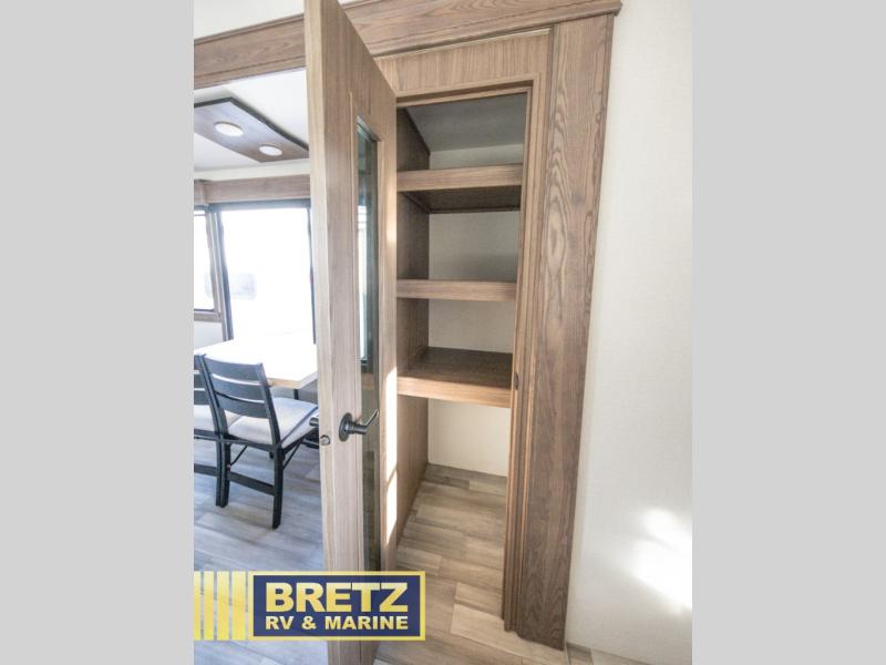 You won't want to camp any other way once you step inside this travel trailer! the chef will enjoy all of the space in the rear kitchen with ample counter space, a 19 cu. ft. 12 volt residential refrigerator, and a pantry for snacks. Everyone will love to meet in the middle living area that includes dual sleeper sofas and a dual recliner loveseat across from the 50" Smart TV and fireplace. The half bathroom is nearby for quick bathroom breaks too. You will feel right at home in the master suite with a king bed slide to lay your head on at night, a flip top dresser with a Smart TV above it to watch your movies in true comfort, and a seat with storage, plus access to the front full bathroom. Inside the bathroom, you will find a 61" x 30" shower to freshen up in and a walk-in closet with a hamper, shelves, and an area prepped to add an optional washer and dryer for clean clothes throughout your entire trip!