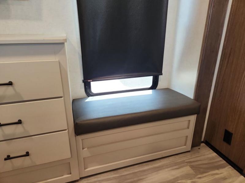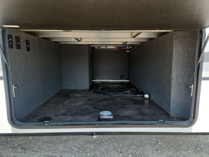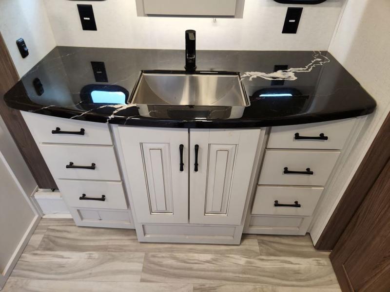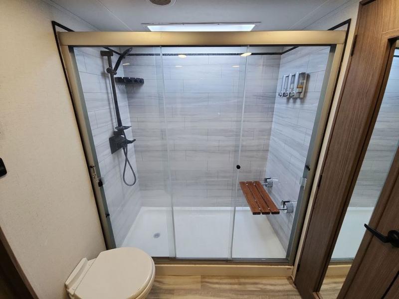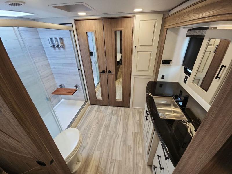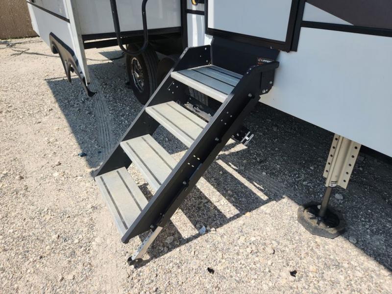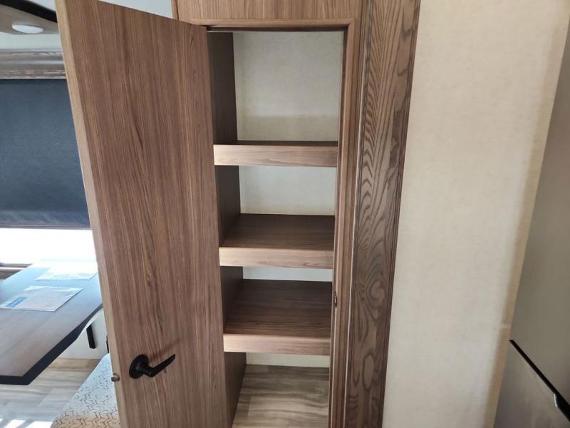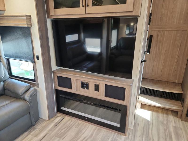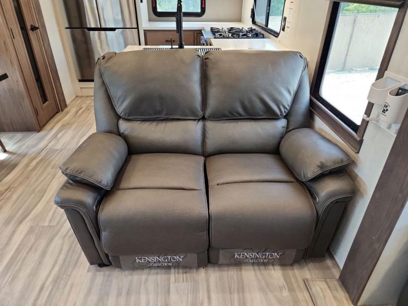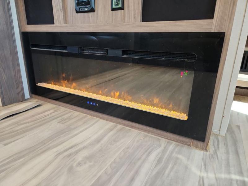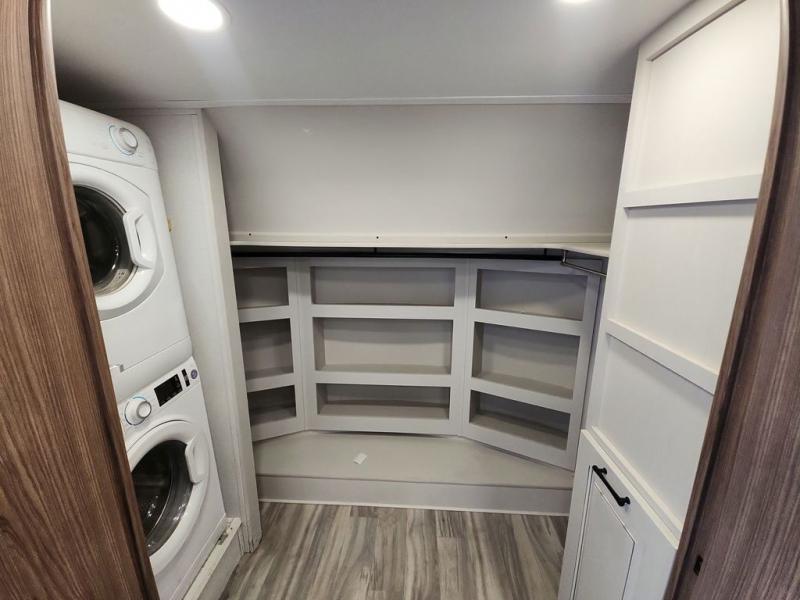 You won't want to camp any other way once you step inside this travel trailer! the chef will enjoy all of the space in the rear kitchen with ample counter space, a 19 cu. ft. 12 volt residential refrigerator, and a pantry for snacks. Everyone will love to meet in the middle living area that includes dual sleeper sofas and a dual recliner loveseat across from the 50" Smart TV and fireplace. The half bathroom is nearby for quick bathroom breaks too. You will feel right at home in the master suite with a king bed slide to lay your head on at night, a flip top dresser with a Smart TV above it to watch your movies in true comfort, and a seat with storage, plus access to the front full bathroom. Inside the bathroom, you will find a 61" x 30" shower to freshen up in and a walk-in closet with a hamper, shelves, and an area prepped to add an optional washer and dryer for clean clothes throughout your entire trip!