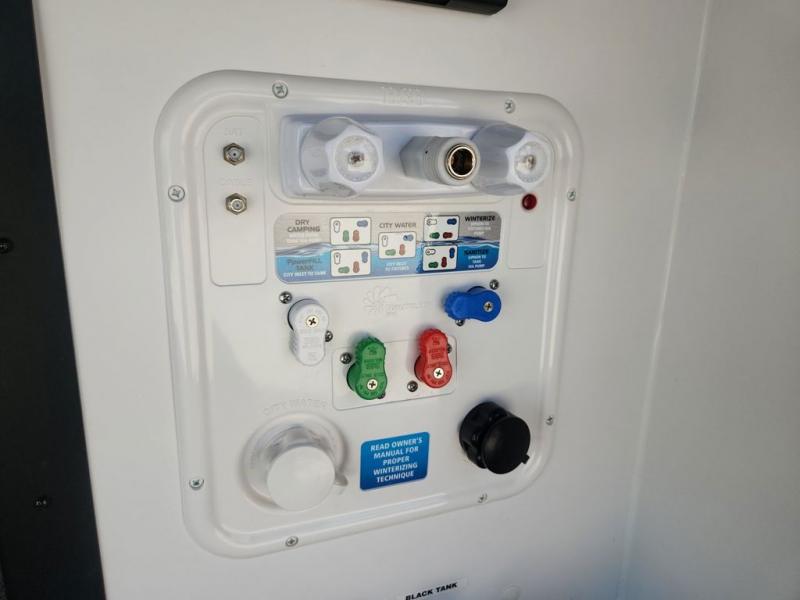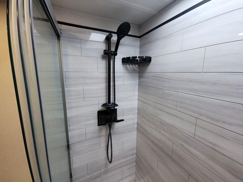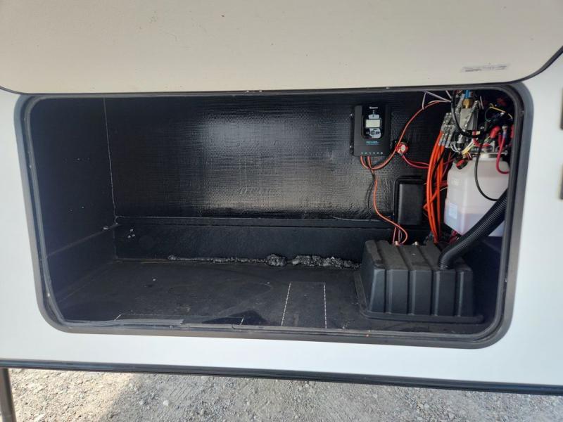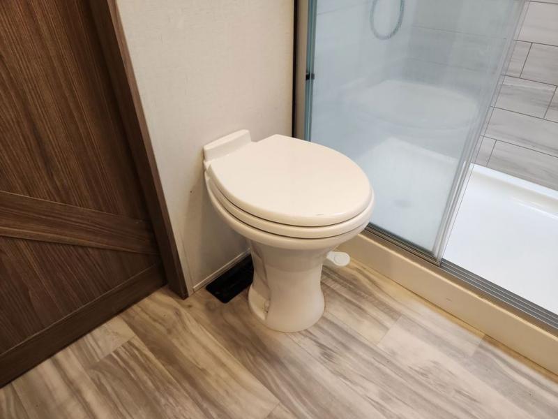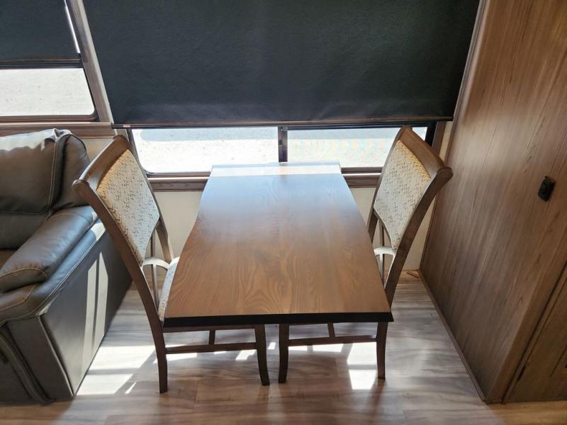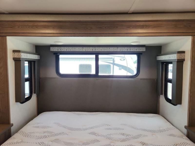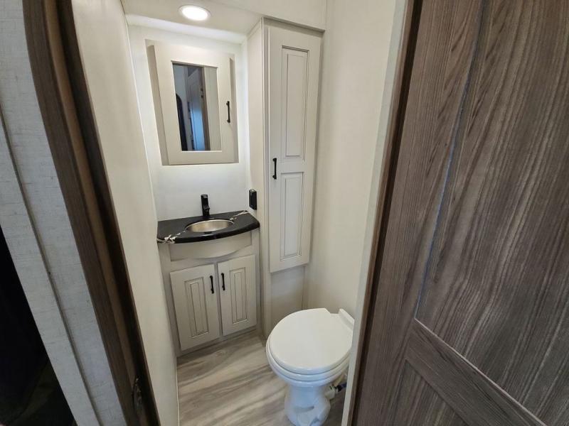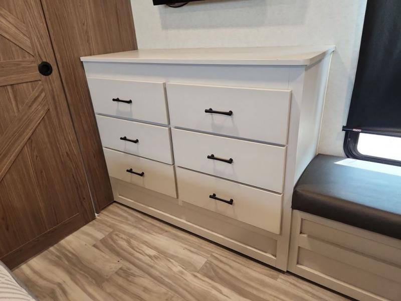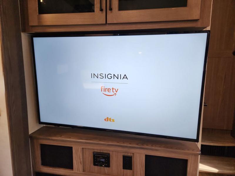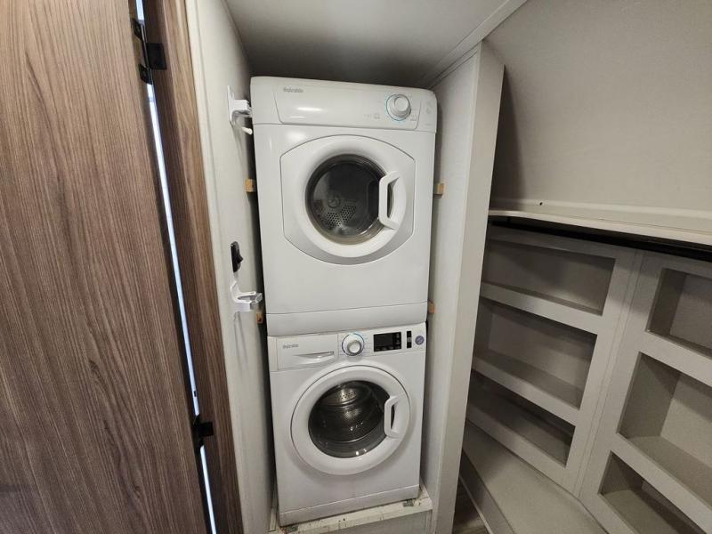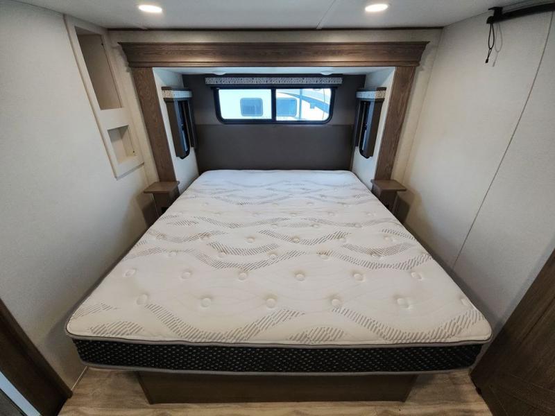 You won't want to camp any other way once you step inside this travel trailer! the chef will enjoy all of the space in the rear kitchen with ample counter space, a 19 cu. ft. 12 volt residential refrigerator, and a pantry for snacks. Everyone will love to meet in the middle living area that includes dual sleeper sofas and a dual recliner loveseat across from the 50" Smart TV and fireplace. The half bathroom is nearby for quick bathroom breaks too. You will feel right at home in the master suite with a king bed slide to lay your head on at night, a flip top dresser with a Smart TV above it to watch your movies in true comfort, and a seat with storage, plus access to the front full bathroom. Inside the bathroom, you will find a 61" x 30" shower to freshen up in and a walk-in closet with a hamper, shelves, and an area prepped to add an optional washer and dryer for clean clothes throughout your entire trip!