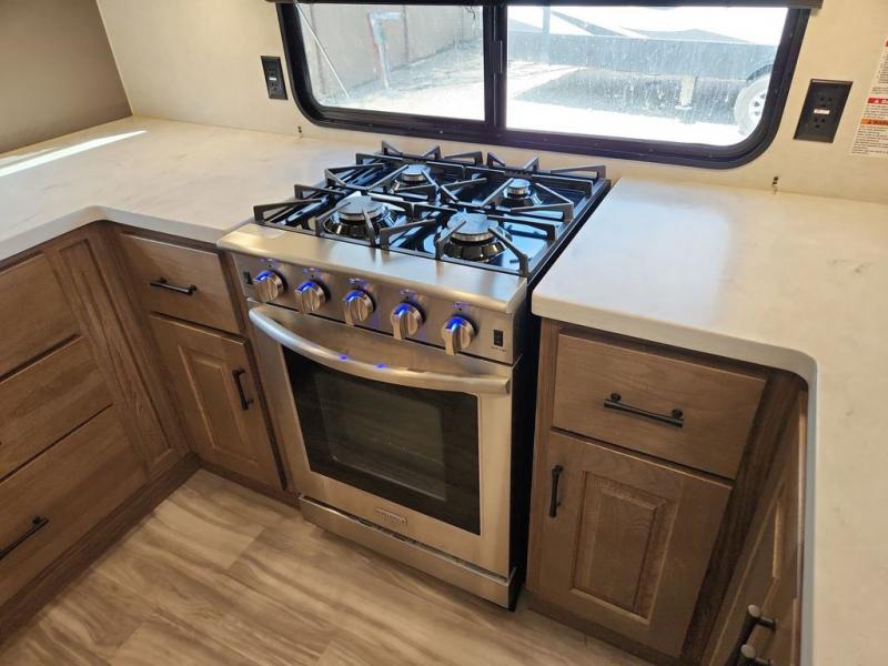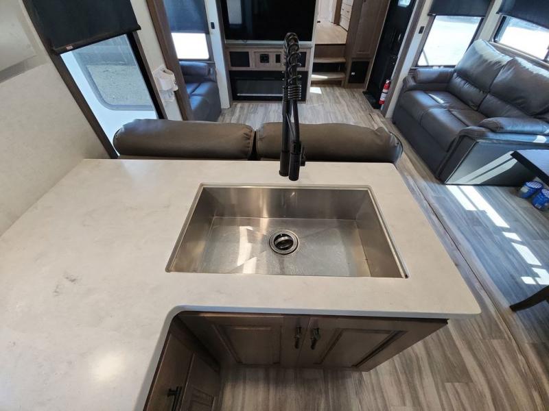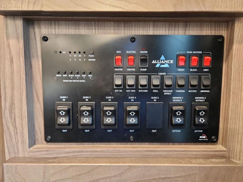The Paradigm fifth wheels by Alliance RV are functional, high-quality, and luxurious for an unforgettable camping experience. There are three A/C units and a 40K BTU furnace to keep you comfortable year around, and you'll appreciate additional convenient amenities, like the all-in-one enclosed/heated utility center and the color coded and numbered wiring. A Roto-Flex pin box comes standard for hassle-free towing, along with Super-G 4,400 lb. rated tires and Dexter 7,000 lb. axles. You'll love the kitchen with its LG solid surface countertops and Insignia range, plus there is LED motion lighting in the pantry and a Maxx fan with a rain sensor to keep everything fresh when making dinner. Each model also includes an HD Smart TV in the living room and bedroom, plus a Winegard Air 360 antenna to keep you connected to the outside world. And of course there are a variety of options you can choose from to further customize your fifth wheel; dual pane windows, Super Solar Plus, slide out awning toppers, and generator prep or a generator to name a few!