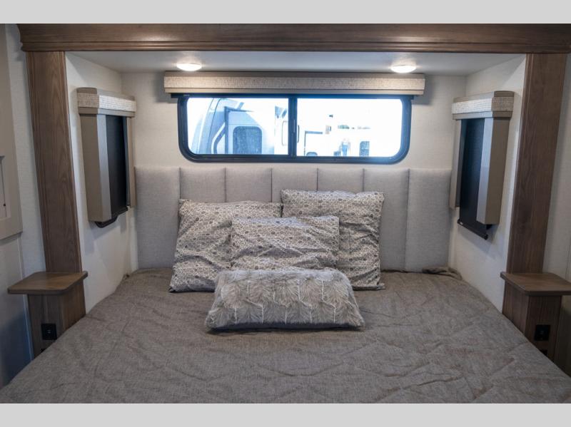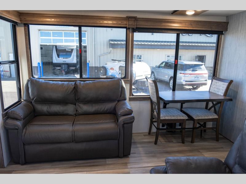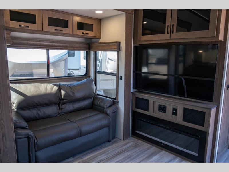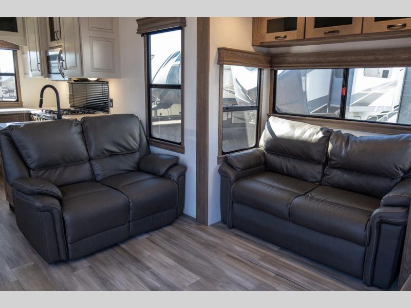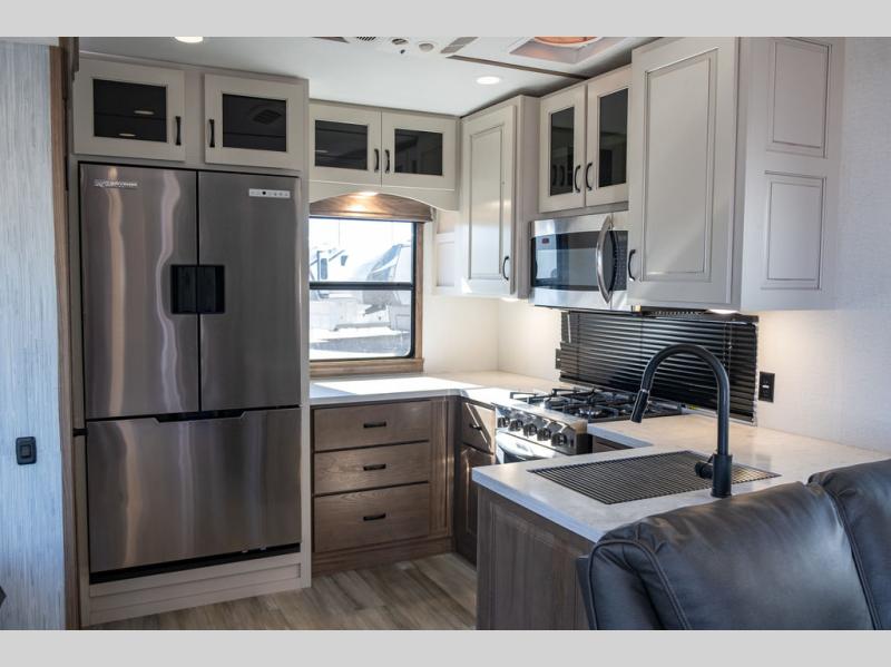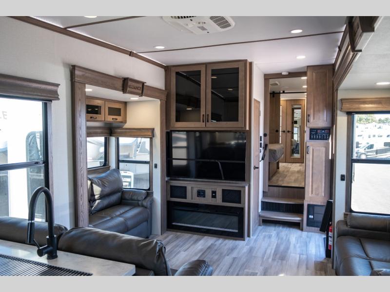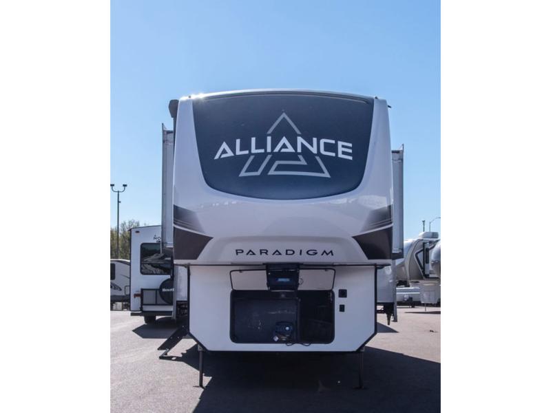 The Paradigm fifth wheels by Alliance RV are functional, high-quality, and luxurious for an unforgettable camping experience. There are three A/C units and a 40K BTU furnace to keep you comfortable year around, and you'll appreciate additional convenient amenities, like the all-in-one enclosed/heated utility center and the color coded and numbered wiring. A Roto-Flex pin box comes standard for hassle-free towing, along with Super-G 4,400 lb. rated tires and Dexter 7,000 lb. axles. You'll love the kitchen with its LG solid surface countertops and Insignia range, plus there is LED motion lighting in the pantry and a Maxx fan with a rain sensor to keep everything fresh when making dinner. Each model also includes an HD Smart TV in the living room and bedroom, plus a Winegard Air 360 antenna to keep you connected to the outside world. And of course there are a variety of options you can choose from to further customize your fifth wheel; dual pane windows, Super Solar Plus, slide out awning toppers, and generator prep or a generator to name a few!