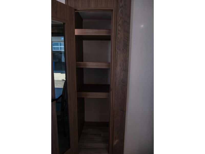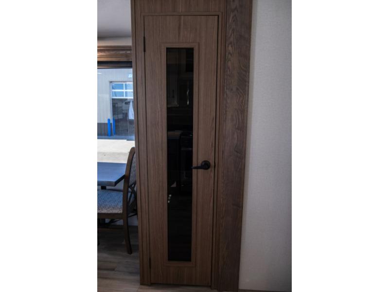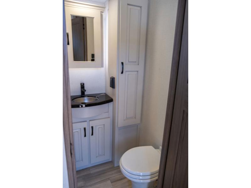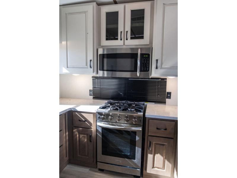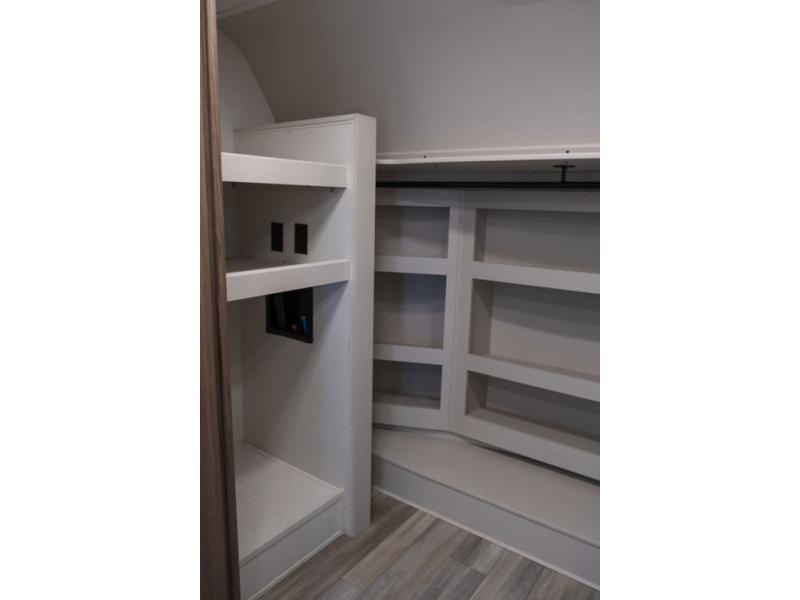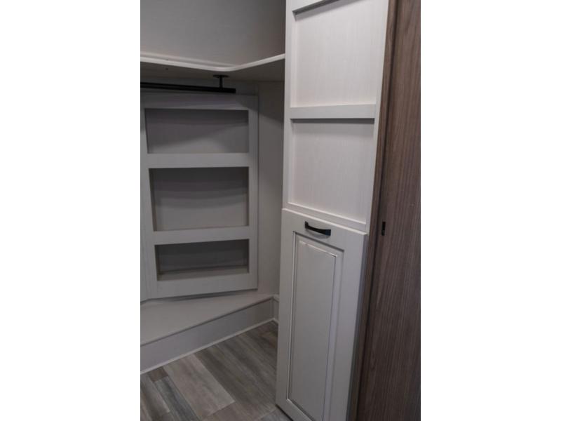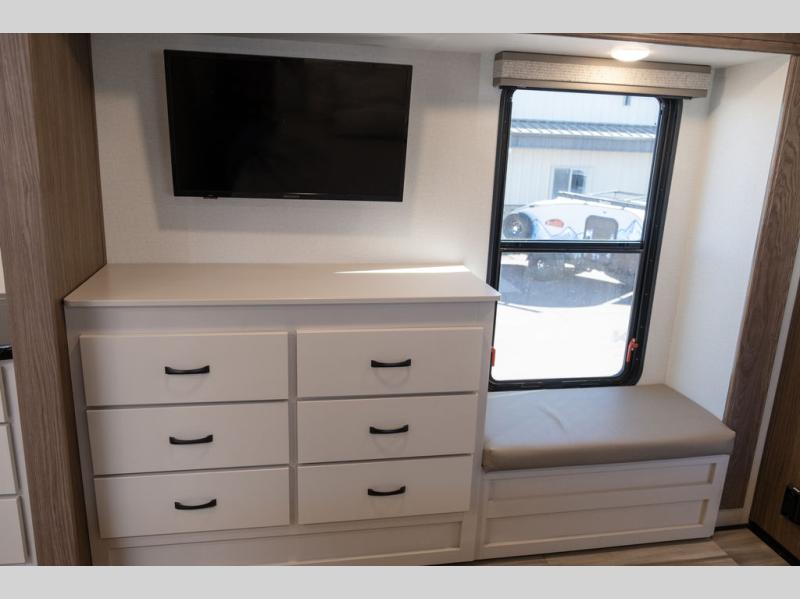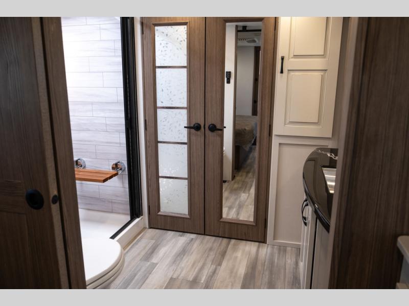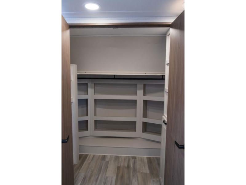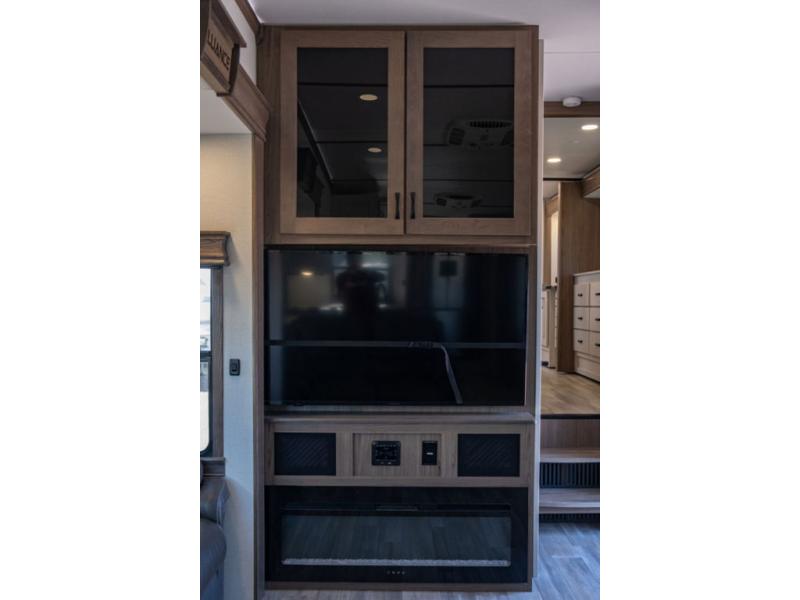 You won't want to camp any other way once you step inside this travel trailer! the chef will enjoy all of the space in the rear kitchen with ample counter space, a 19 cu. ft. 12 volt residential refrigerator, and a pantry for snacks. Everyone will love to meet in the middle living area that includes dual sleeper sofas and a dual recliner loveseat across from the 50" Smart TV and fireplace. The half bathroom is nearby for quick bathroom breaks too. You will feel right at home in the master suite with a king bed slide to lay your head on at night, a flip top dresser with a Smart TV above it to watch your movies in true comfort, and a seat with storage, plus access to the front full bathroom. Inside the bathroom, you will find a 61" x 30" shower to freshen up in and a walk-in closet with a hamper, shelves, and an area prepped to add an optional washer and dryer for clean clothes throughout your entire trip!
