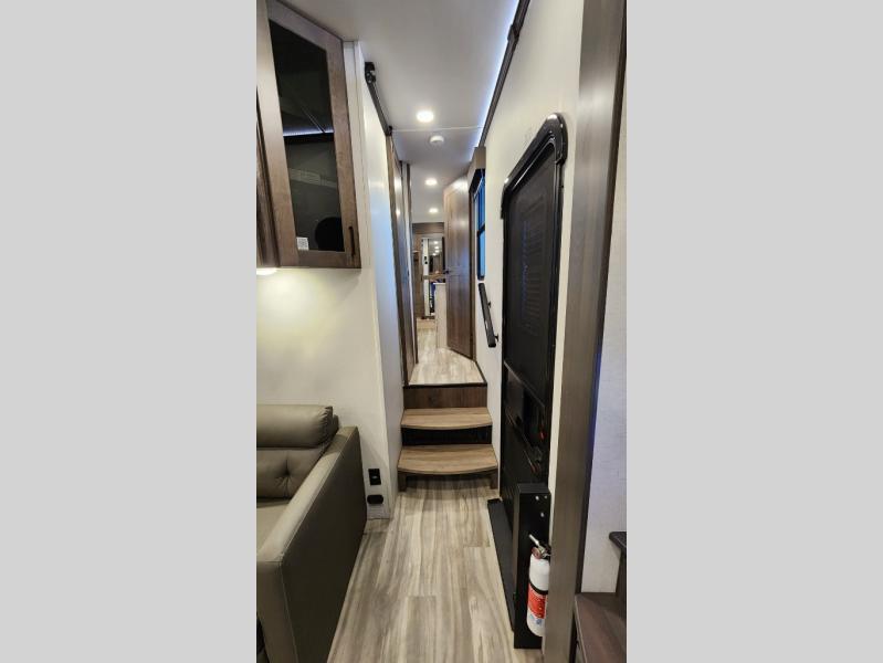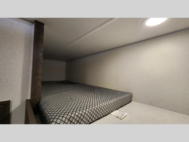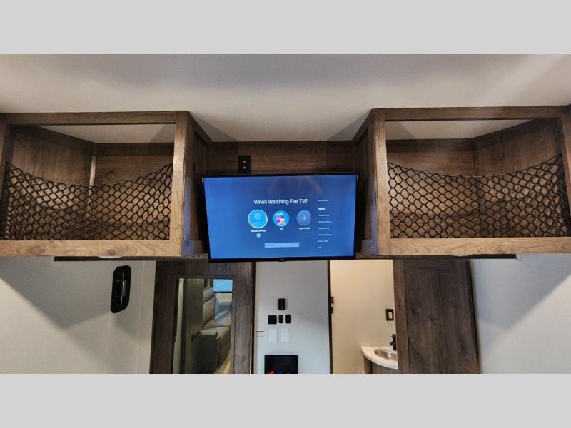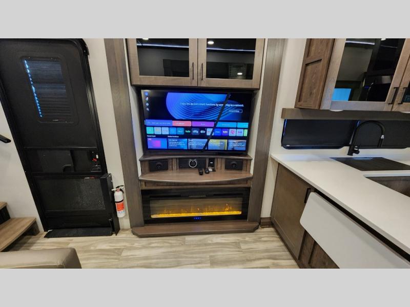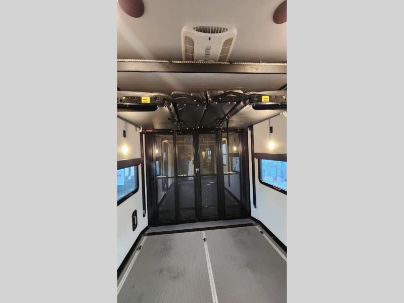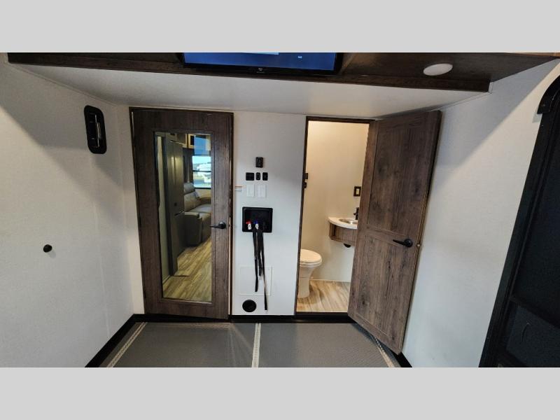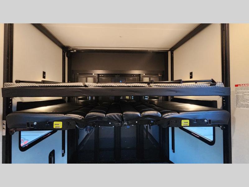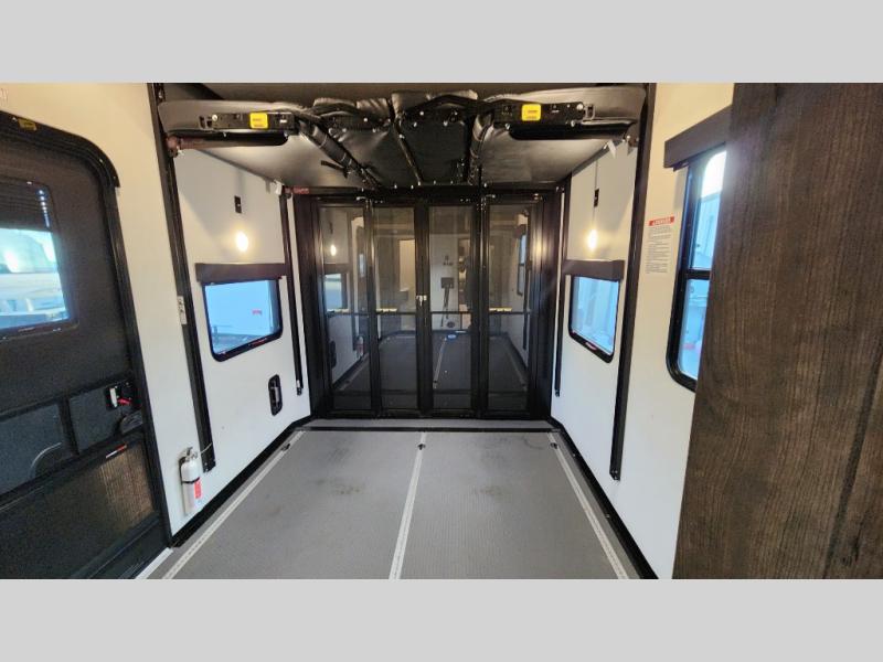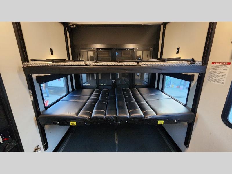 There is room for your off-road toys and the whole family in this toy hauler! The bath and a half makes life more convenient and the dual entry doors create a smooth flow of traffic in and out of the unit. Aside from 13' of garage space, an air compressor, and an entrance/exit door there are also opposing HappiJac sofas with a queen bed above them, a loft that opens to the living room, and a half bathroom. The chef can prepare their best meals with the four burner cooktop while two others sit at the flip up counter with two bar stools. After a fun day on the trails, wash up in the full bathroom with the 48" x 30" shower, grab your pajamas from the front wardrobe or flip top dresser in the front private bedroom then relax on one of the two sofas by the fireplace and Smart TV!