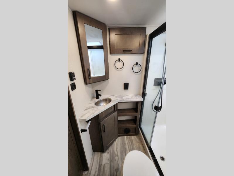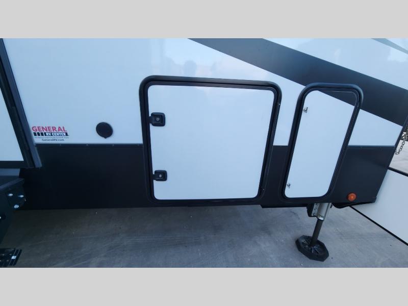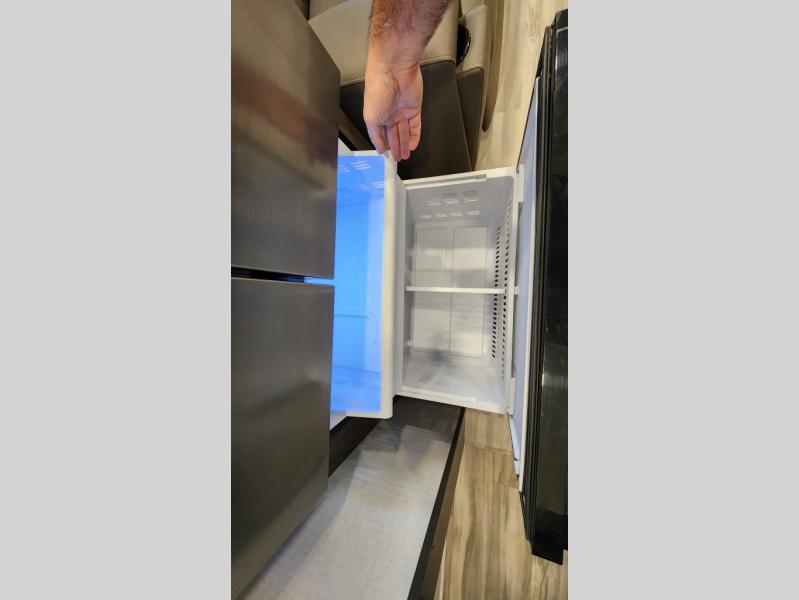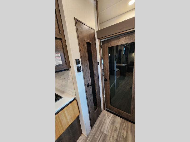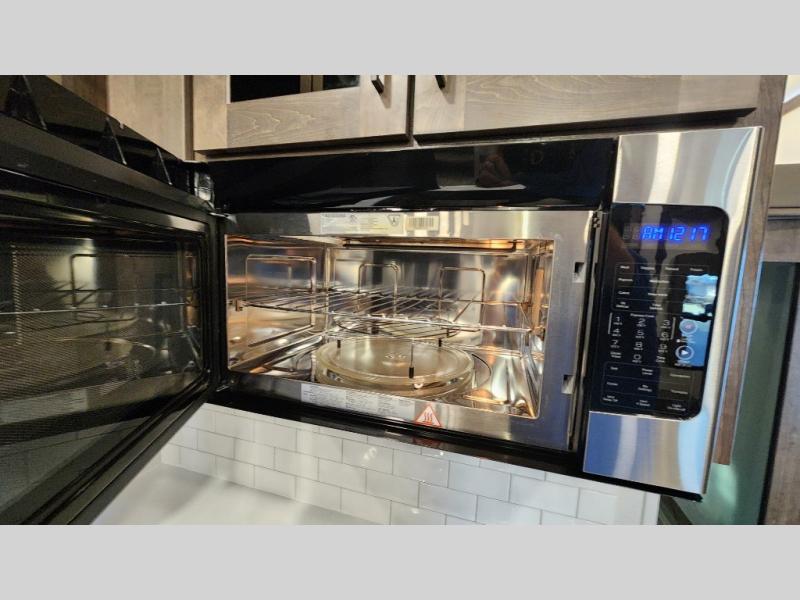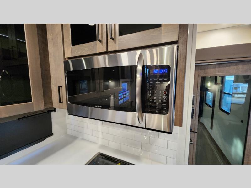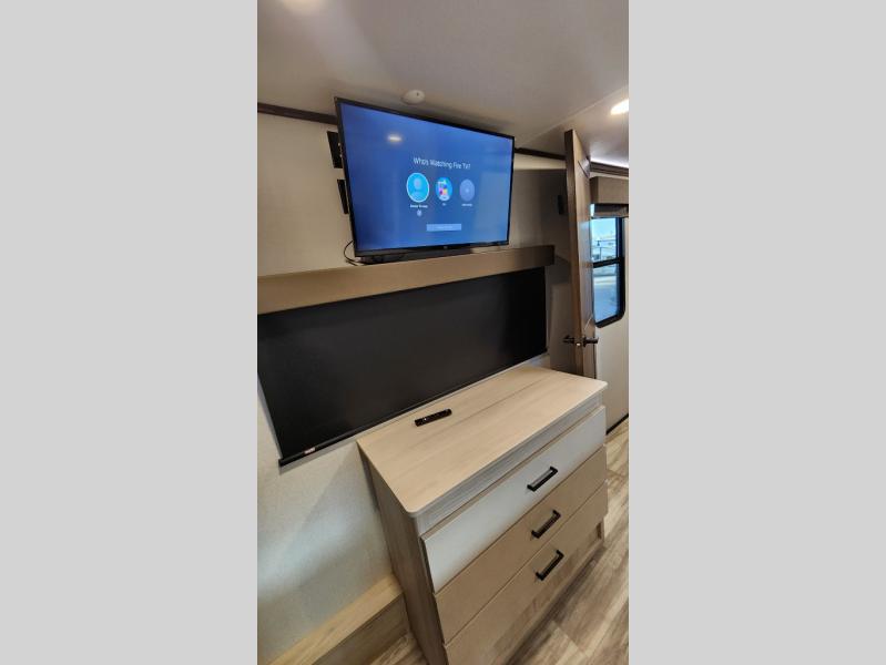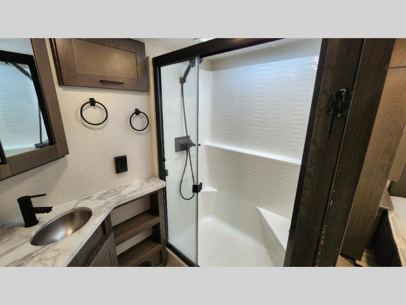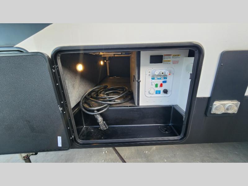 There is room for your off-road toys and the whole family in this toy hauler! The bath and a half makes life more convenient and the dual entry doors create a smooth flow of traffic in and out of the unit. Aside from 13' of garage space, an air compressor, and an entrance/exit door there are also opposing HappiJac sofas with a queen bed above them, a loft that opens to the living room, and a half bathroom. The chef can prepare their best meals with the four burner cooktop while two others sit at the flip up counter with two bar stools. After a fun day on the trails, wash up in the full bathroom with the 48" x 30" shower, grab your pajamas from the front wardrobe or flip top dresser in the front private bedroom then relax on one of the two sofas by the fireplace and Smart TV!