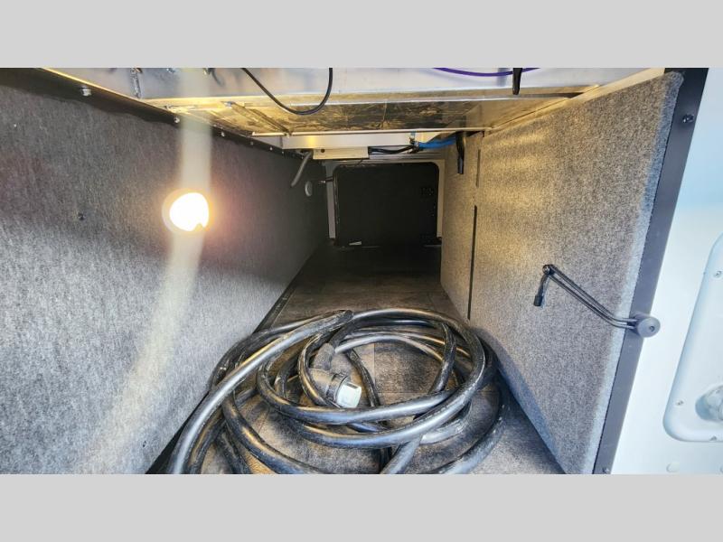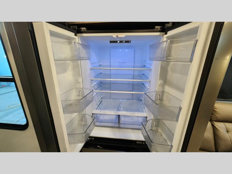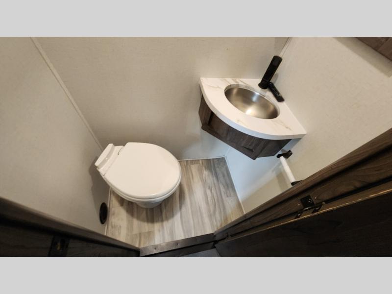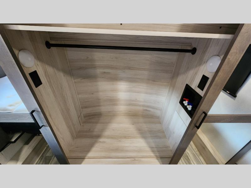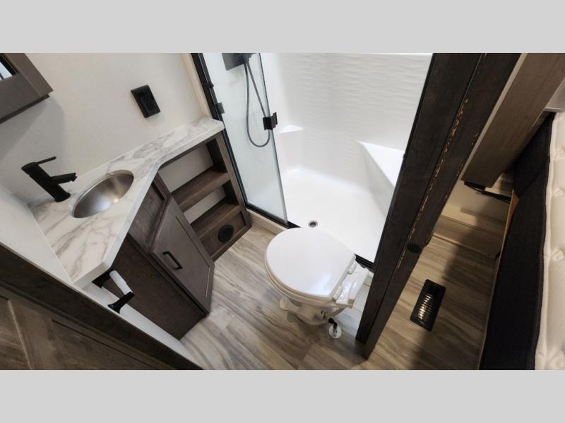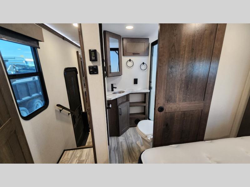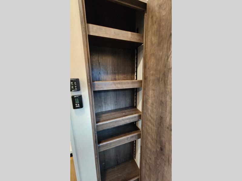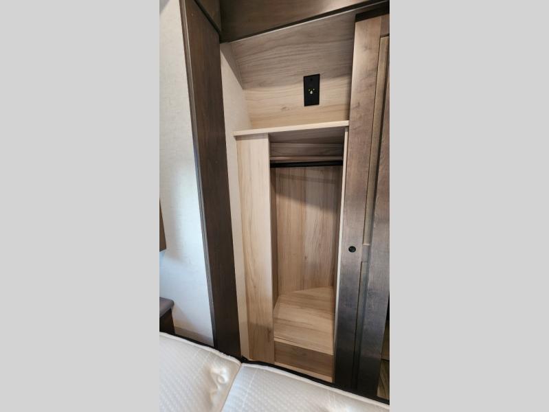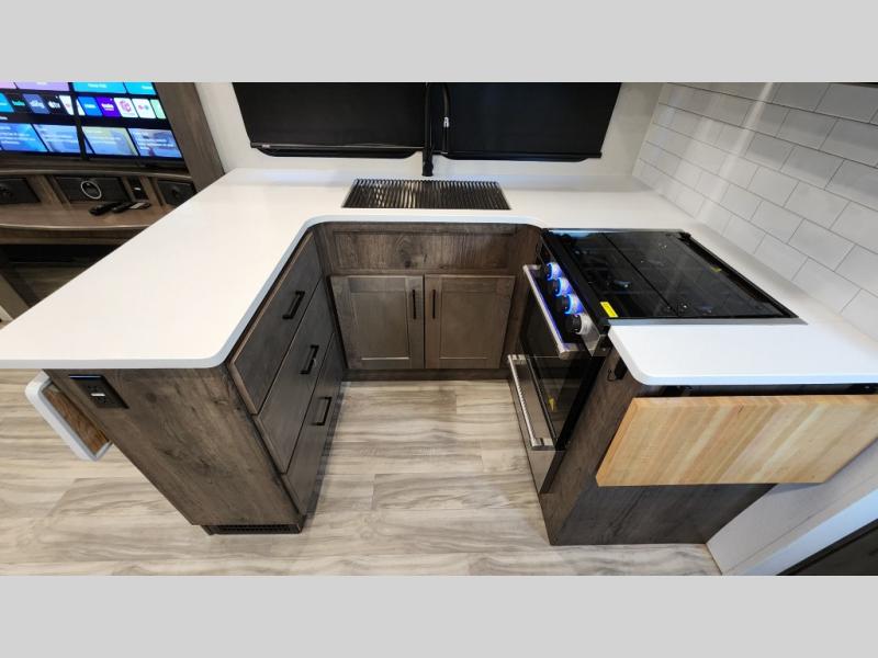 There is room for your off-road toys and the whole family in this toy hauler! The bath and a half makes life more convenient and the dual entry doors create a smooth flow of traffic in and out of the unit. Aside from 13' of garage space, an air compressor, and an entrance/exit door there are also opposing HappiJac sofas with a queen bed above them, a loft that opens to the living room, and a half bathroom. The chef can prepare their best meals with the four burner cooktop while two others sit at the flip up counter with two bar stools. After a fun day on the trails, wash up in the full bathroom with the 48" x 30" shower, grab your pajamas from the front wardrobe or flip top dresser in the front private bedroom then relax on one of the two sofas by the fireplace and Smart TV!