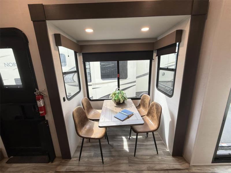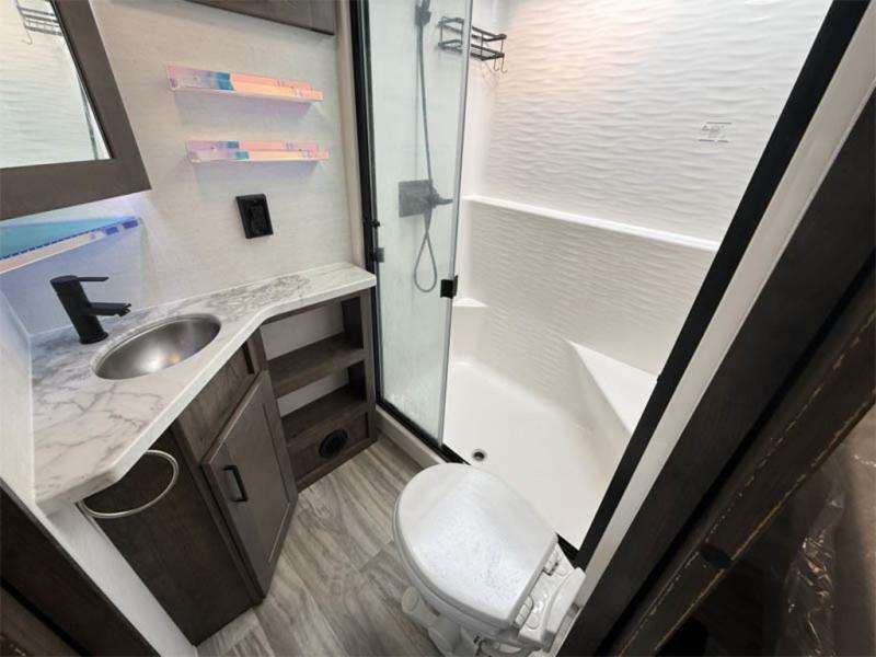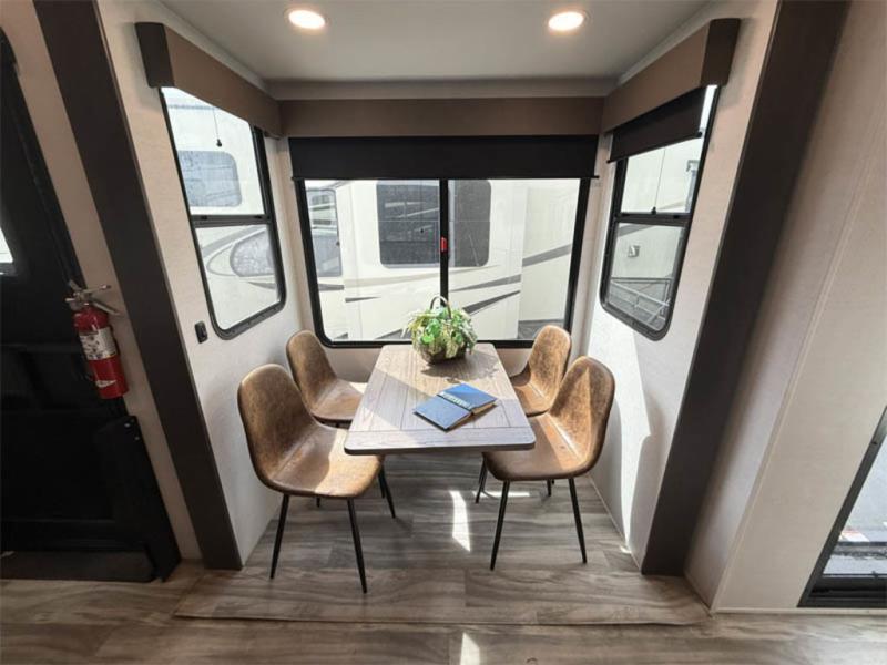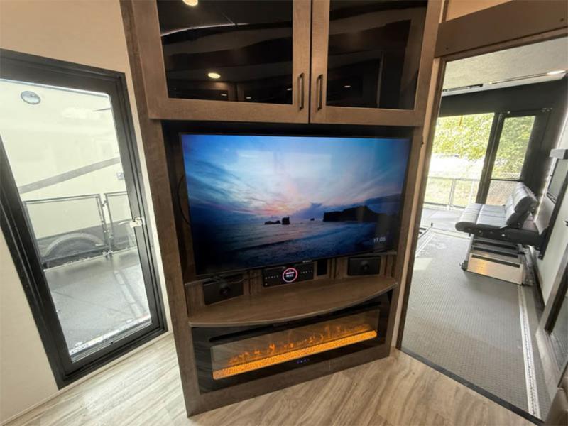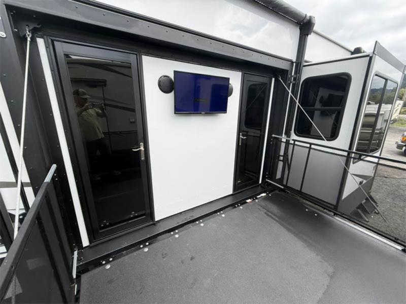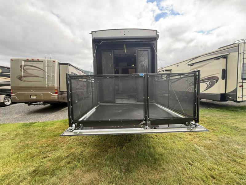 With 13' of garage space and a 8' weather resistant ramp door, you can easily load up your toys into this toy hauler! The garage area also has opposing HappiJac sofas with a queen bed above them, a loft that opens to the living room, and a half bathroom. Wake up feeling refreshed after sleeping on the king bed slide inside the front private bedroom and showering in the 48" x 30" shower inside the dual entry bathroom. Now that you're ready for the day you can head to the kitchen and fry up some bacon on the three burner cooktop then enjoy it at either the kitchen island with one of the two bar stools or at the free standing dinette. When you're ready to wind down your nights, either relax on the sofa across from the fireplace inside or set up a chair outside on the fold-down side patio!