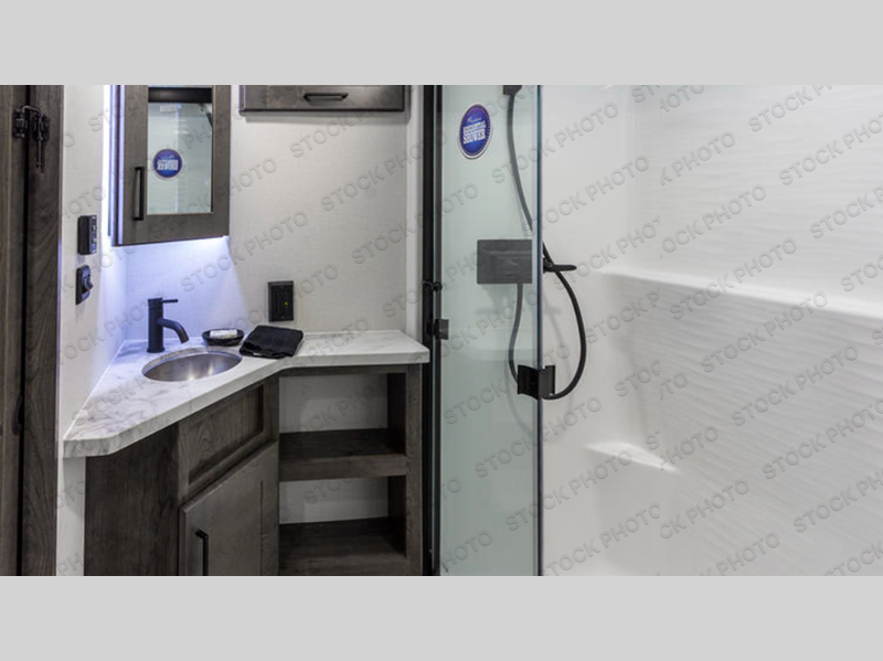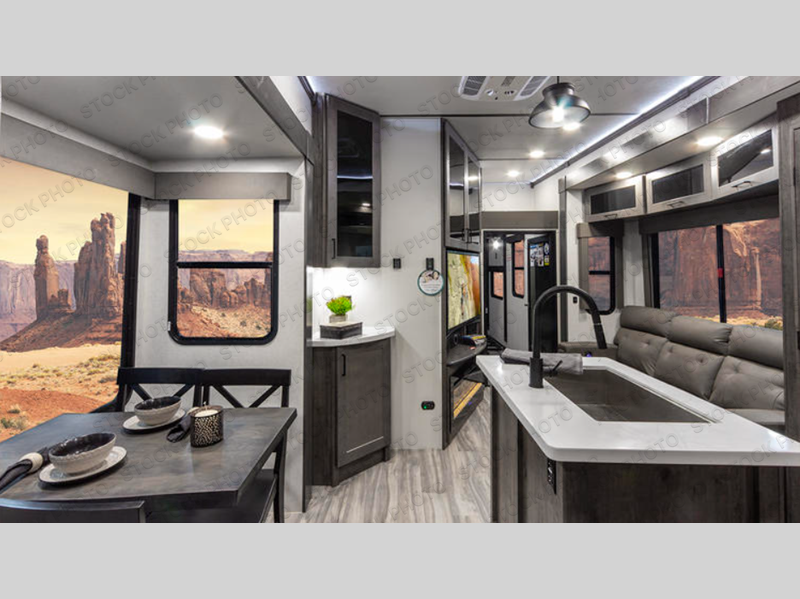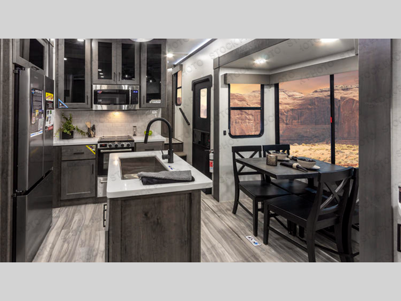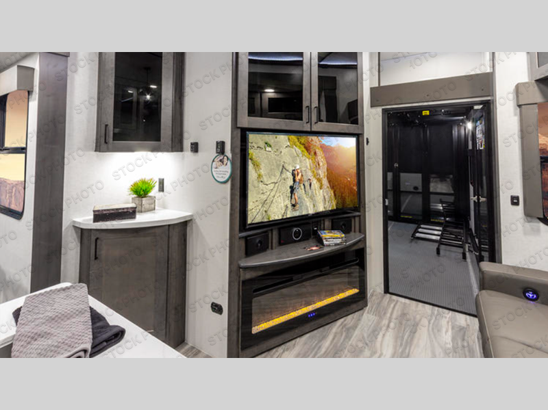 The whole gang will love camping in this toy hauler! There is 13' of garage space to store your off-road toys and once you have arrived at your destination you can set up the HappiJac roll-over sofas with a queen bed above them and the loft which opens to the living area. With two full bathrooms, everyone will stay squeaky clean. The chef can prepare their best meals with the kitchen island, three burner cooktop, and 17 cu. ft. stainless steel refrigerator while others play games at the table and chairs or relax by the fireplace on the sofa. The front private bedroom has a king bed slide for more walking around space, a flip top dresser, and a front wardrobe that is prepped to add an optional washer and dryer, plus it has an entrance into the dual entry bathroom!