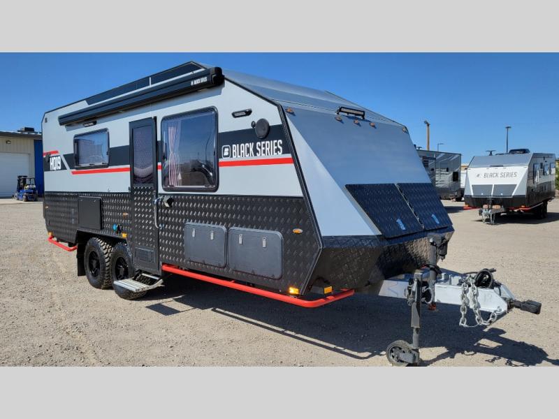 The Black Series Camper HQ Series travel trailers are one-of-a-kind! You won't find many more trailers like these out on the market. Built for the extreme camping enthusiast, the HQ Series is off-road and off-grid friendly. These rugged trailers have aluminum composite panels with added aluminum diamond plating for added strength and a stone guard/skid guard that adds protection for the bottom edge of the trailer. The Eurovision windows have a fly screen and privacy shades, and there is also a tri-lock security door with locking fly screen. An amazing feature that comes on each of the models is the outdoor kitchen which has a stainless steel sink slide, a propane stove, and a large prep table, and the roof-mounted solar panels are amazingly useful for those off-grid trips.