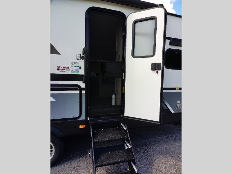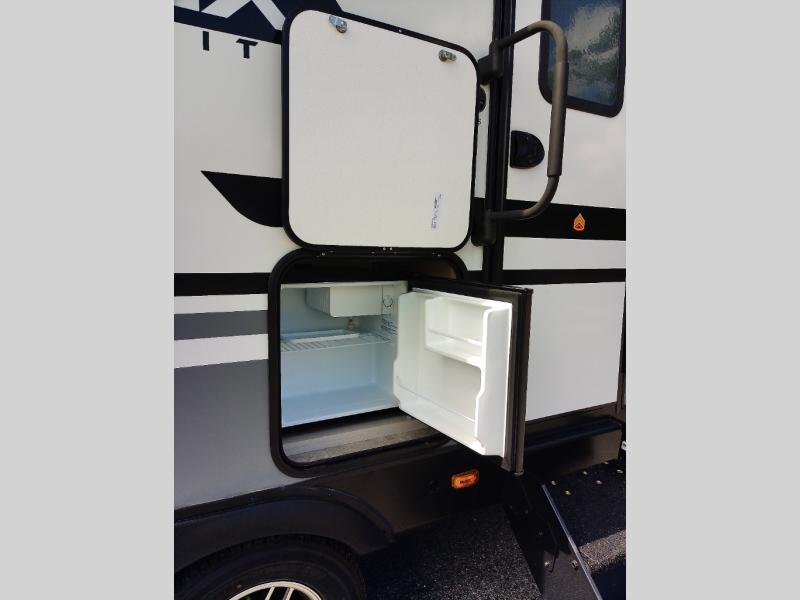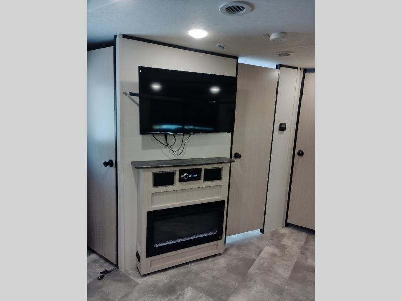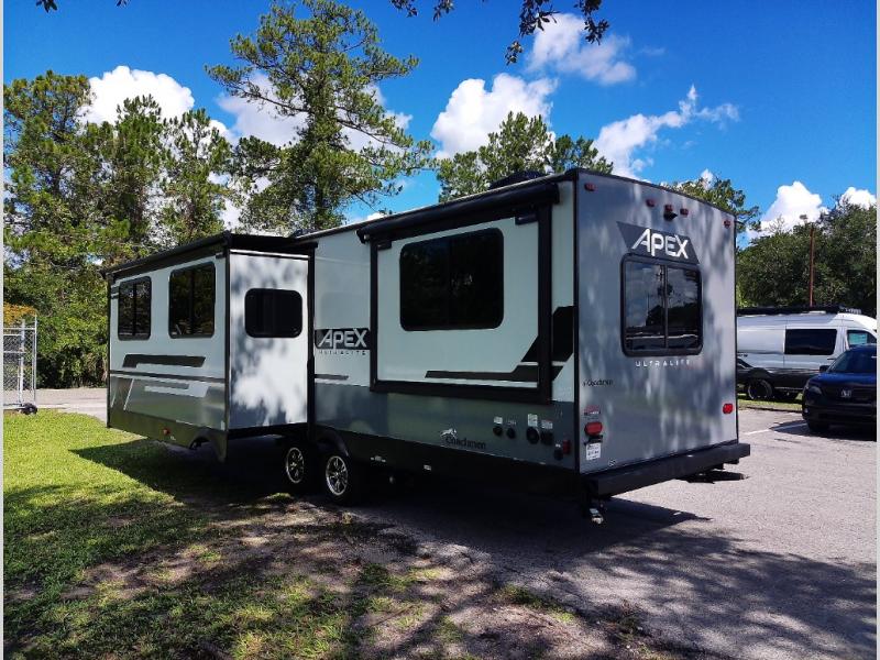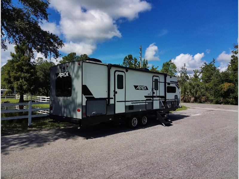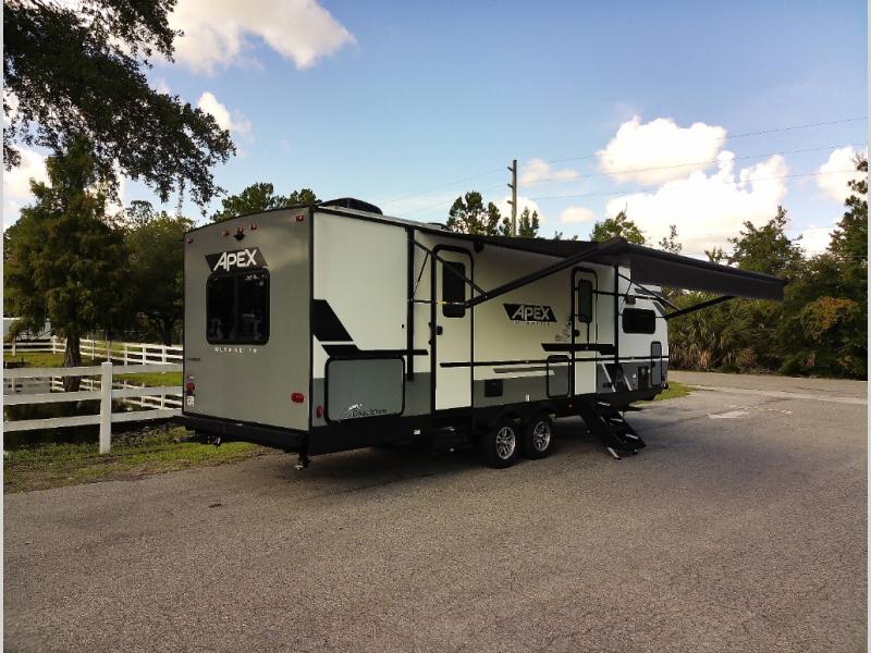 Enjoy each adventure camping in this Apex Ultra-Lite unit featuring dual entry doors. There is sleeping for up to six with the convertible dinette and sofa, plus a queen bed slide in the rear private bedroom that includes super storage beneath. This bedroom also features a large wardrobe near the private bedroom entry door. The front kitchen has everything you need to prepare hearty camp meals easily thanks to the large counter space for prepping. A booth dinette and sofa slide offer seating for everyone and all will easily be able to view the entertainment center with TV and cozy fireplace from either one. A large pantry is conveniently located just inside the main front most entry door where you can quickly grab a snack for outside, or load up groceries once you shop for your trip.