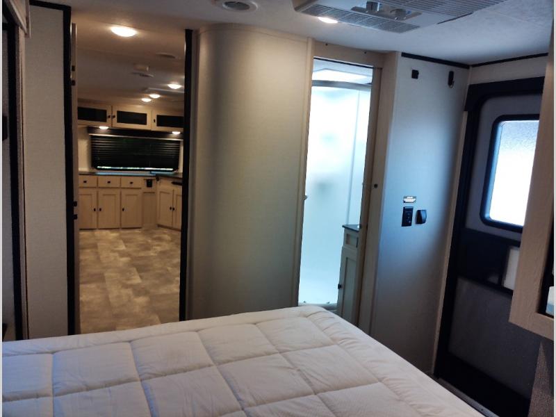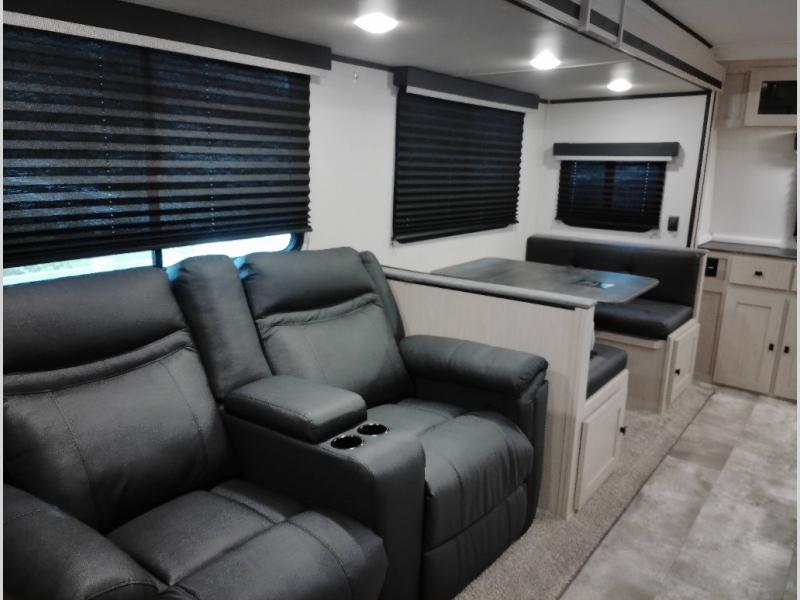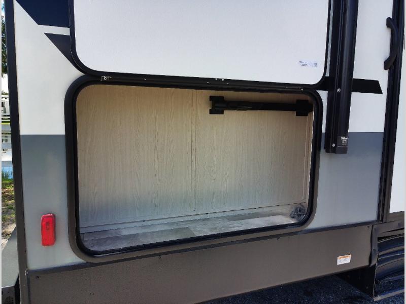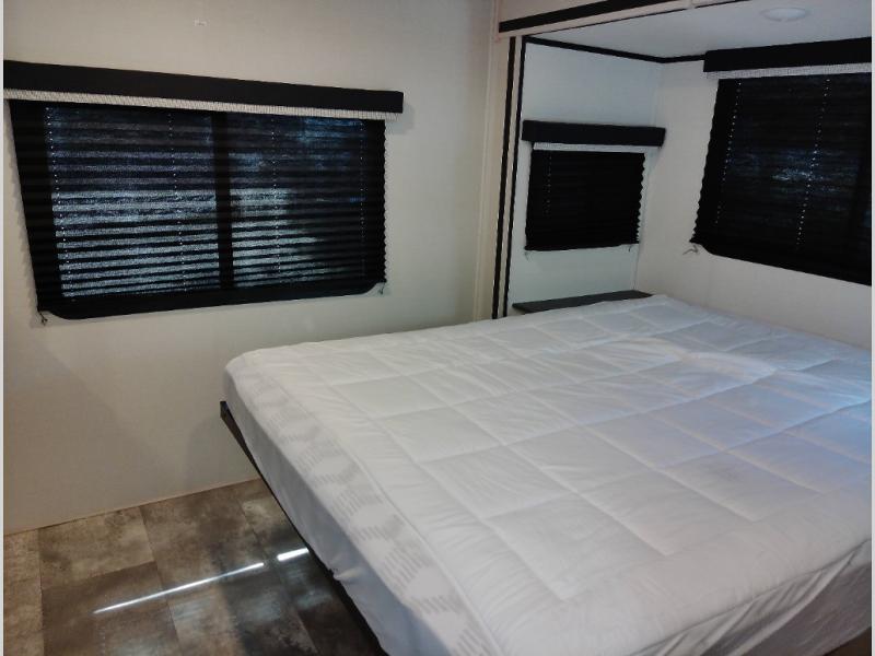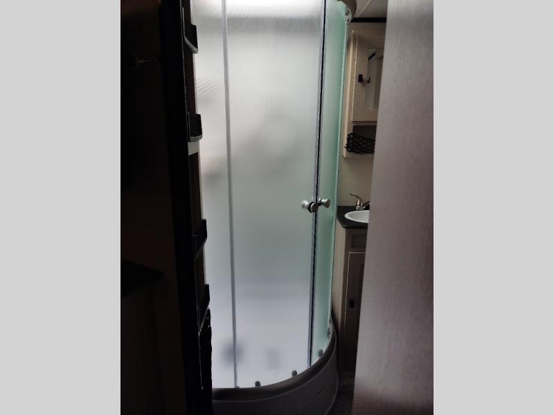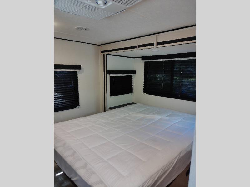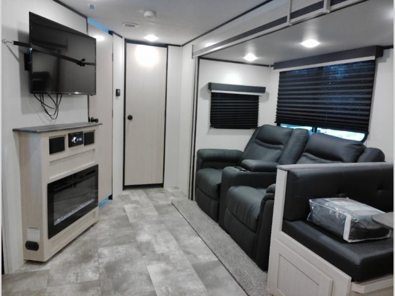 Enjoy each adventure camping in this Apex Ultra-Lite unit featuring dual entry doors. There is sleeping for up to six with the convertible dinette and sofa, plus a queen bed slide in the rear private bedroom that includes super storage beneath. This bedroom also features a large wardrobe near the private bedroom entry door. The front kitchen has everything you need to prepare hearty camp meals easily thanks to the large counter space for prepping. A booth dinette and sofa slide offer seating for everyone and all will easily be able to view the entertainment center with TV and cozy fireplace from either one. A large pantry is conveniently located just inside the main front most entry door where you can quickly grab a snack for outside, or load up groceries once you shop for your trip.