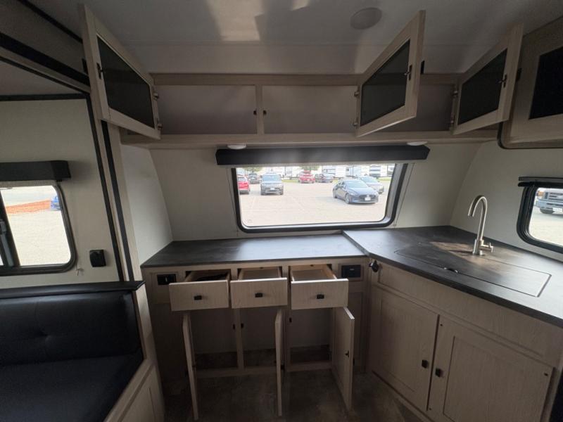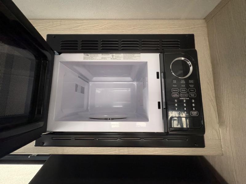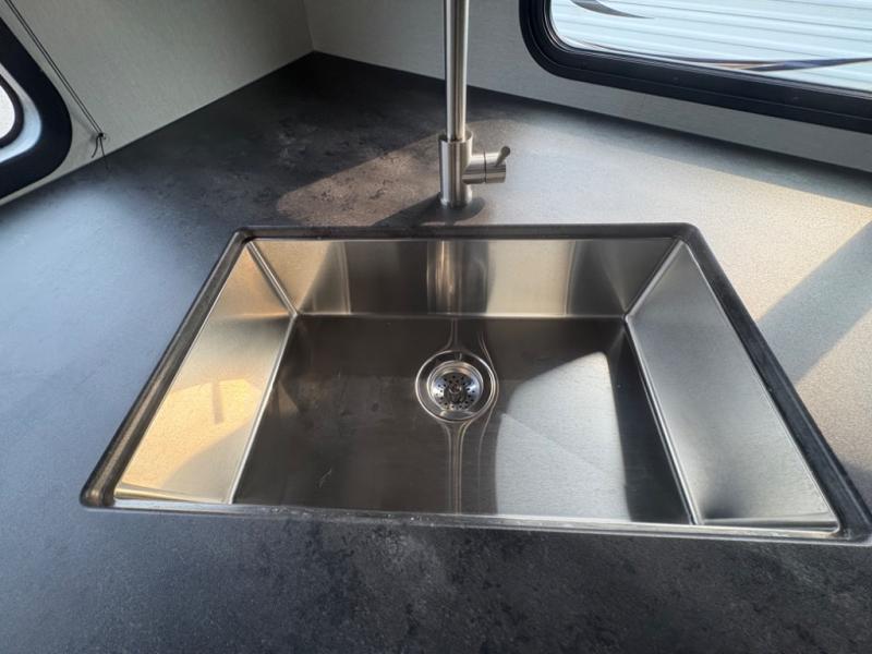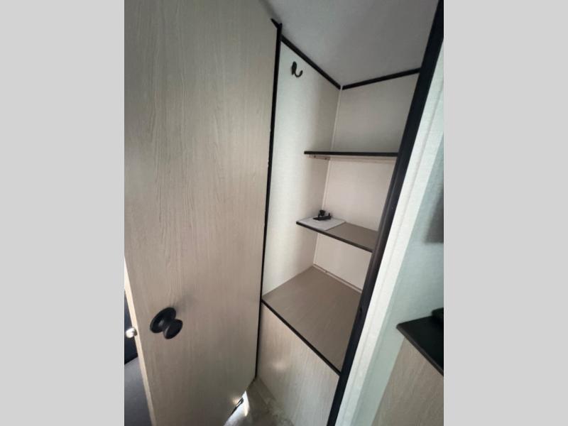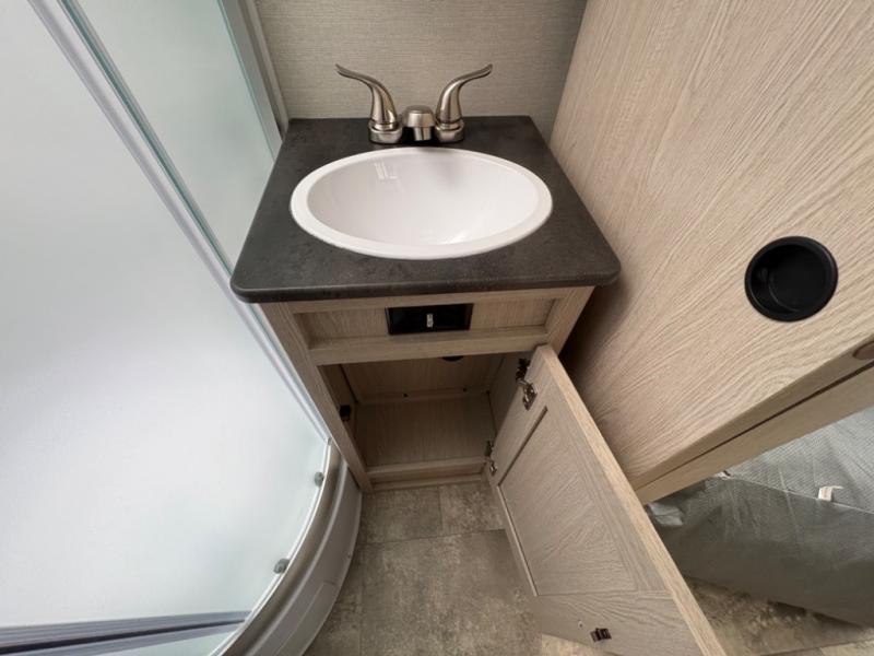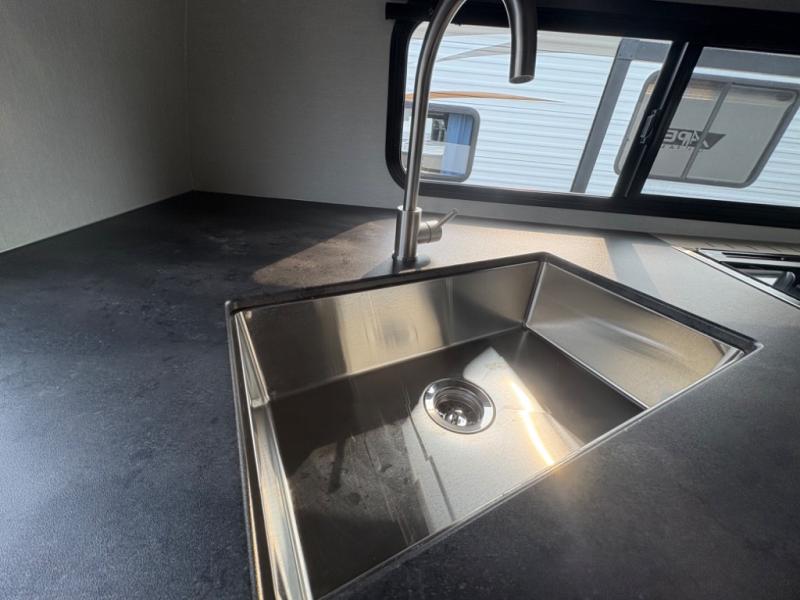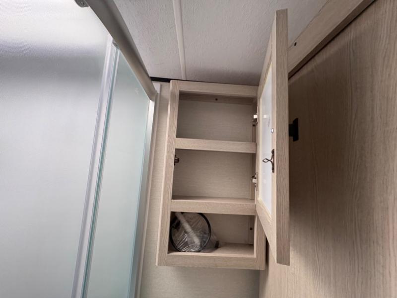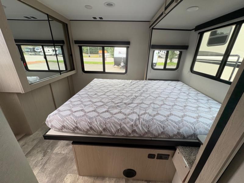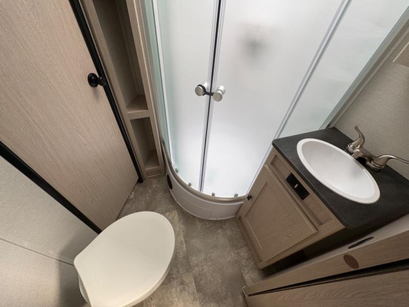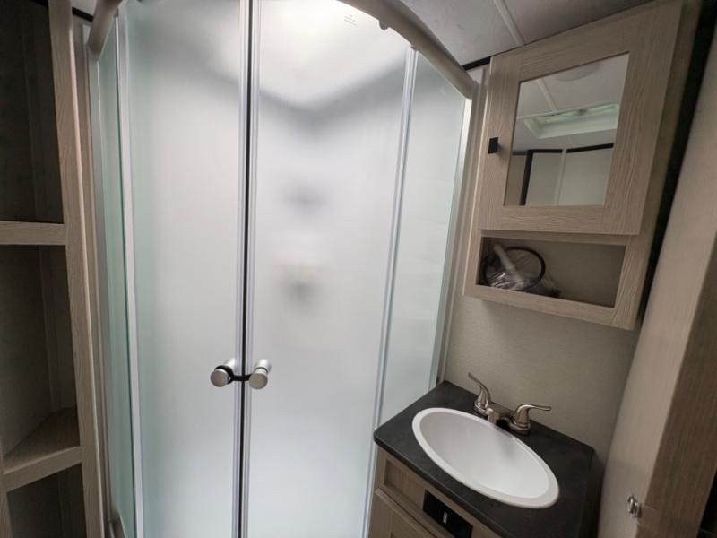 When it’s time to unwind, the private rear bedroom with a walk-around queen bed and plenty of wardrobe storage creates a cozy retreat. A full bathroom with a glass shower, vanity, and linen space adds residential-style convenience. With its lightweight build and Azdel composite construction, this model is durable, easy to tow, and designed to last.