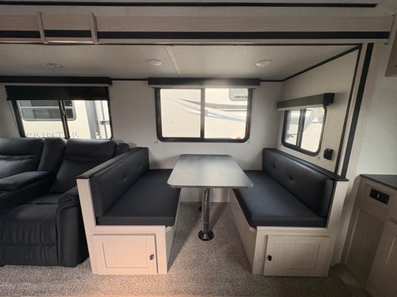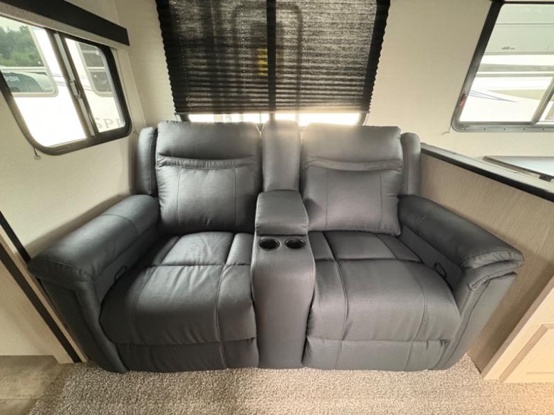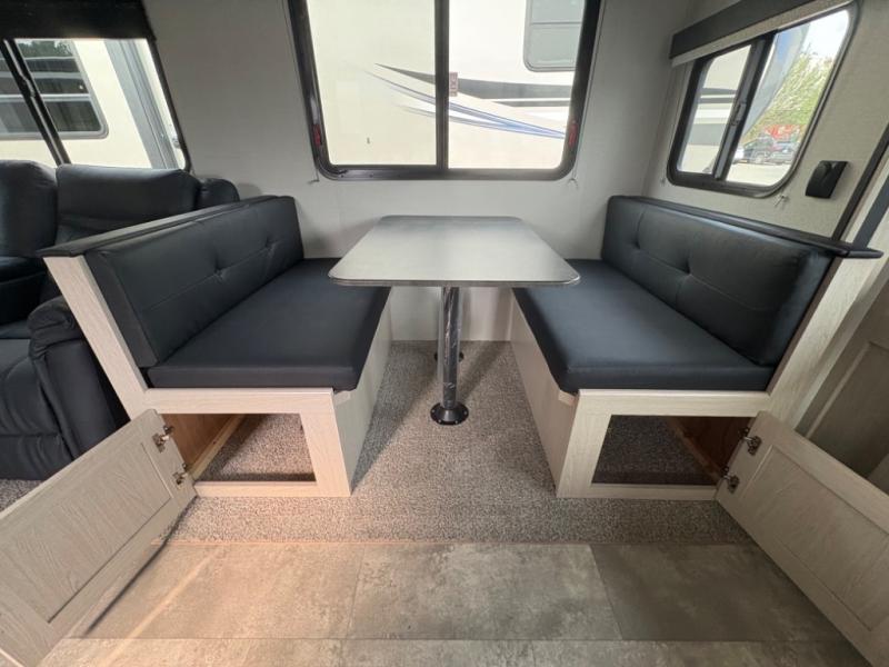 One of the standout features of the Apex Ultra-Lite 243FKS is its front kitchen layout. The spacious design includes ample counter space, a three-burner cooktop, oven, microwave, refrigerator, and storage, making it easy to prepare meals just the way you like while on the road. The open-concept living area offers a large slide-out with theater seating or sofa options, a booth dinette, and an entertainment center, ensuring comfort and relaxation after a day of exploring.