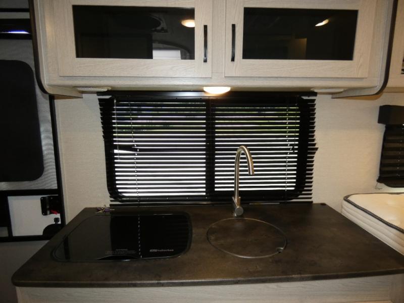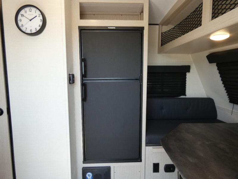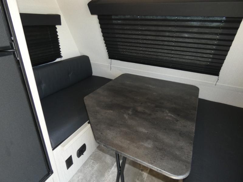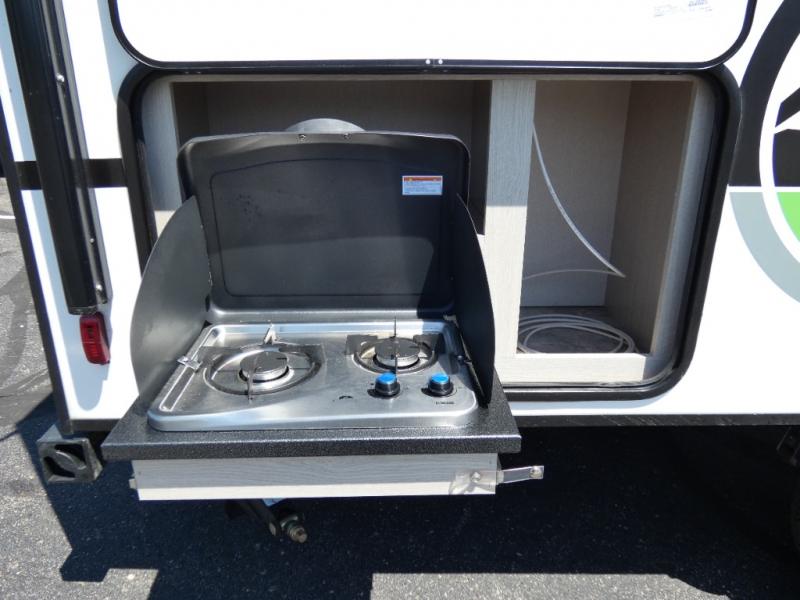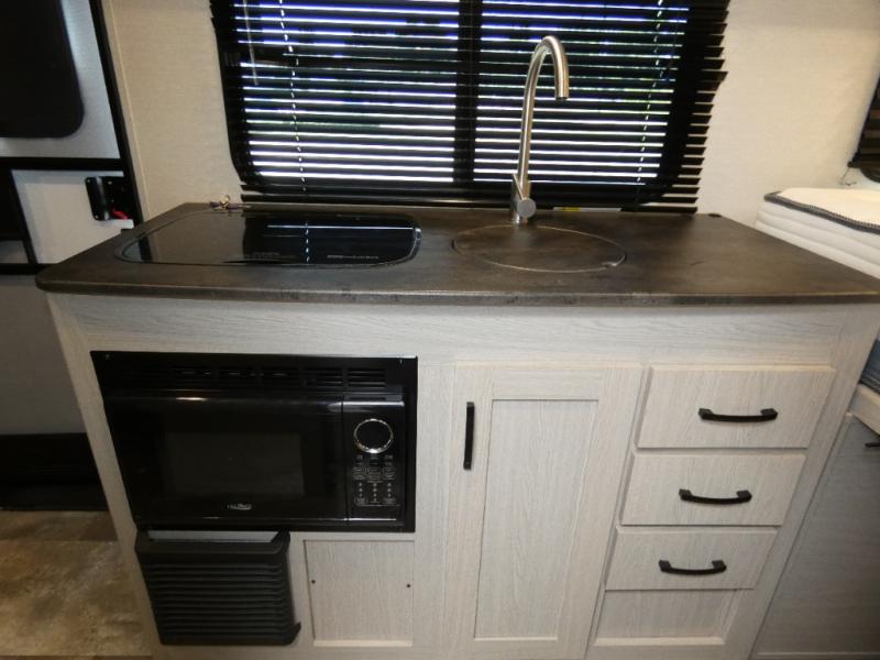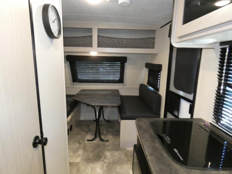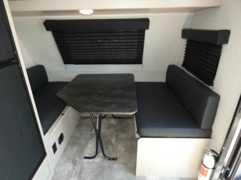 When you are ready to camp, this trailer is easy to load and tow to your favorite sites. The rear storage door allows you to carry items inside the trailer and you can leave the lifting section securely up or down depending on the space you need. There is more storage along the exterior, and you will find overhead cabinets inside, linen space in the full bathroom and your cold food can be placed in the 6 cu. ft. refrigerator. The cook will have a two burner cooktop plus a microwave inside, and a camp kitchen outside to keep everyone fed. Plus you can dine at the booth dinette which also provides sleeping space.