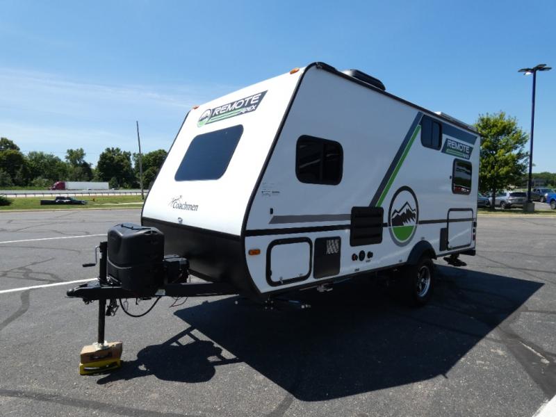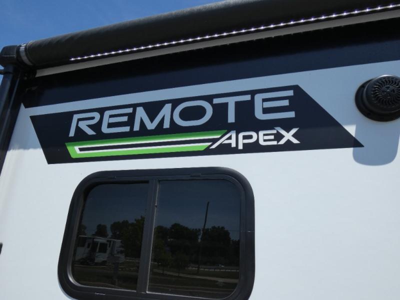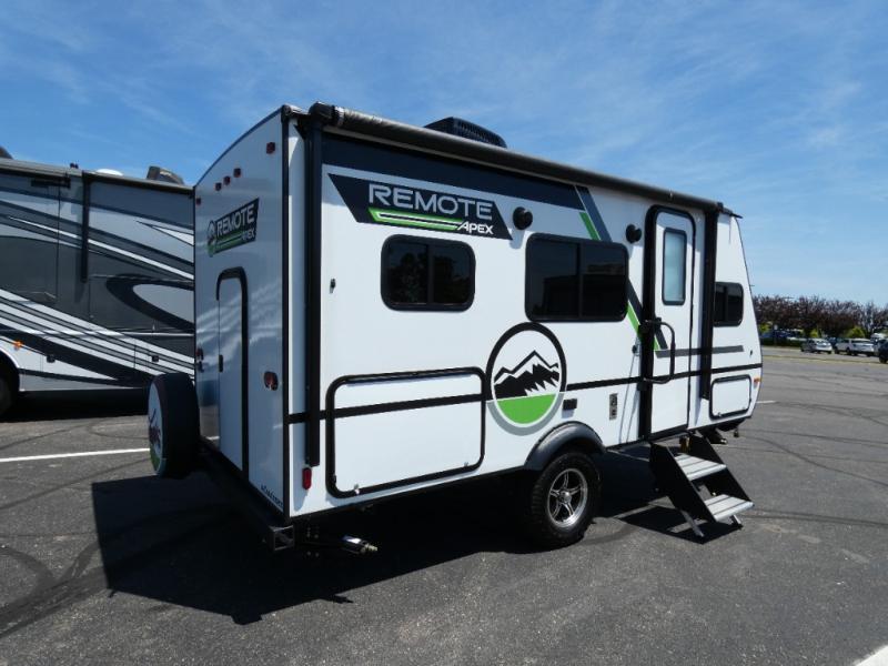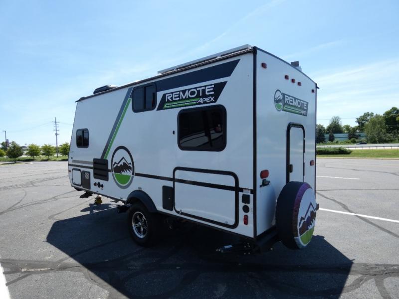 Leave the world behind you in the Apex Remote travel trailer by Coachmen RV. You will find the same comfort, convenience, and sturdy construction on this model just as you do with the Apex Nano models. There are vacuum-bonded Azdel fiberglass walls, an I-beam chassis, plus a powder coated frame that is corrosion resistant. This 7' wide travel trailer is easily towable and includes the Remote Wilderness Package with 15" all-terrain tires, a front bike rack, 12V heat pads, and much more. You will also enjoy an AM/FM stereo with Bluetooth, a hot and cold outside shower, four stabilizer jacks, plus many more amenities to make camping easier than ever!