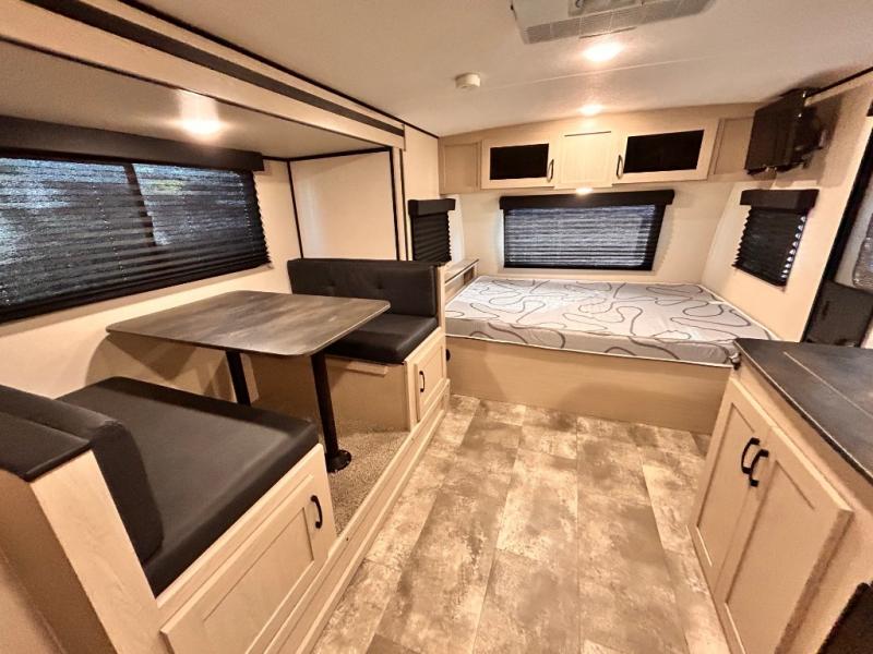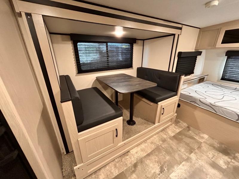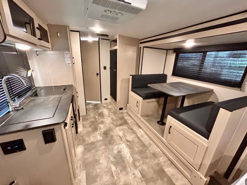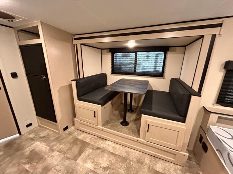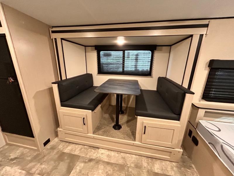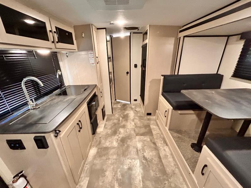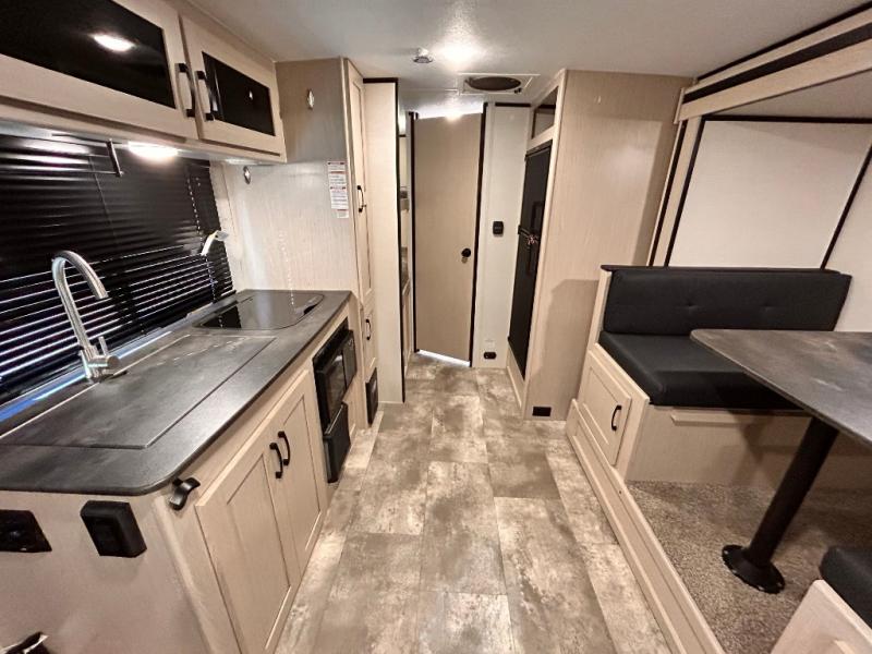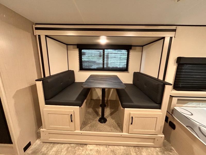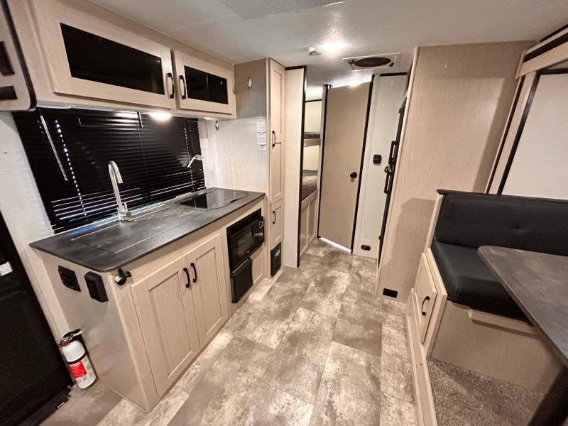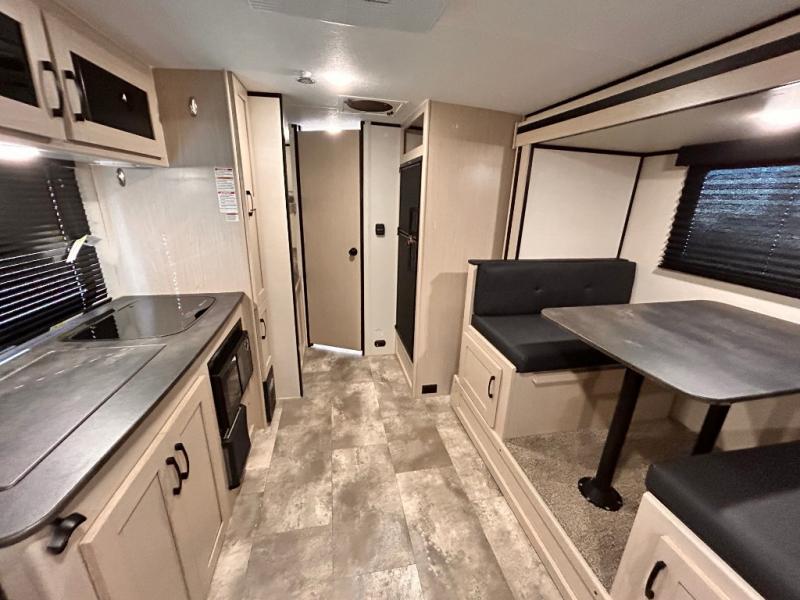 You will have more interior space with a booth dinette slide in this travel trailer! The chef will love cooking indoors with the two burner cooktop, microwave, and 6 cu. ft. gas/electric refrigerator, as well as outdoors with the exterior camp kitchen. Start each morning feeling clean and refreshed after sleeping on the front queen bed with a headboard and showering in the tub/shower inside the rear corner bathroom, plus the bathroom has a wardrobe to keep your towels close. The kids will love sleeping on the rear corner set of 30" x 74" bunk beds too!