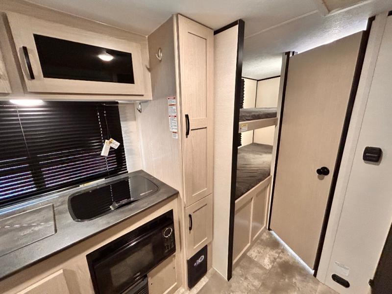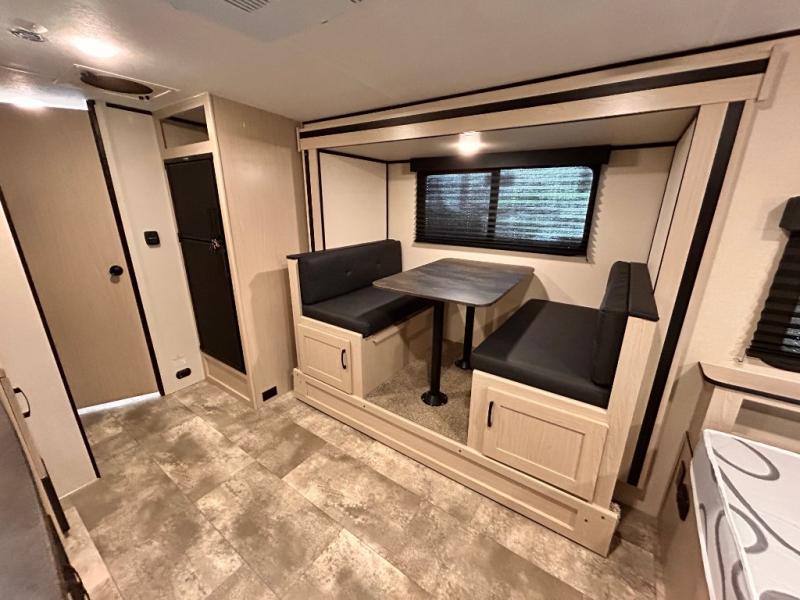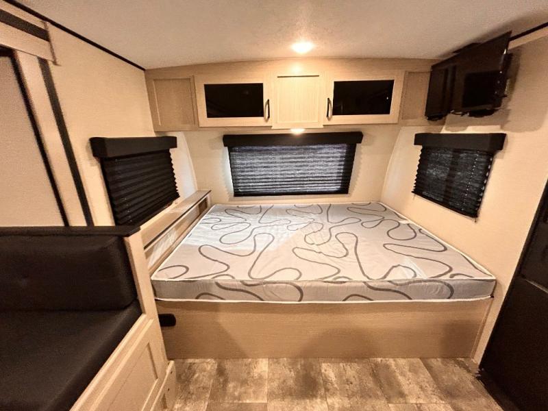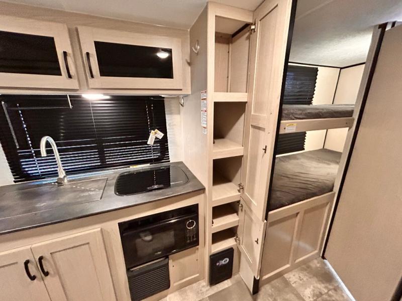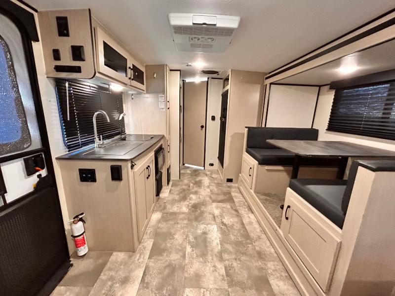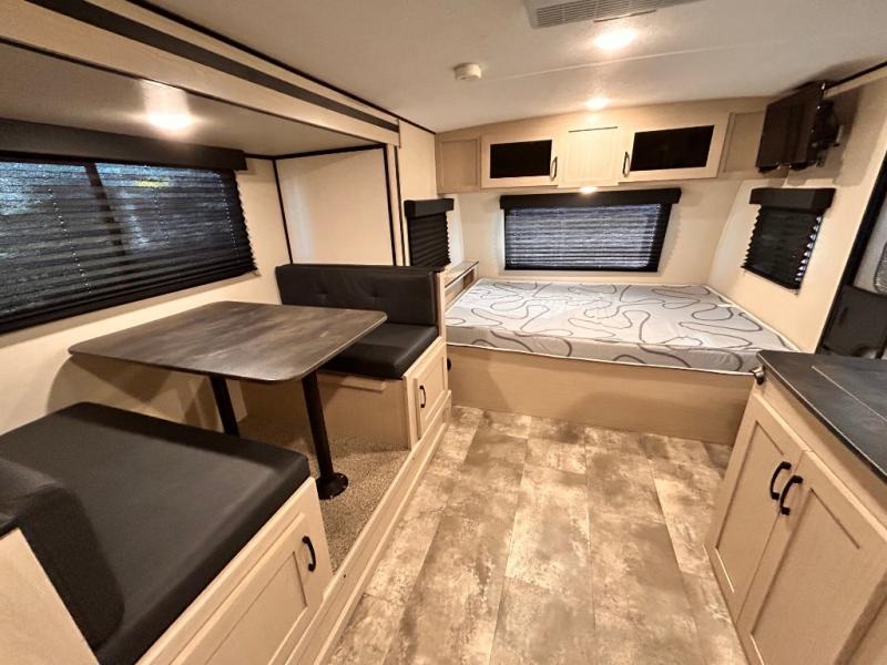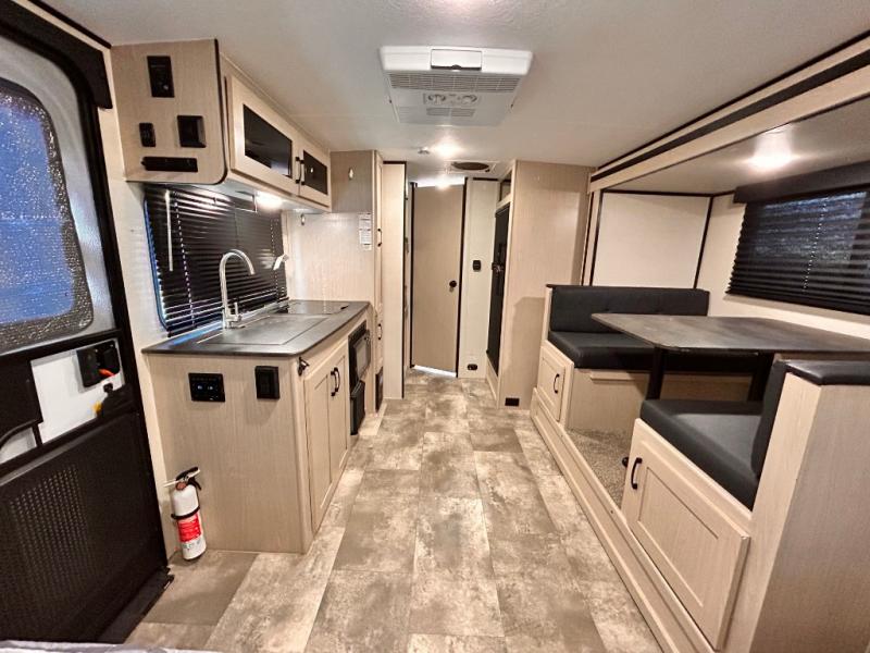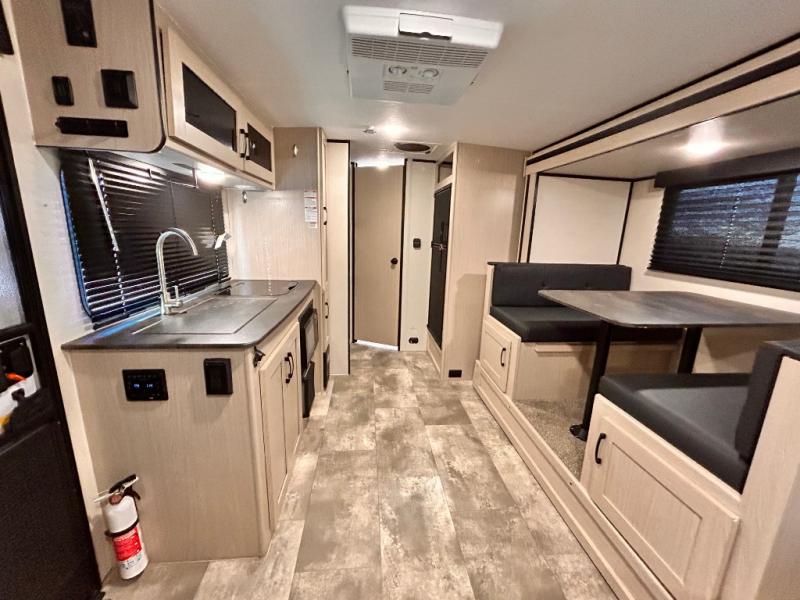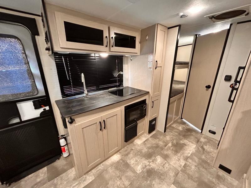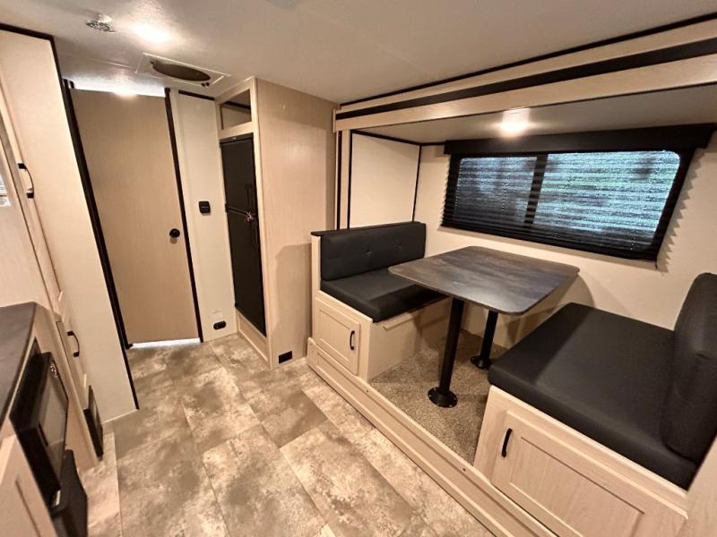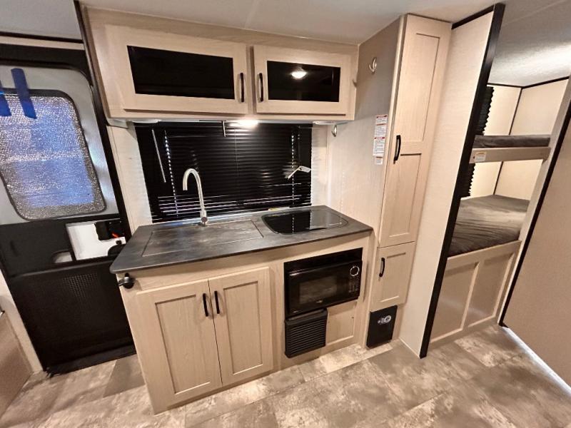 You will have more interior space with a booth dinette slide in this travel trailer! The chef will love cooking indoors with the two burner cooktop, microwave, and 6 cu. ft. gas/electric refrigerator, as well as outdoors with the exterior camp kitchen. Start each morning feeling clean and refreshed after sleeping on the front queen bed with a headboard and showering in the tub/shower inside the rear corner bathroom, plus the bathroom has a wardrobe to keep your towels close. The kids will love sleeping on the rear corner set of 30" x 74" bunk beds too!