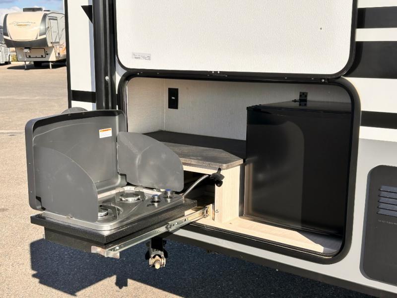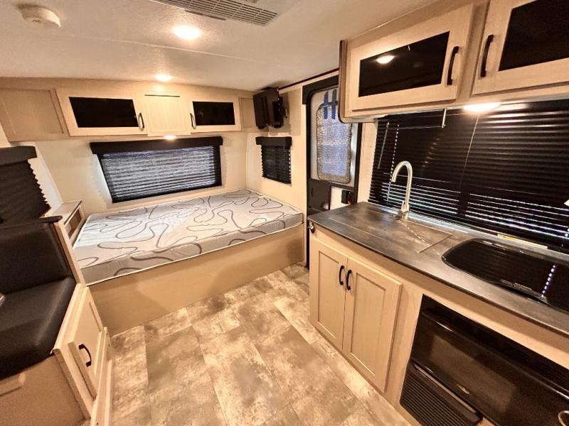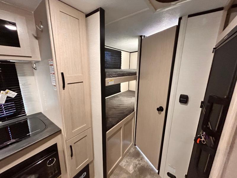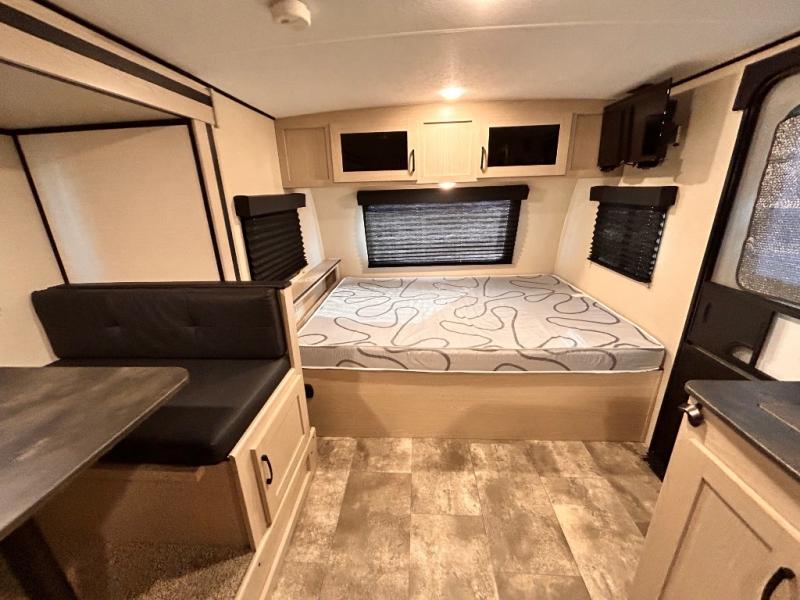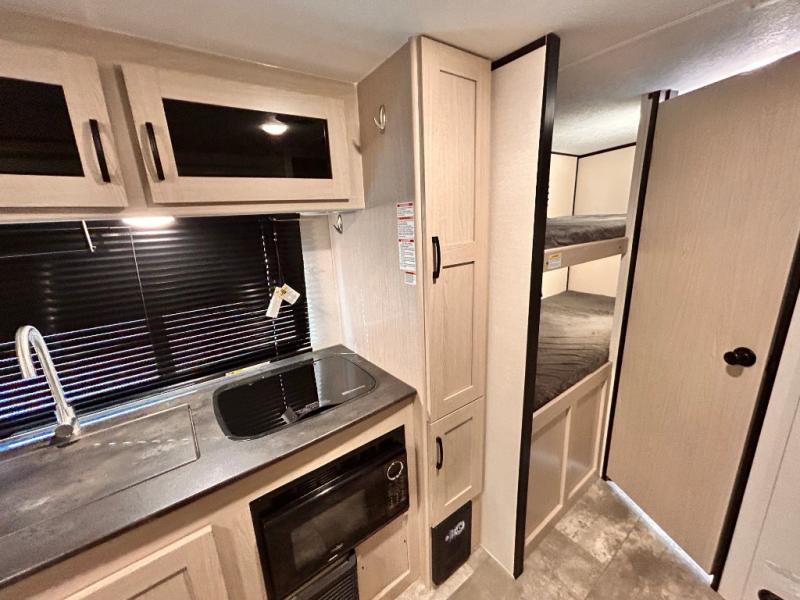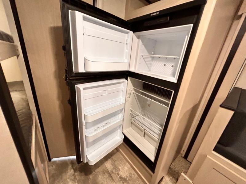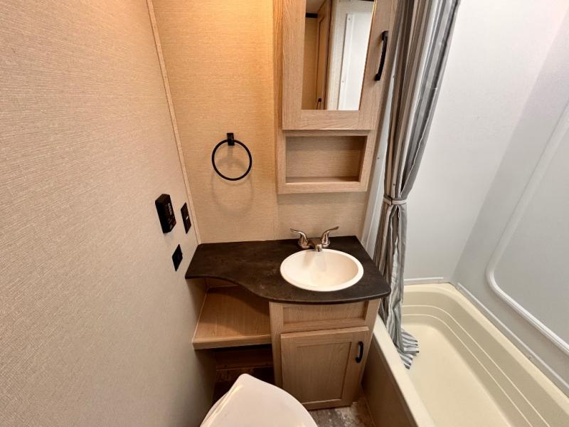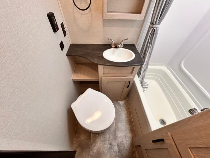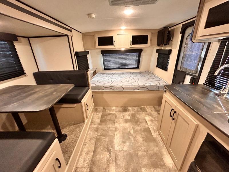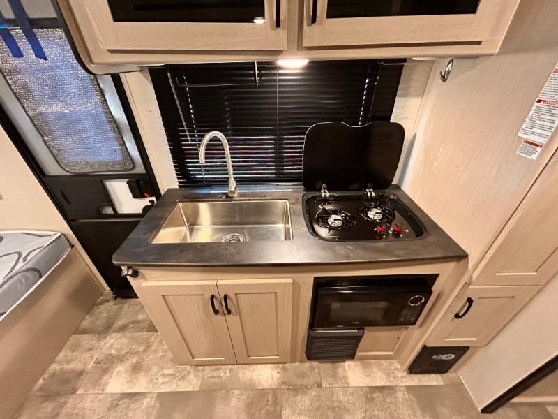 You will have more interior space with a booth dinette slide in this travel trailer! The chef will love cooking indoors with the two burner cooktop, microwave, and 6 cu. ft. gas/electric refrigerator, as well as outdoors with the exterior camp kitchen. Start each morning feeling clean and refreshed after sleeping on the front queen bed with a headboard and showering in the tub/shower inside the rear corner bathroom, plus the bathroom has a wardrobe to keep your towels close. The kids will love sleeping on the rear corner set of 30" x 74" bunk beds too!