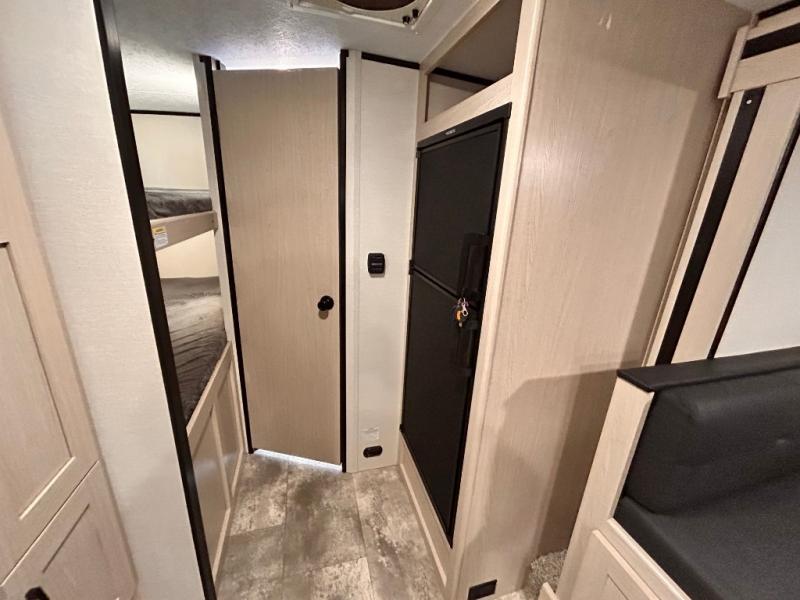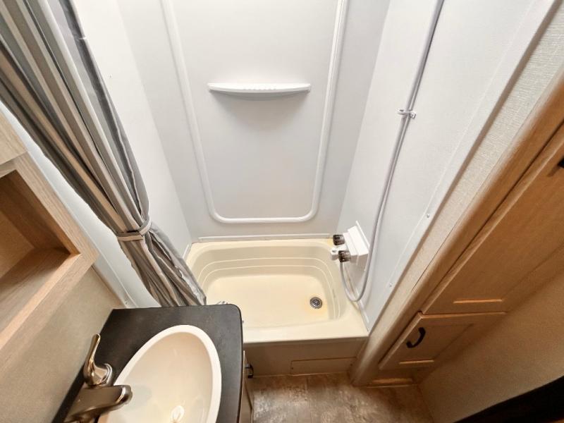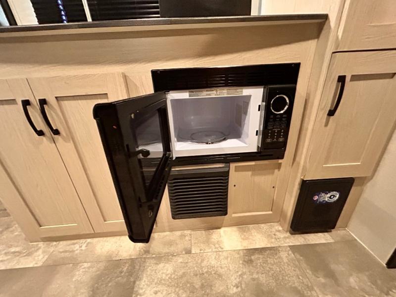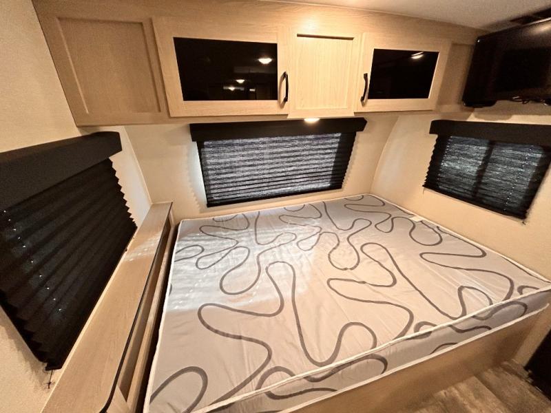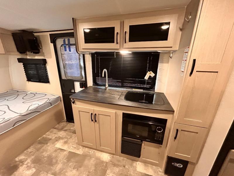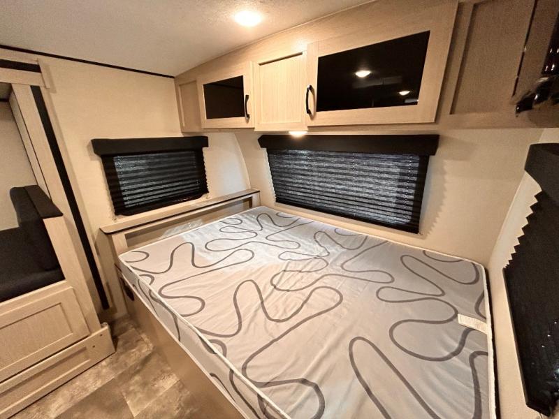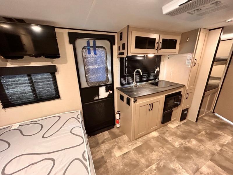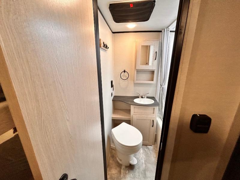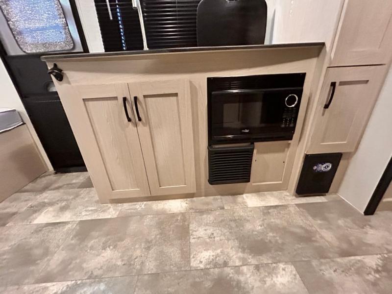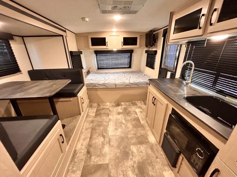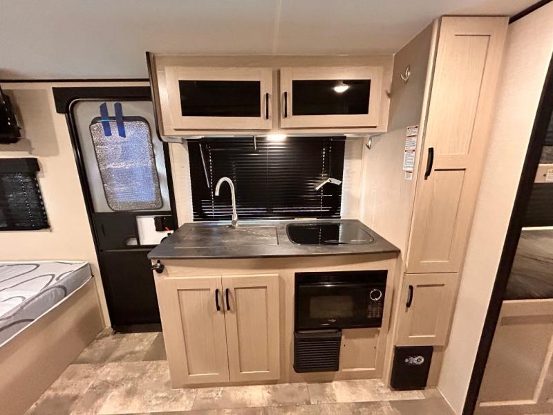 You will have more interior space with a booth dinette slide in this travel trailer! The chef will love cooking indoors with the two burner cooktop, microwave, and 6 cu. ft. gas/electric refrigerator, as well as outdoors with the exterior camp kitchen. Start each morning feeling clean and refreshed after sleeping on the front queen bed with a headboard and showering in the tub/shower inside the rear corner bathroom, plus the bathroom has a wardrobe to keep your towels close. The kids will love sleeping on the rear corner set of 30" x 74" bunk beds too!