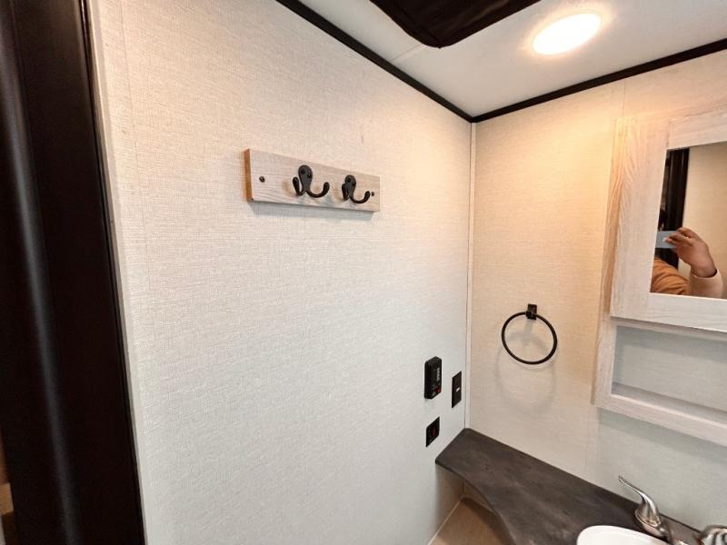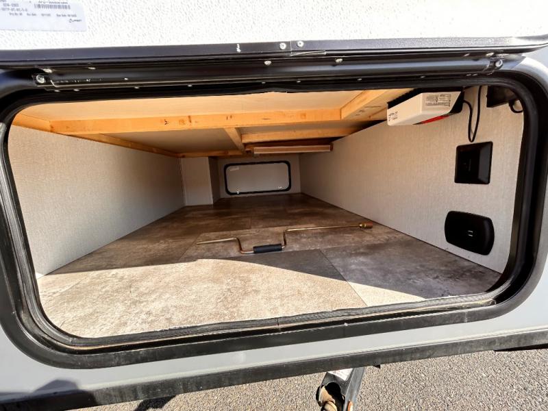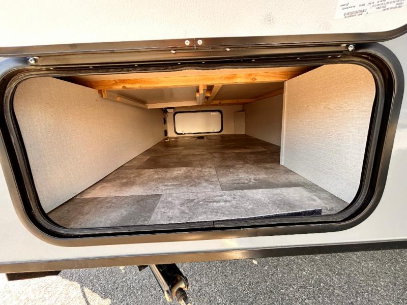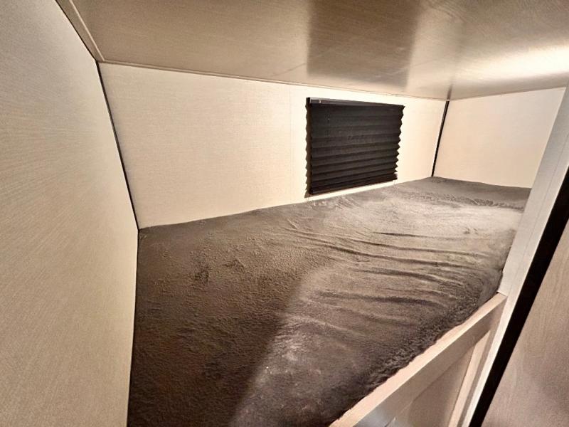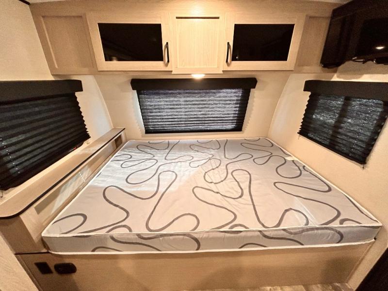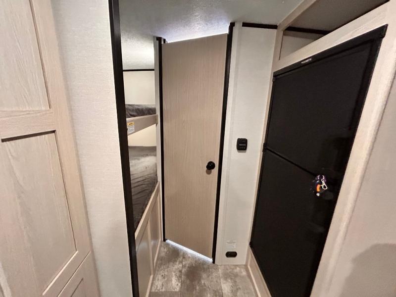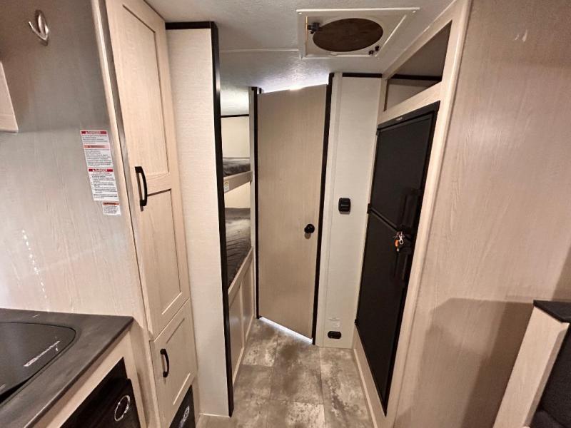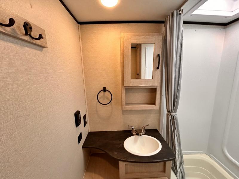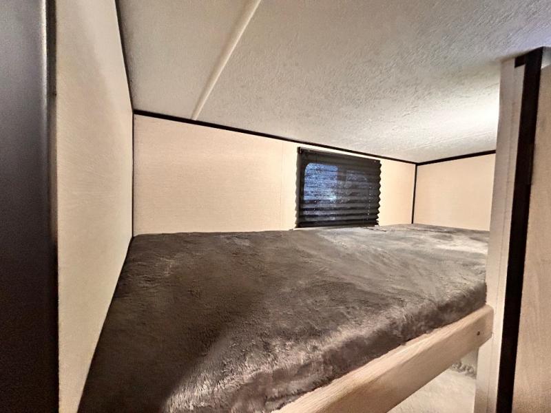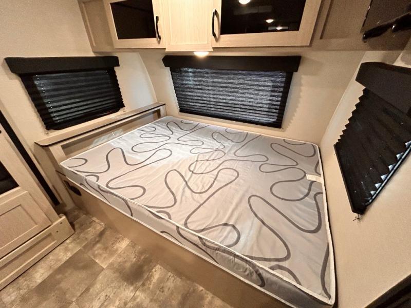 You will have more interior space with a booth dinette slide in this travel trailer! The chef will love cooking indoors with the two burner cooktop, microwave, and 6 cu. ft. gas/electric refrigerator, as well as outdoors with the exterior camp kitchen. Start each morning feeling clean and refreshed after sleeping on the front queen bed with a headboard and showering in the tub/shower inside the rear corner bathroom, plus the bathroom has a wardrobe to keep your towels close. The kids will love sleeping on the rear corner set of 30" x 74" bunk beds too!
