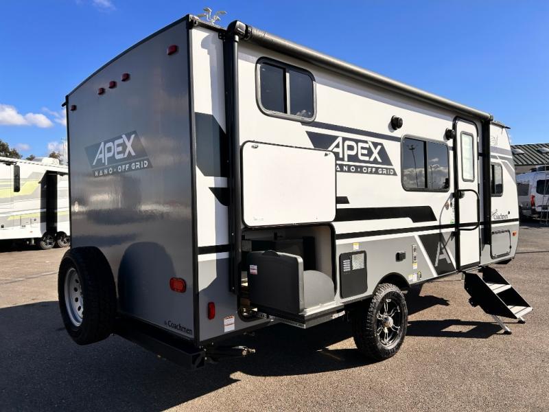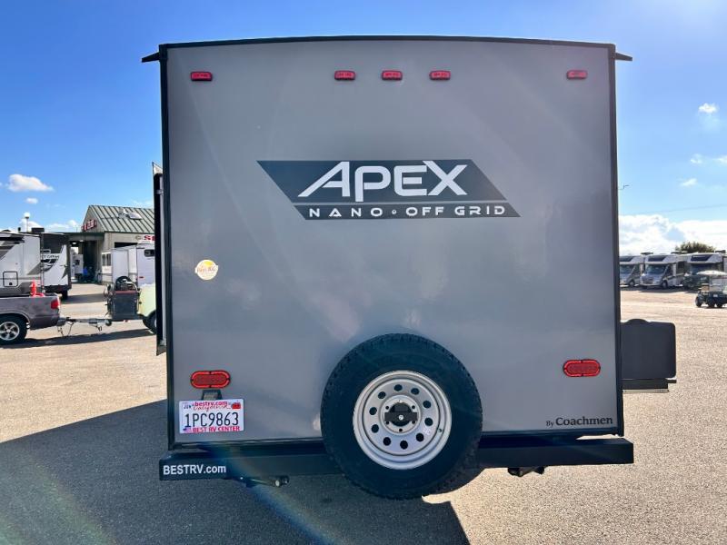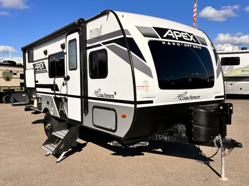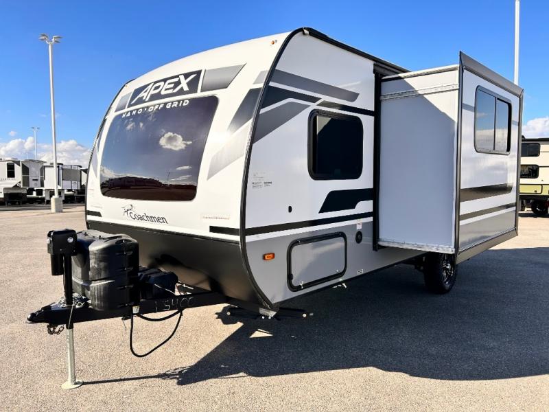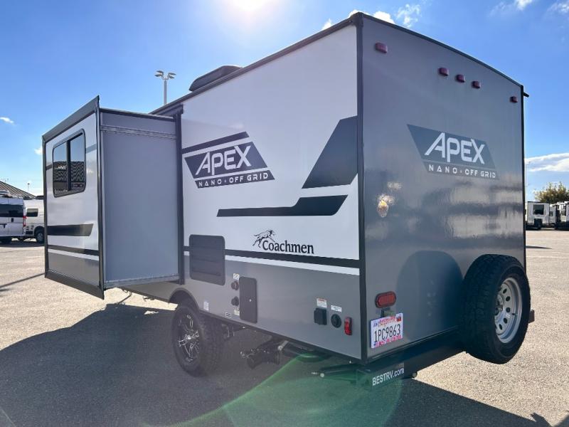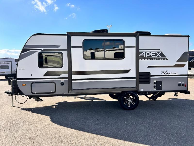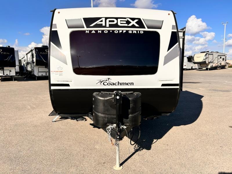 You will find comfort, convenience, and a sturdy construction with each of these Coachmen RV Apex Nano travel trailers! They are held together with an aluma-cage construction, vacuum-bonded Azdel fiberglass walls, an I-beam chassis, and a roof membrane with Dicor Crossflex, plus the powder coated frame is corrosion resistant. The Dexter E-Z lube axles and nitrogen filled radial tires will help you arrive safely. The mandatory Nano package comes with many features to make camp life better like magnetic baggage door catches, outside speakers, a digital TV antenna with cable hook-ups and WiFi capability, and a hot/cold outside shower to keep the dirt outside where it belongs. Come find the perfect model that fits your needs today!