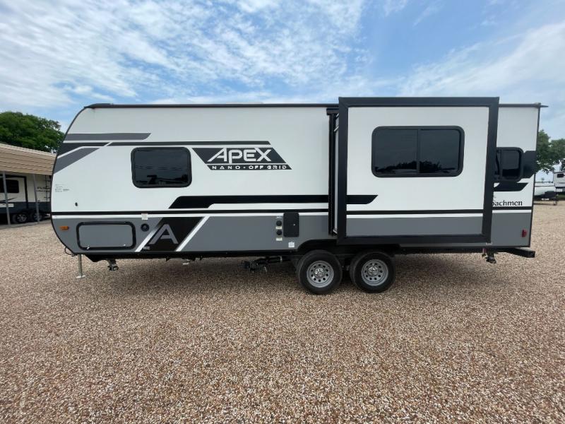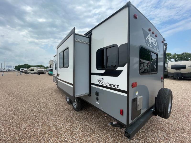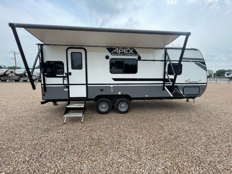 You will find comfort, convenience, and a sturdy construction with each of these Coachmen RV Apex Nano travel trailers! They are held together with an aluma-cage construction, vacuum-bonded Azdel fiberglass walls, an I-beam chassis, and a roof membrane with Dicor Crossflex, plus the powder coated frame is corrosion resistant. The Dexter E-Z lube axles and nitrogen filled radial tires will help you arrive safely. The mandatory Nano package comes with many features to make camp life better like magnetic baggage door catches, outside speakers, a digital TV antenna with cable hook-ups and WiFi capability, and a hot/cold outside shower to keep the dirt outside where it belongs. Come find the perfect model that fits your needs today!