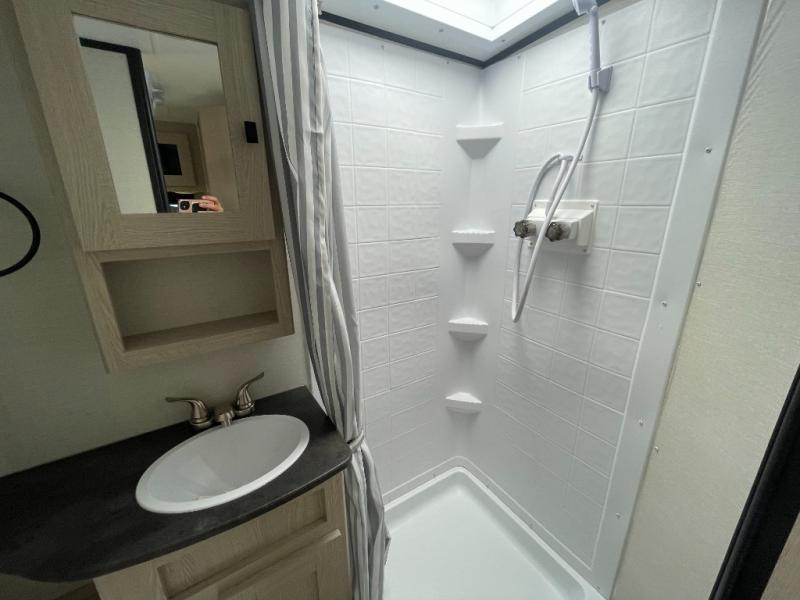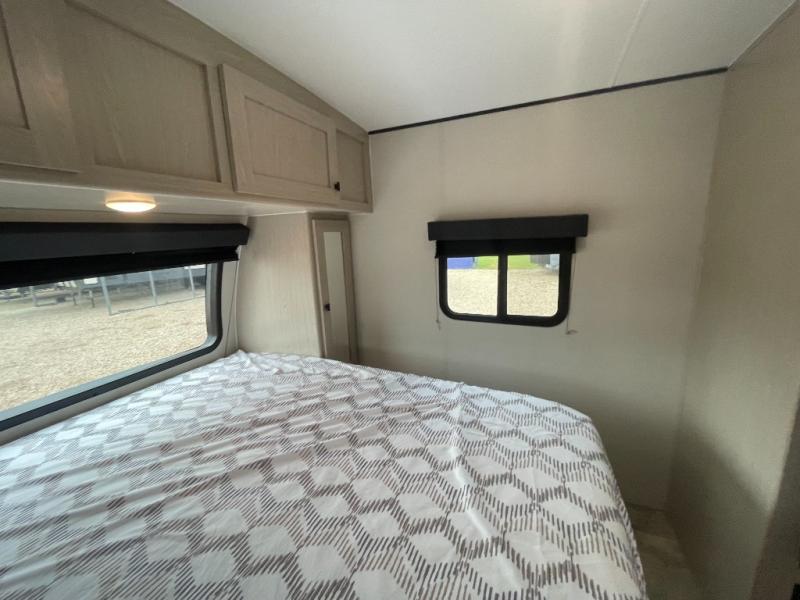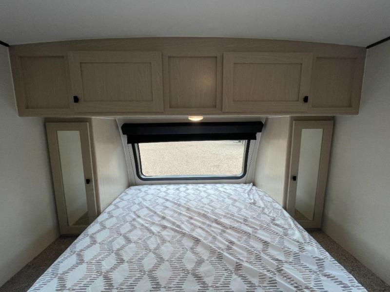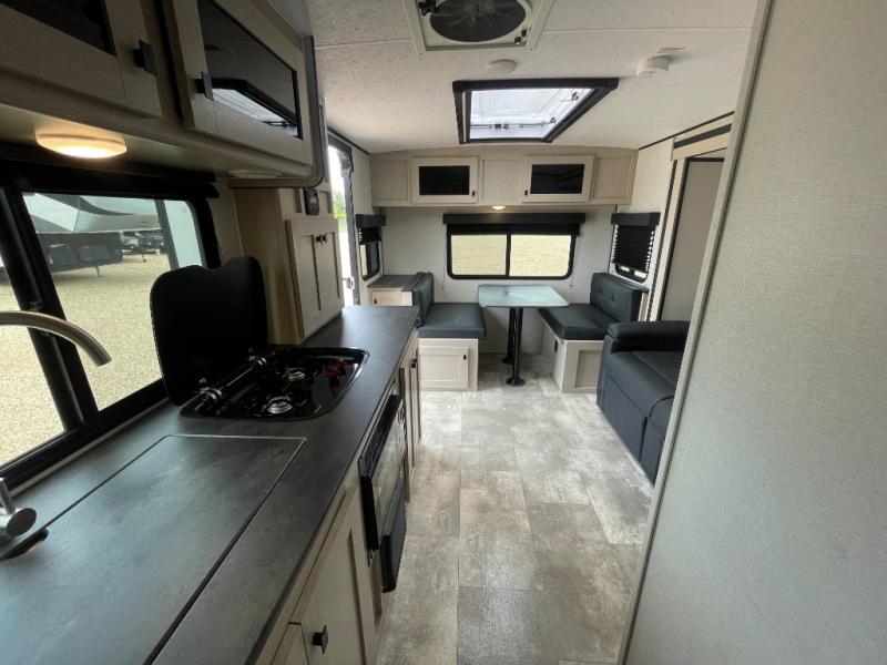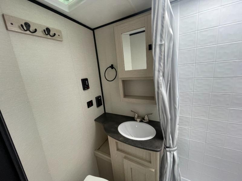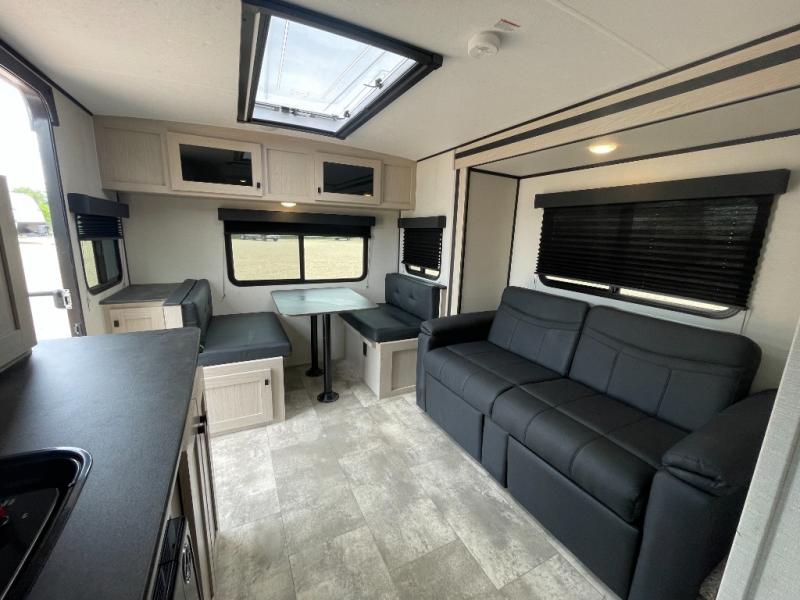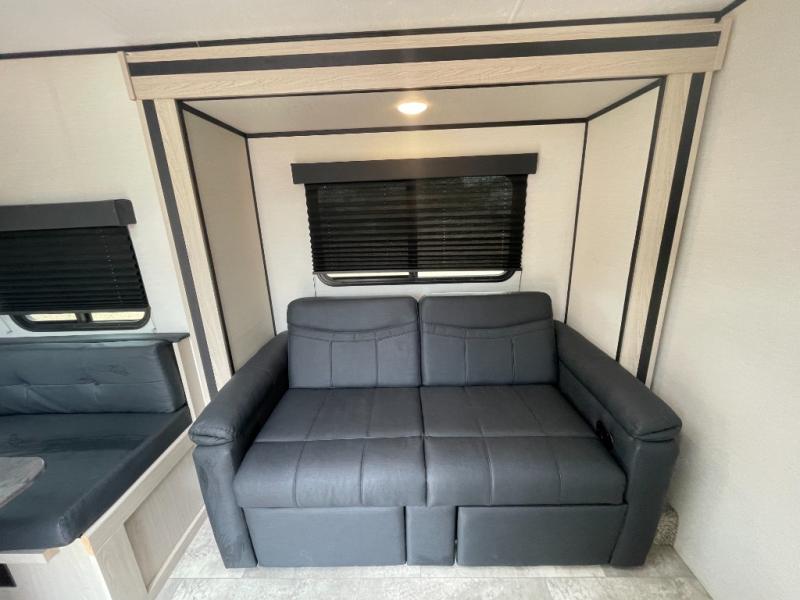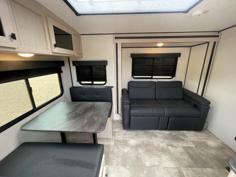 Escape the hustle and bustle of everyday life with this travel trailer! You will start each morning feeling recharged after sleeping on the front queen bed with wardrobes on either side to keep your clothes looking nice. The full bathroom has a neo-angled shower for you to freshen up and a medicine cabinet to store your toiletries. The sofa slide is across from the entertainment center for a comfortable movie night or you can play some card games at the rear booth dinette with an end table on one side.