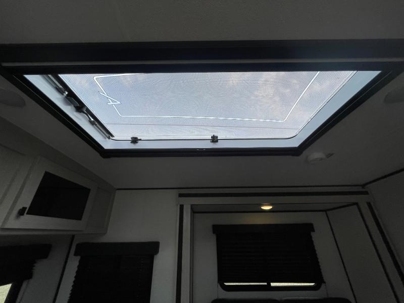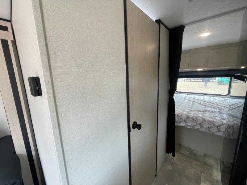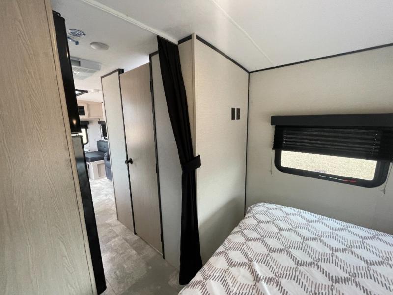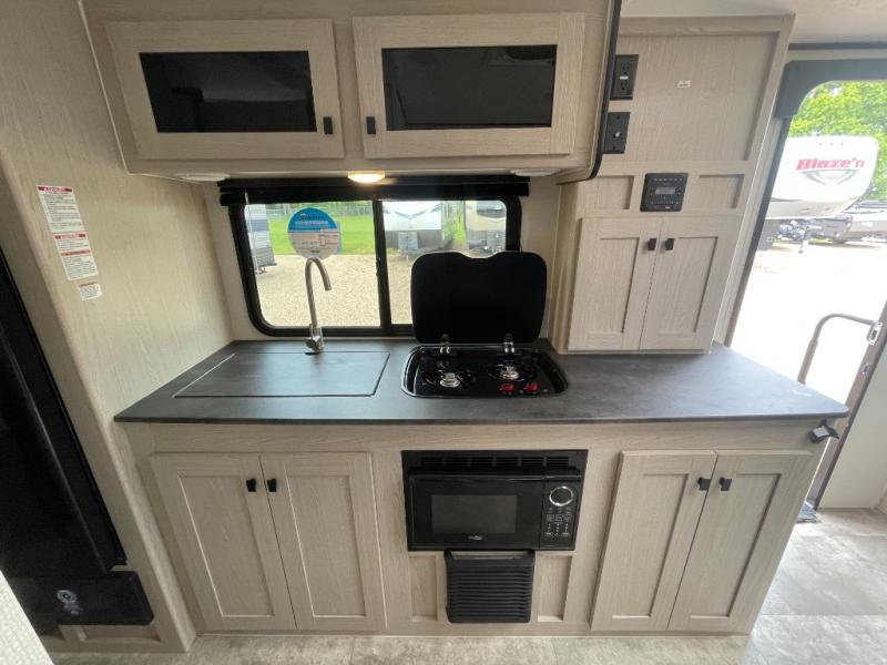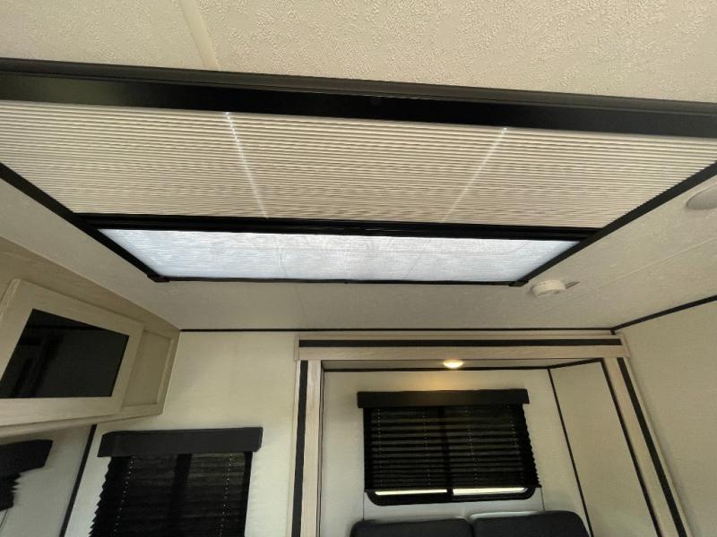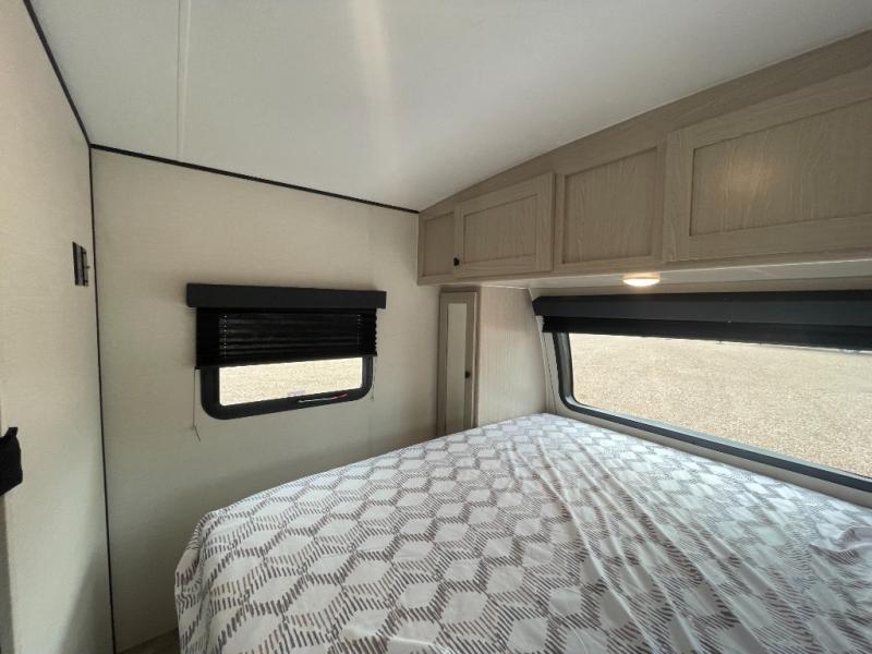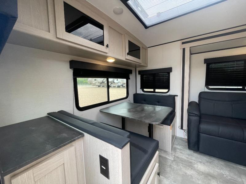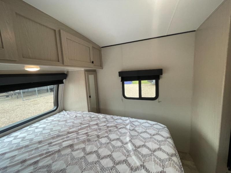 Escape the hustle and bustle of everyday life with this travel trailer! You will start each morning feeling recharged after sleeping on the front queen bed with wardrobes on either side to keep your clothes looking nice. The full bathroom has a neo-angled shower for you to freshen up and a medicine cabinet to store your toiletries. The sofa slide is across from the entertainment center for a comfortable movie night or you can play some card games at the rear booth dinette with an end table on one side.
