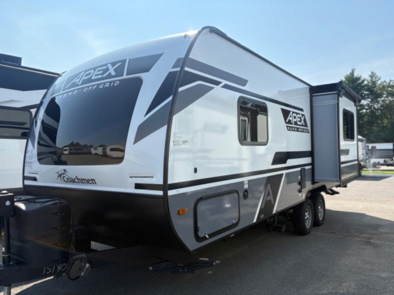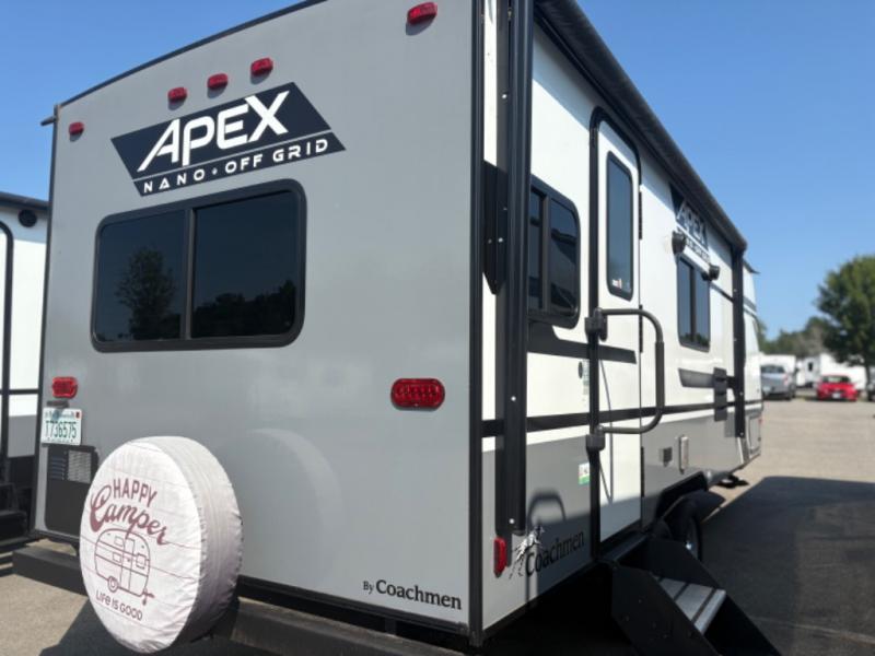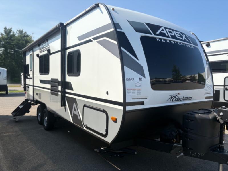 You will find comfort, convenience, and a sturdy construction with each of these Coachmen RV Apex Nano travel trailers! They are held together with an aluma-cage construction, vacuum-bonded Azdel fiberglass walls, an I-beam chassis, and a roof membrane with Dicor Crossflex, plus the powder coated frame is corrosion resistant. The Dexter E-Z lube axles and nitrogen filled radial tires will help you arrive safely. The mandatory Nano package comes with many features to make camp life better like magnetic baggage door catches, outside speakers, a digital TV antenna with cable hook-ups and WiFi capability, and a hot/cold outside shower to keep the dirt outside where it belongs. Come find the perfect model that fits your needs today!
