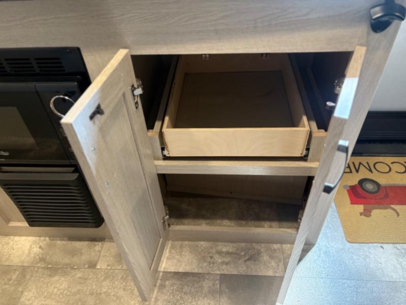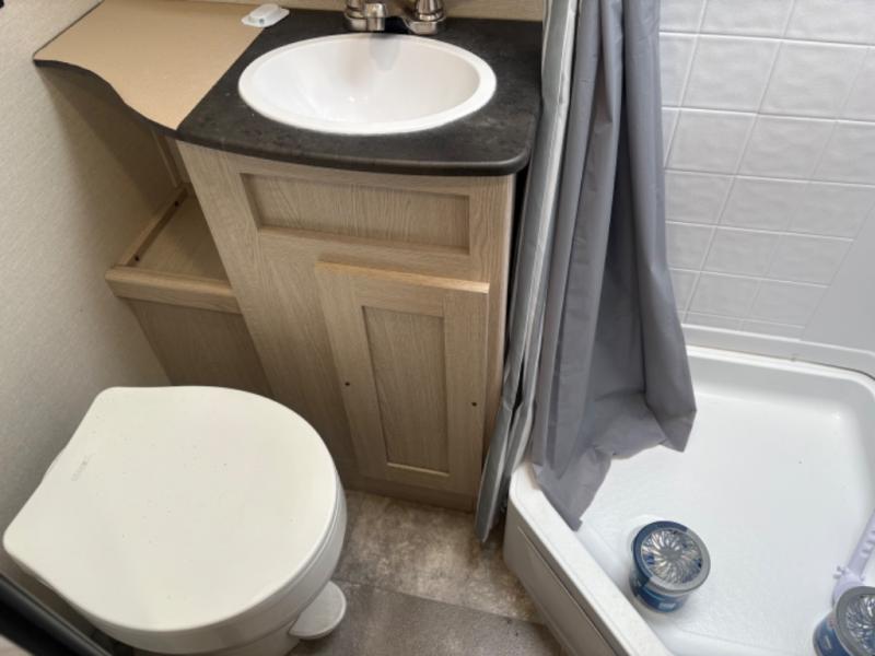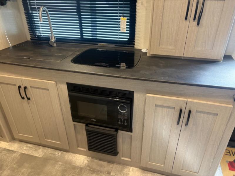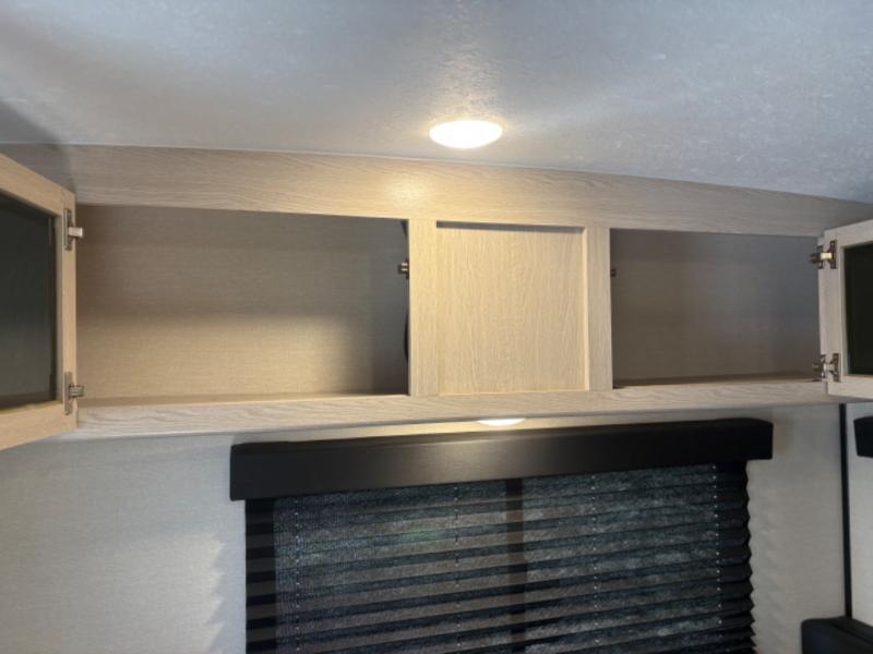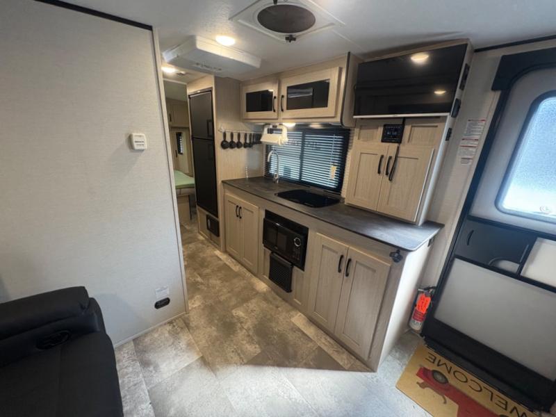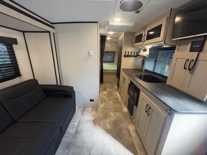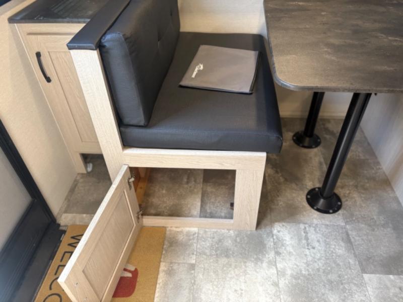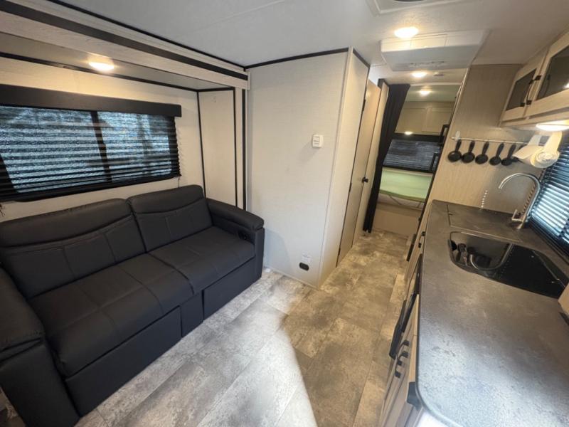 Escape the hustle and bustle of everyday life with this travel trailer! You will start each morning feeling recharged after sleeping on the front queen bed with wardrobes on either side to keep your clothes looking nice. The full bathroom has a neo-angled shower for you to freshen up and a medicine cabinet to store your toiletries. The sofa slide is across from the entertainment center for a comfortable movie night or you can play some card games at the rear booth dinette with an end table on one side.