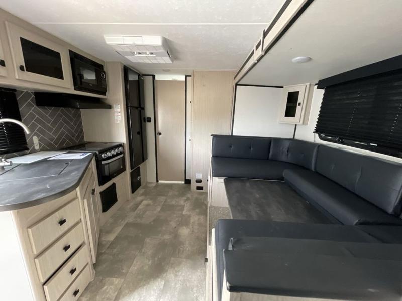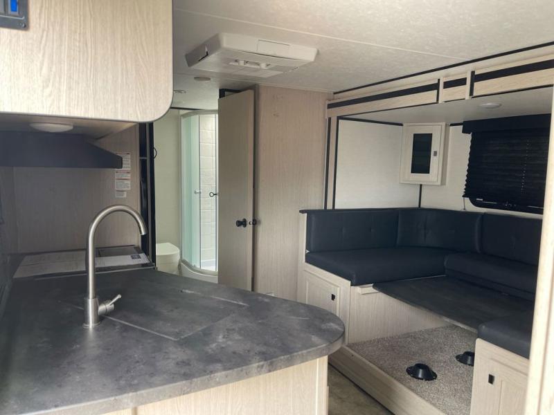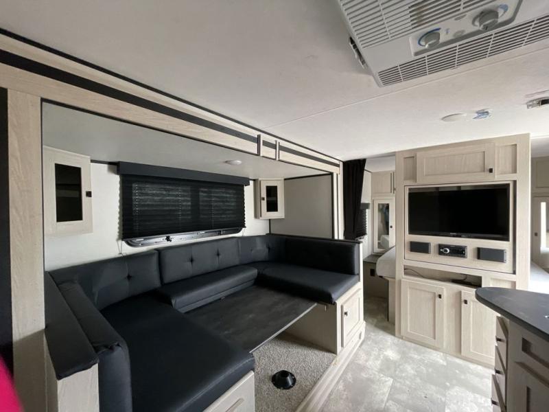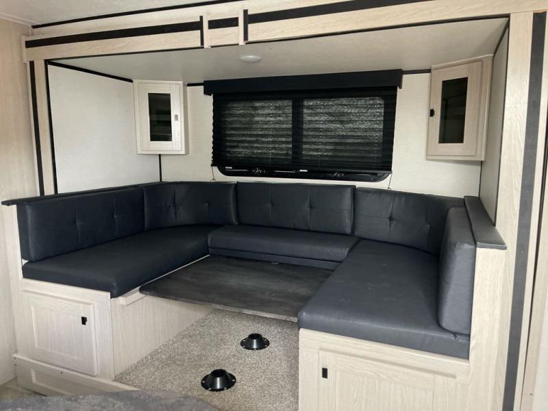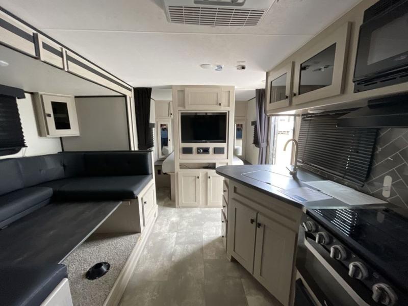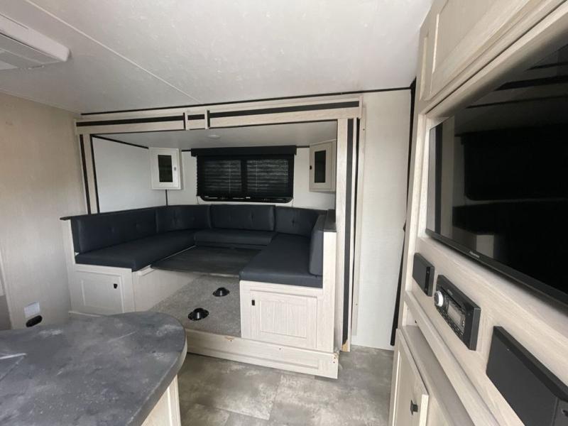 Easy to tow so you can get up and go! The U-shaped dinette slide will not only be a favorite spot to dine and play games, but will also double as additional sleeping space. There is a full interior kitchen, plus an outdoor kitchen that is perfect for breakfast outdoors. When you're ready to come in for the night, head to the spacious full rear bath to clean up, and the front bedroom will make this unit feel more like home with its queen bed and dual wardrobes!