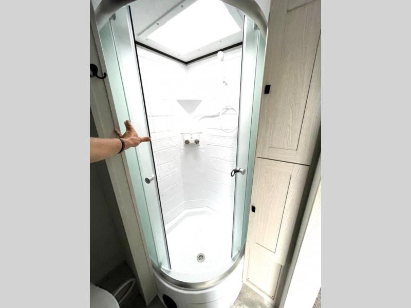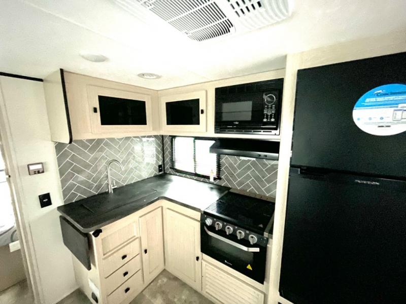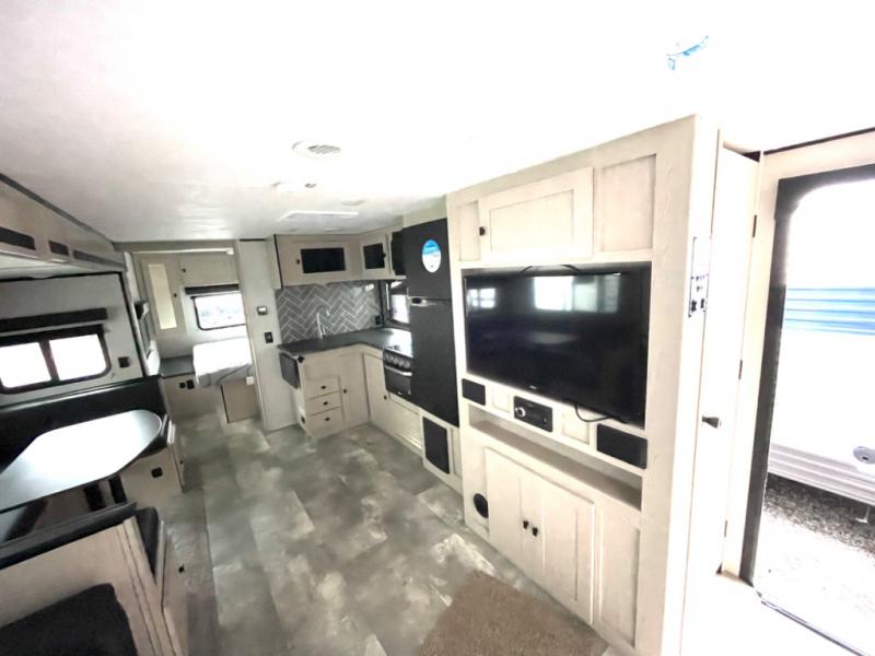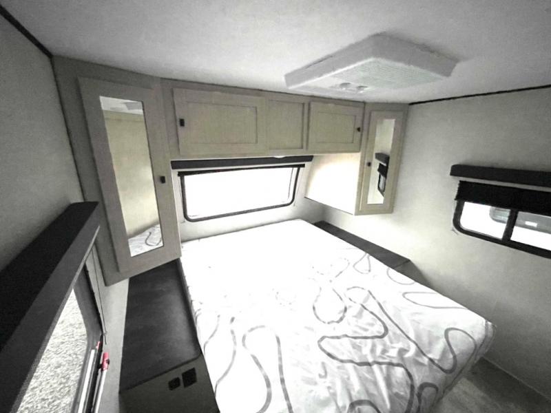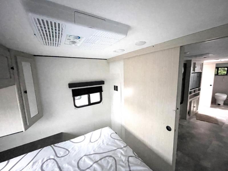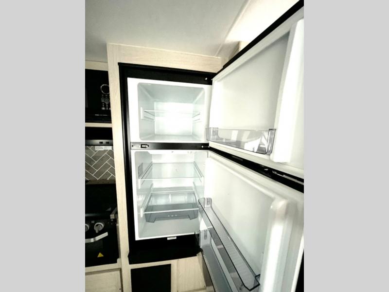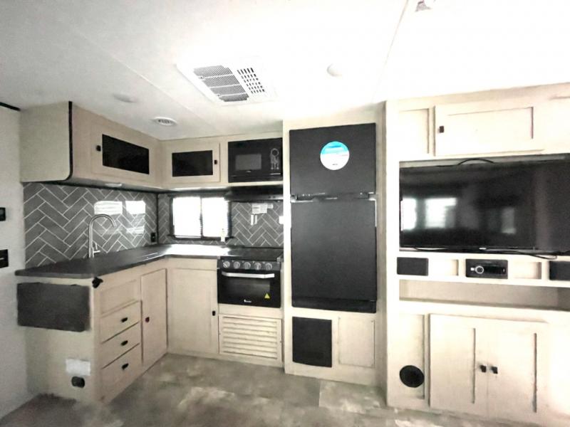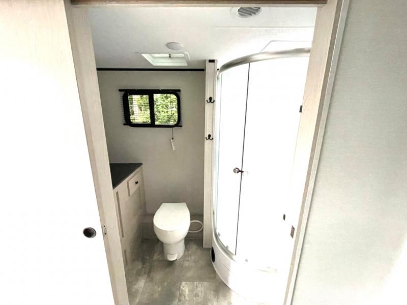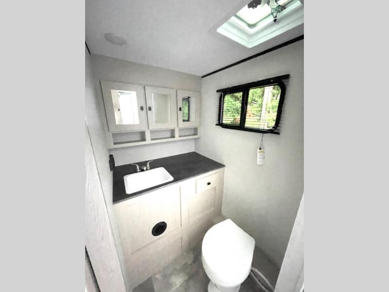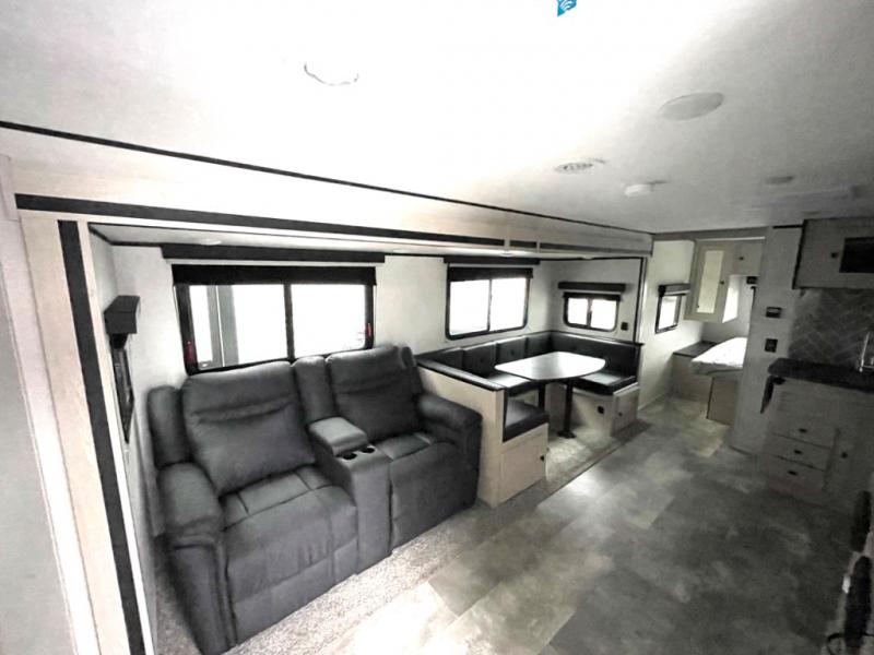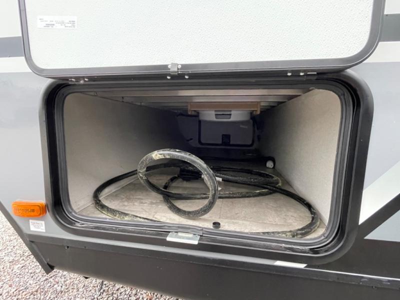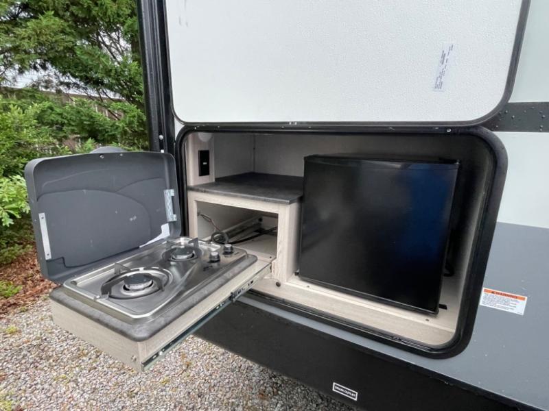 You won't be roughing it on camping trips with this spacious travel trailer. Once you arrive at the lake, make a quick lunch on the exterior camp kitchen, set up the 18' power awning, then grab the fishing poles from the pass-through storage! When you get back from fishing you can clean up in the full rear bath, then relax on the sofa or play a game around the U-shaped dinette. You will love the amount of storage space you have in this trailer with plenty of overhead cabinets, dual bedroom wardrobes, plus an entryway walk-in closet with shelves for jackets, food, and shoes!