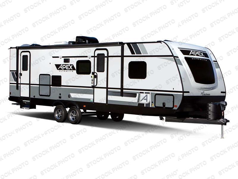 Lightweight living and camping is found with the Apex Ultra-Lite travel trailers by Coachmen. These eco-friendly units are made to last thanks to the Azdel composite sidewalls, the laminated aluminum floor, and the vacuum-bonded laminated crowned roof. Lippert axles and nitrogen filled radial tires make towing easier than ever, plus there is a friction hinge entrance door, a 100-watt solar panel with a 10 Amp control charger, and slam latch baggage door catches for easy unloading. Some of the interior comforts you'll fall in love with are the one-piece seamless edge countertops, the hard valances with night shades throughout, the matte black hardware, and the residential comforter. The Apex Ultra-Lite trailers also include USB ports, a digital TV antenna with cable hook-ups and Wi-Fi capability, and an AM/FM stereo with Bluetooth to ensure you'll never be bored on rainy camp days!