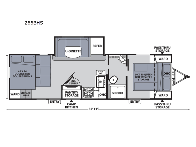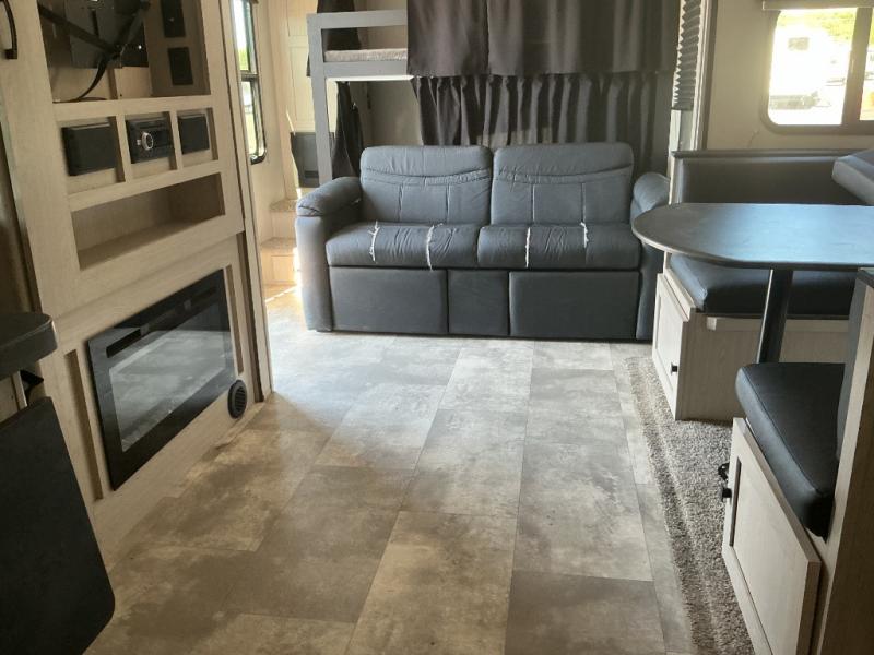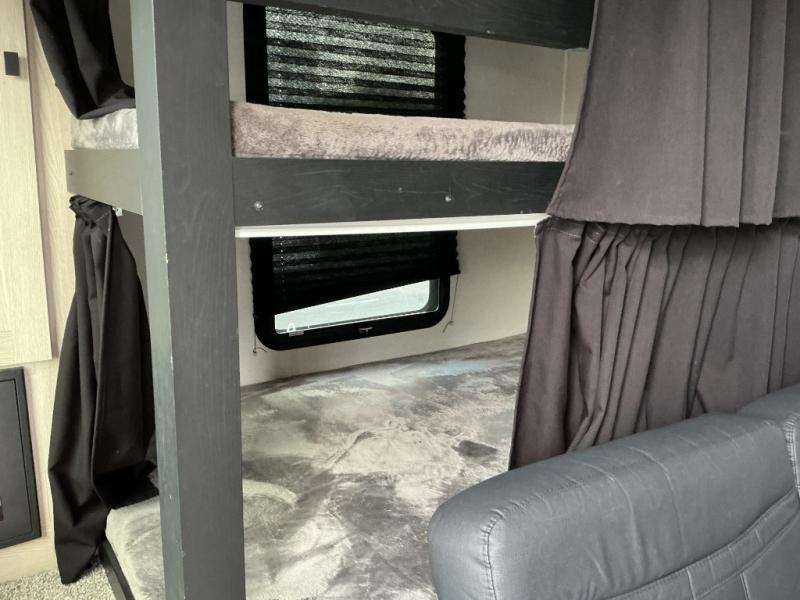 Camping with family or a larger group of friends is easier than ever in this dual entry trailer that can sleep nine people comfortably. The little ones will love the double-size bunks with storage steps, and you'll have the queen bed with super storage all to yourselves. There is also a U-shaped dinette slide and a sofa for even more sleeping space. If the weather is nice, you'll find yourselves outdoors under the 20' power awning and enjoying a snack from the exterior camp kitchen. This model also includes a 32" LED TV, and you'll find the pantry/storage behind the entertainment center for added convenience.