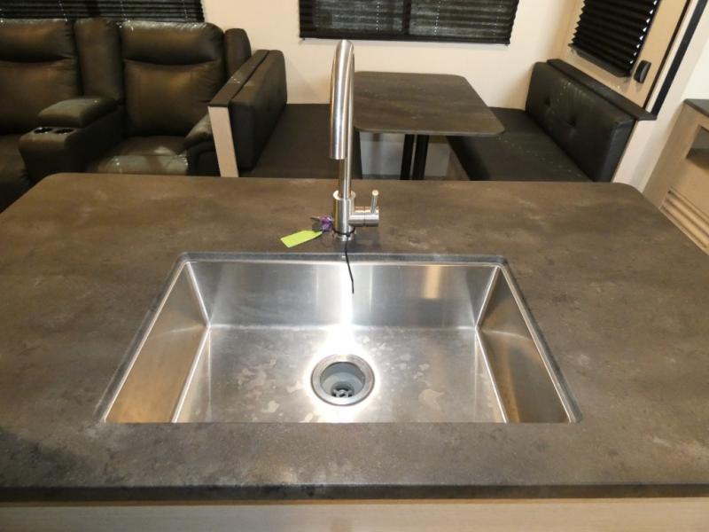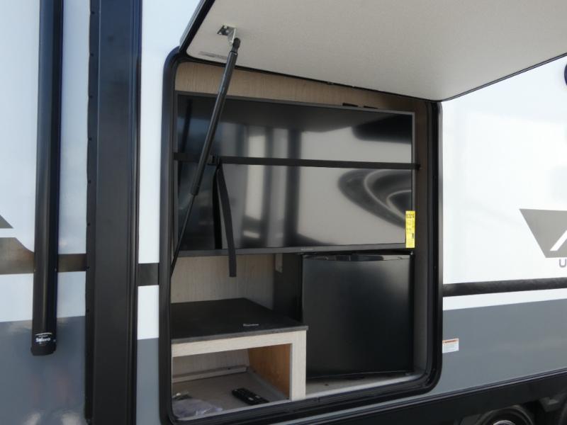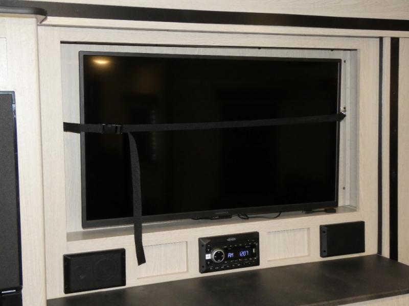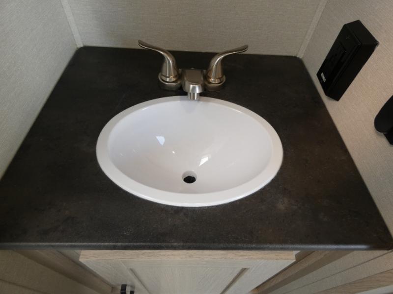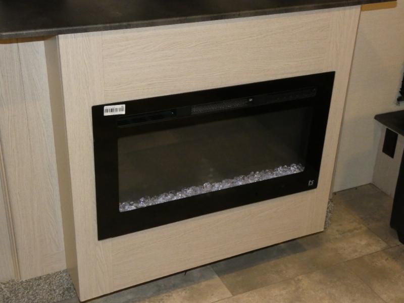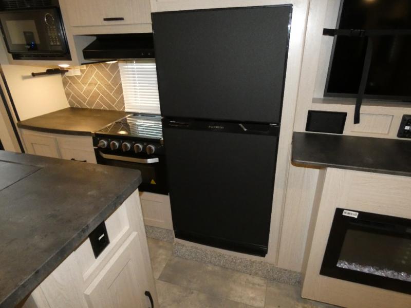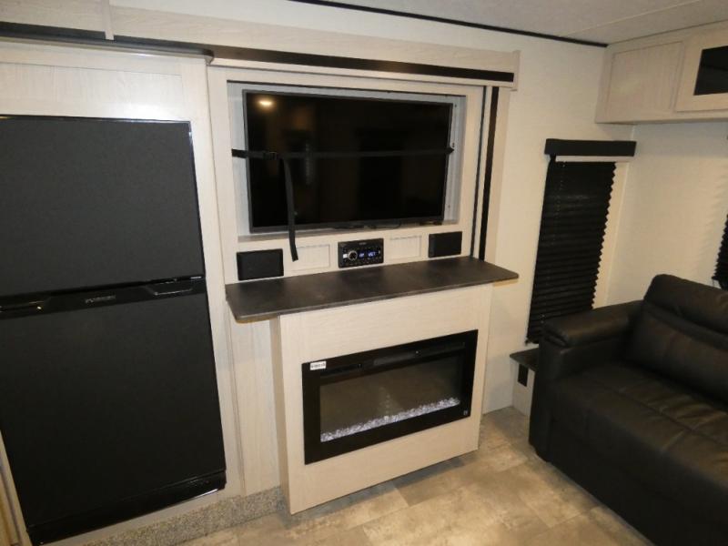 If you like to camp with a more at-home feel then you're going to love this travel trailer. There are dual opposing slides in the living area/kitchen for more interior space, and you can relax on the theater seating across from the entertainment center and fireplace. The kitchen includes an island the chef is sure to love, along with a three burner cooktop, a hutch, and an 8 cu. ft. 12V refrigerator. You will feel right at home in the front private bedroom with a queen bed and dual wardrobes for your clothes. This model also includes an outdoor camp kitchen with an outdoor TV; you can't beat that!