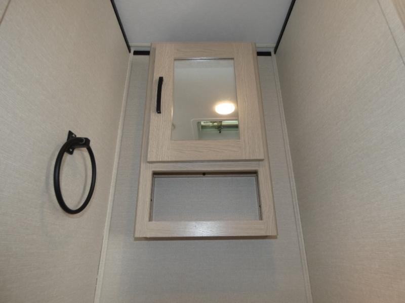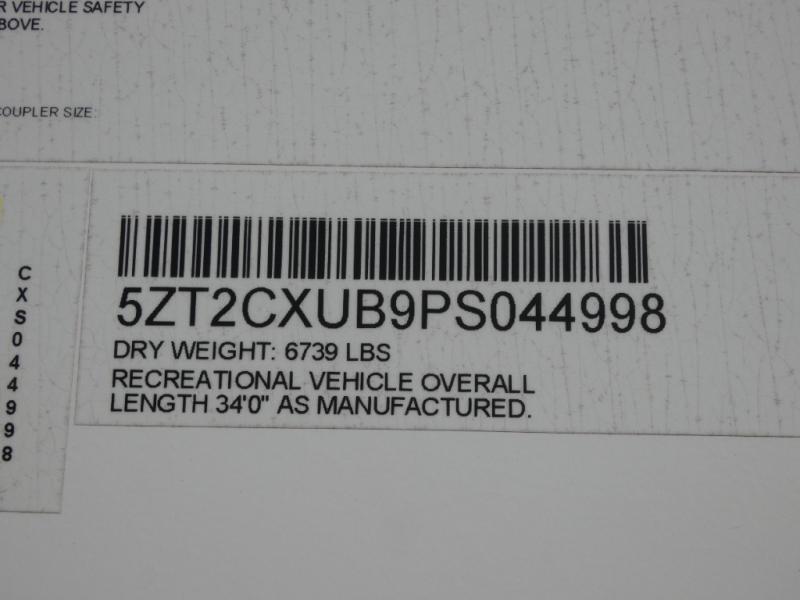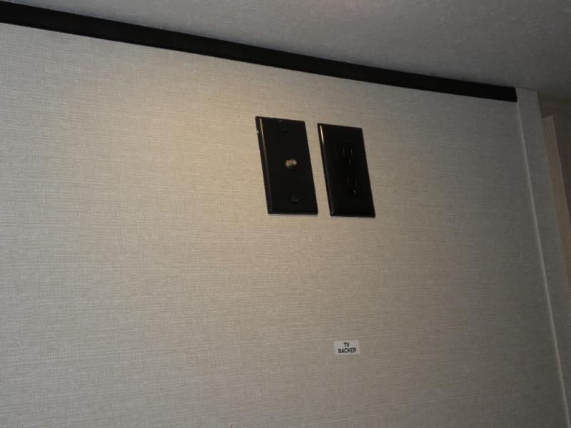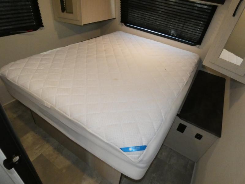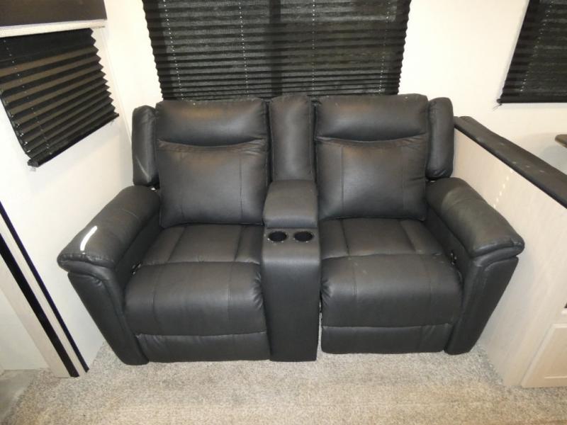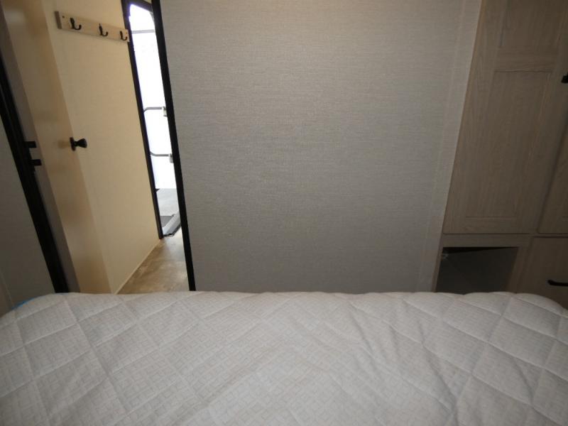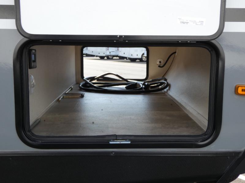 If you like to camp with a more at-home feel then you're going to love this travel trailer. There are dual opposing slides in the living area/kitchen for more interior space, and you can relax on the theater seating across from the entertainment center and fireplace. The kitchen includes an island the chef is sure to love, along with a three burner cooktop, a hutch, and an 8 cu. ft. 12V refrigerator. You will feel right at home in the front private bedroom with a queen bed and dual wardrobes for your clothes. This model also includes an outdoor camp kitchen with an outdoor TV; you can't beat that!