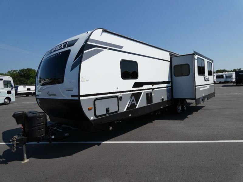 Lightweight living and camping is found with the Apex Ultra-Lite travel trailers by Coachmen. These eco-friendly units are made to last thanks to the Azdel composite sidewalls, the laminated aluminum floor, and the vacuum-bonded laminated crowned roof. Lippert axles and nitrogen filled radial tires make towing easier than ever, plus there is a friction hinge entrance door, a 100-watt solar panel with a 10 Amp control charger, and slam latch baggage door catches for easy unloading. Some of the interior comforts you'll fall in love with are the one-piece seamless edge countertops, the hard valances with night shades throughout, the matte black hardware, and the residential comforter. The Apex Ultra-Lite trailers also include USB ports, a digital TV antenna with cable hook-ups and Wi-Fi capability, and an AM/FM stereo with Bluetooth to ensure you'll never be bored on rainy camp days!