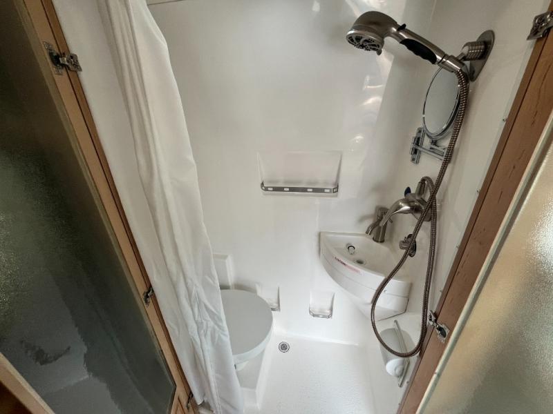 This all-wheel drive coach is perfect for trips near and far. Once you park, you can swivel the captain's seats around to enjoy lunch at the removeable table, and you can freshen up in the convenient wet bath before heading out to stretch your legs. There is an induction cooktop, a round sink, plus a Nova Kool compressor refrigerator for your perishables. The two jump seats and rear power sofa will convert to a comfortable bed at night, and the lagun table in between will allow you to play a game of cards before bed. And don't worry about storage space since this model includes overhead compartments and a wardrobe to keep your clothes wrinkle-free!